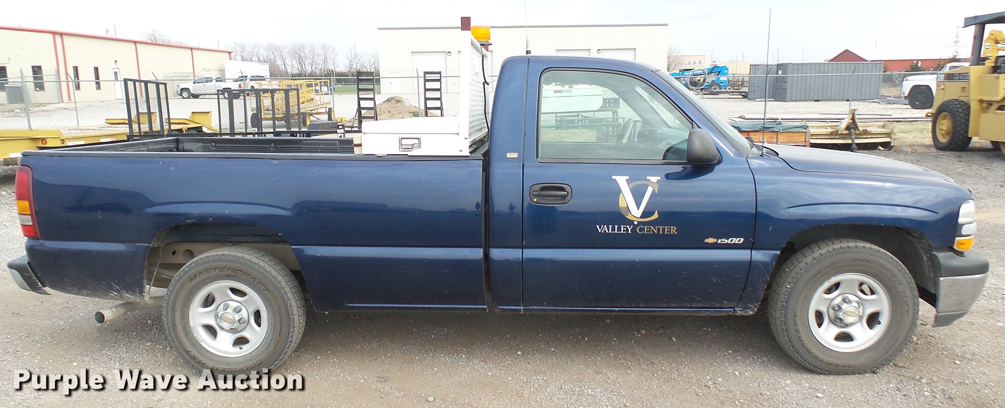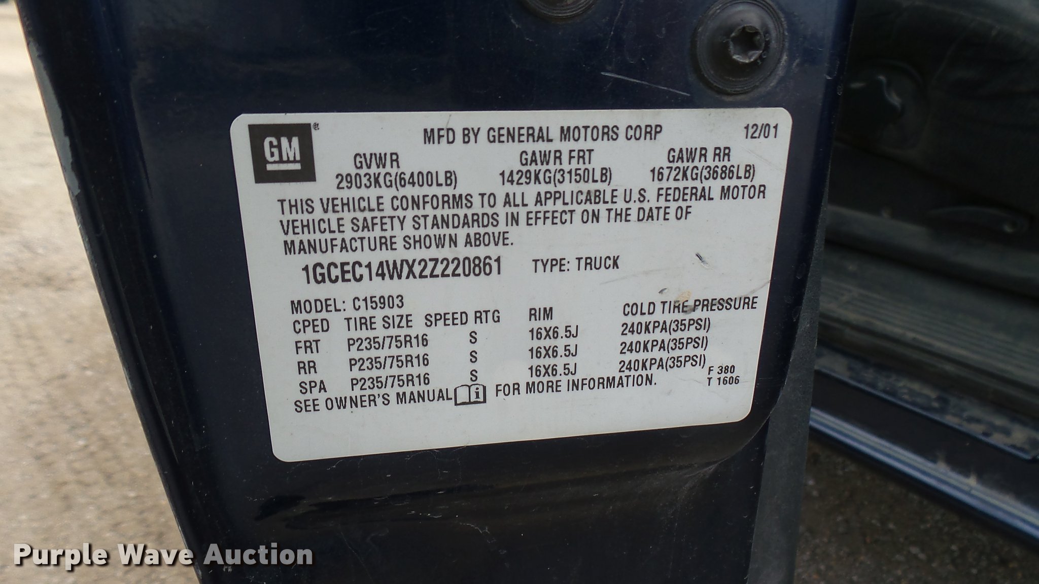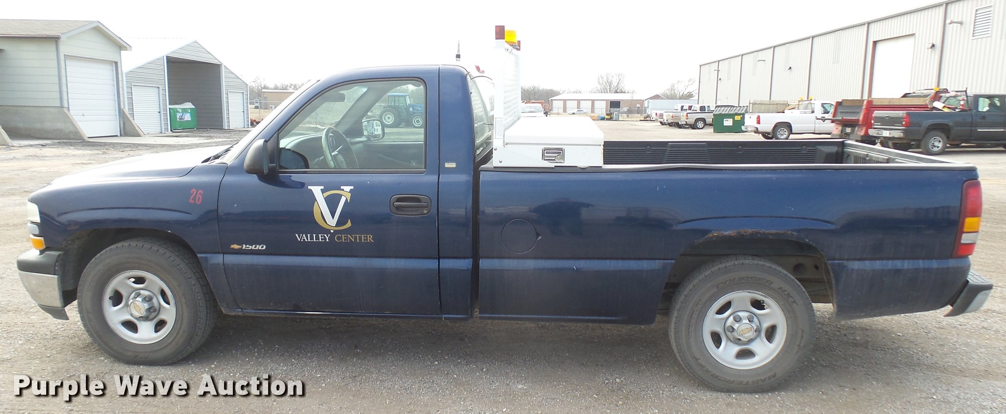 2002 Chevrolet Silverado 1500 pickup truck. 81,117 miles on odometer, 4.3L V6 OHV 12V gas engine, Automatic transmission, AC and heat, Tilt, AM/FM, Manual windows and locks, Cloth interior, Beacon light, Headache rack, Bed liner, Toolbox, Receiver hitch, 245/75R16 tires, Rust. Kansas title. 1GCEC14WX2Z220861. Valley Center Public Works Department. 545 W Clay St. Valley Center, KS 67147