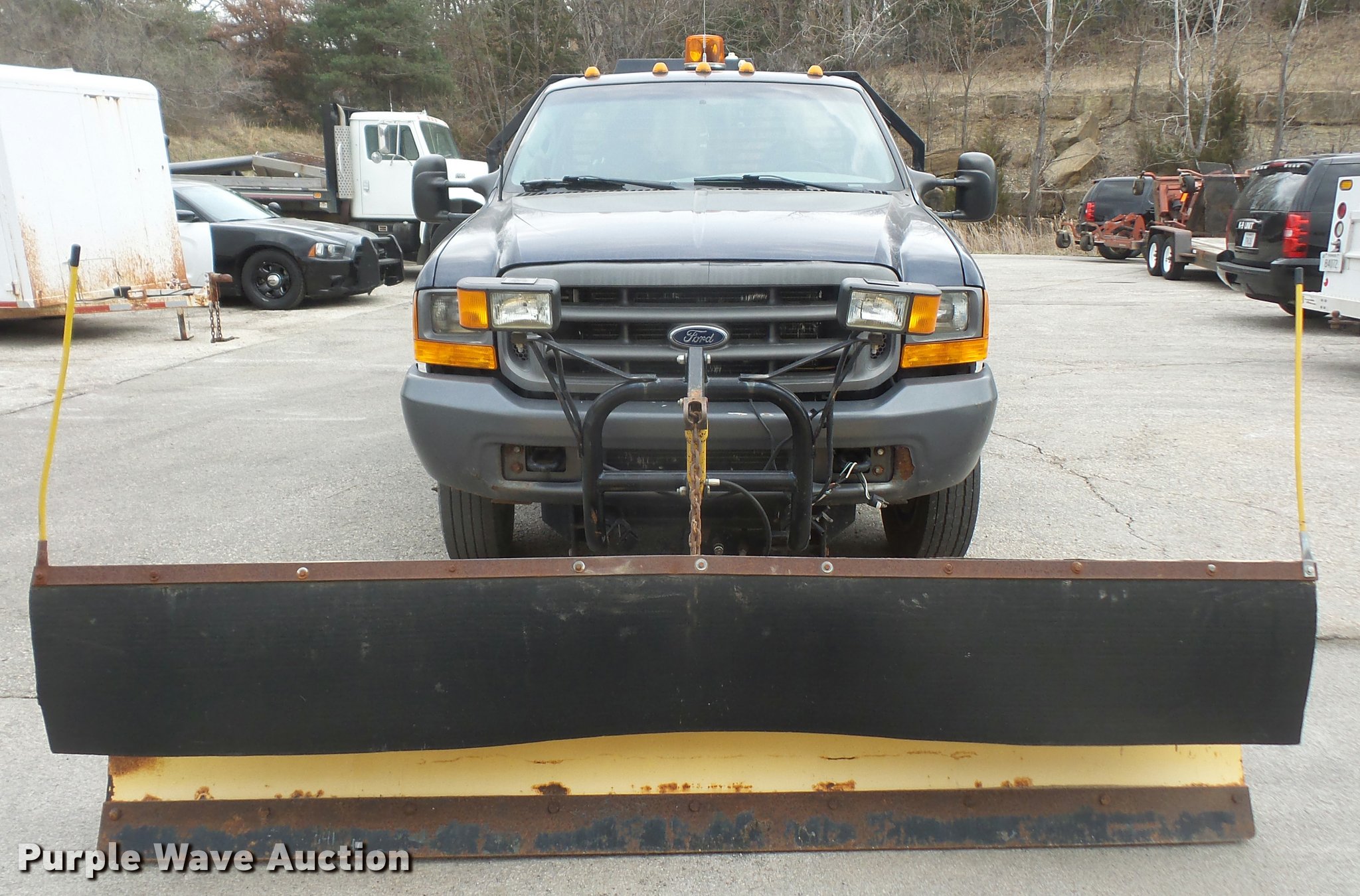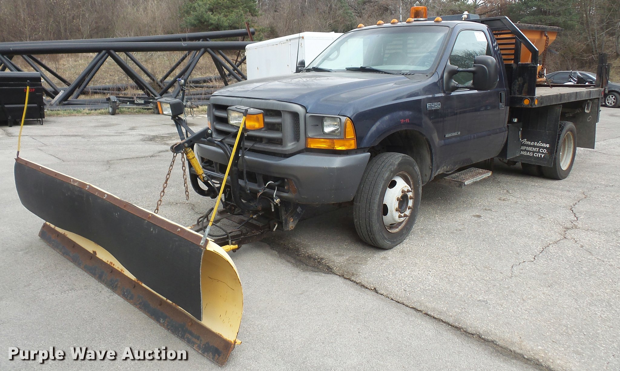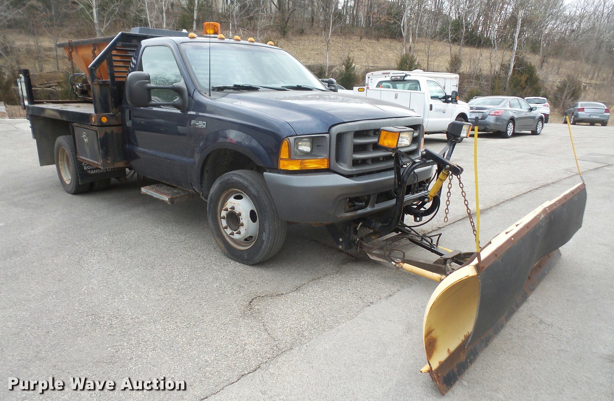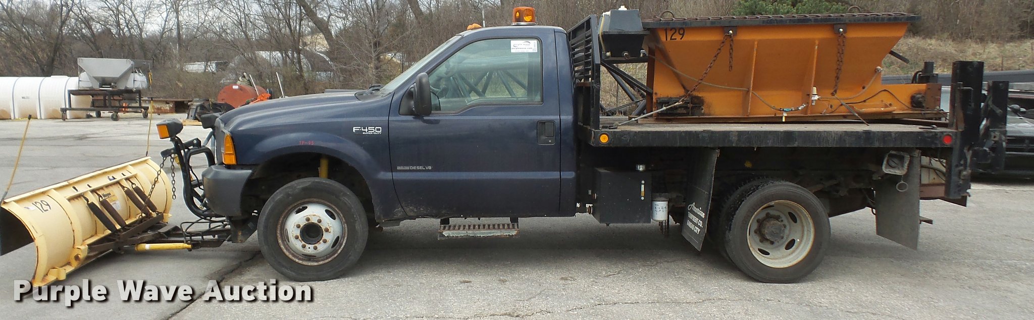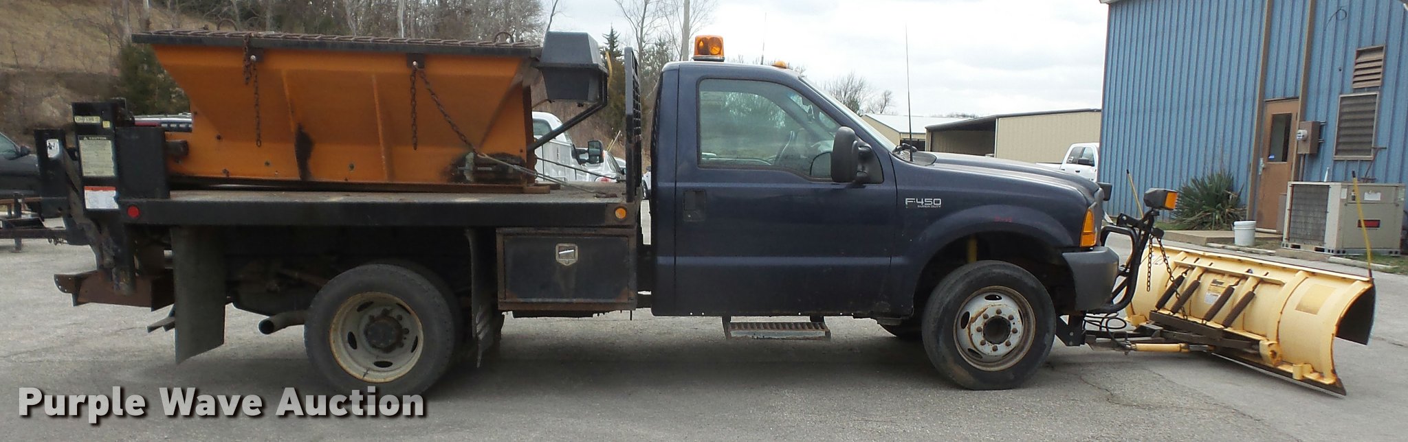 Purple Wave is selling a used Flat Bed Truck in Kansas. This item is a 2001 Ford F450 Super Duty flatbed truck with the following: 43,865 miles on odometer, 7.3L V8 OHV 16V diesel engine, Automatic transmission, AC and heat, AM/FM, Manual windows and locks, Vinyl interior, PTO, 9'L x 96"W flatbed, Toolbox, Meyers snow plow, 8.5'W, FPI fiberglass spreader, Model FSC85-A, Hydraulic driven, Receiver hitch, On-spot chains, 225/70R19.5 tires