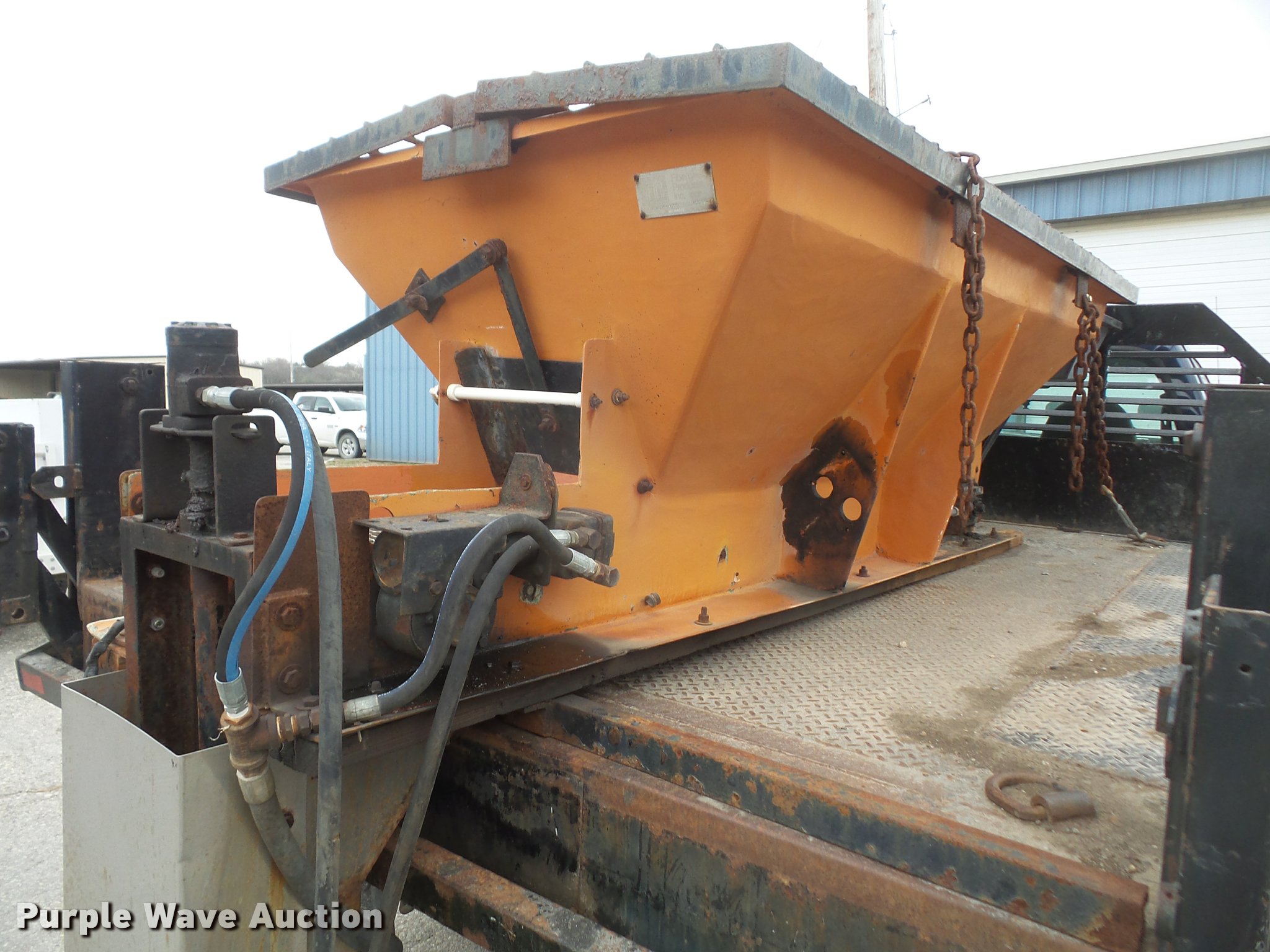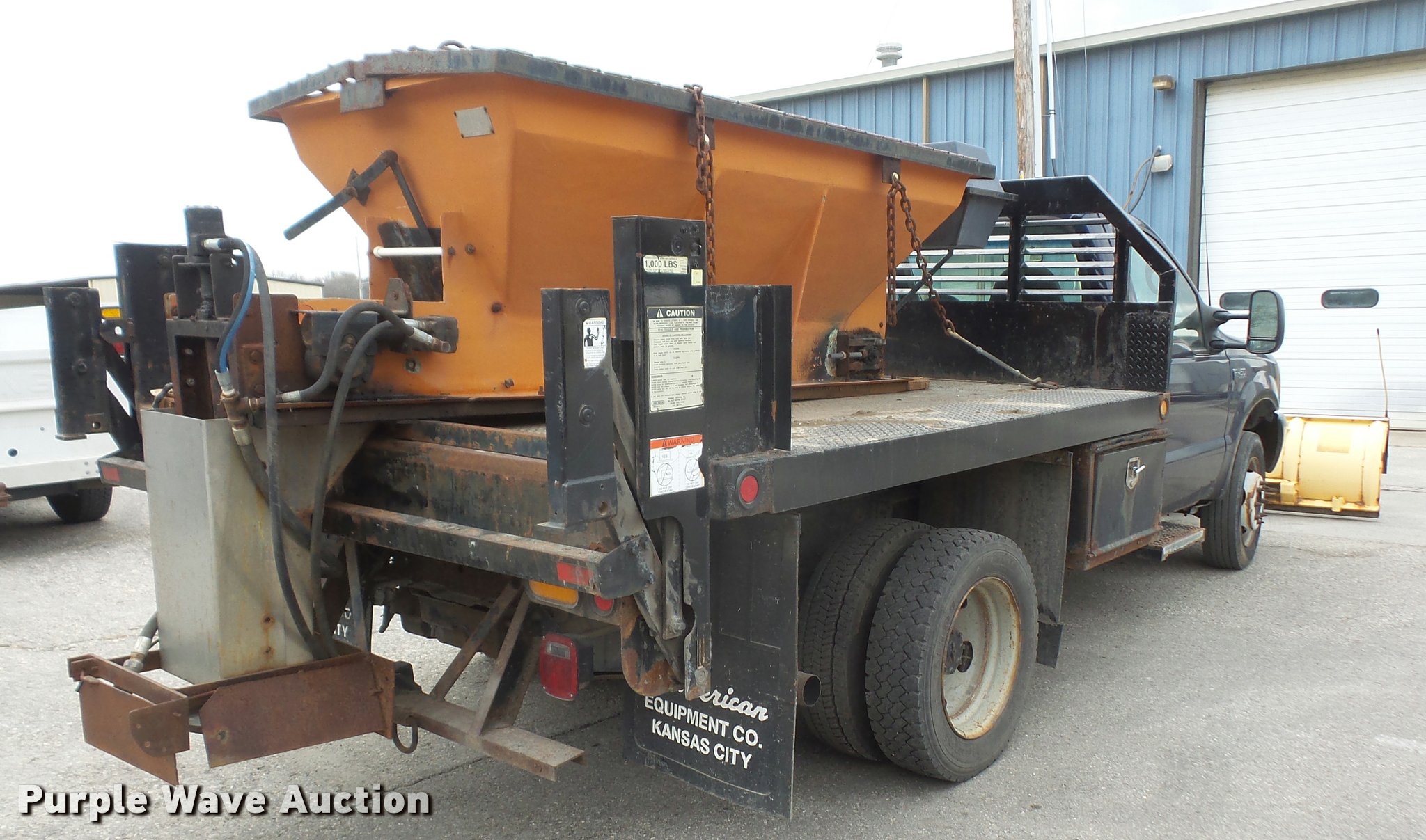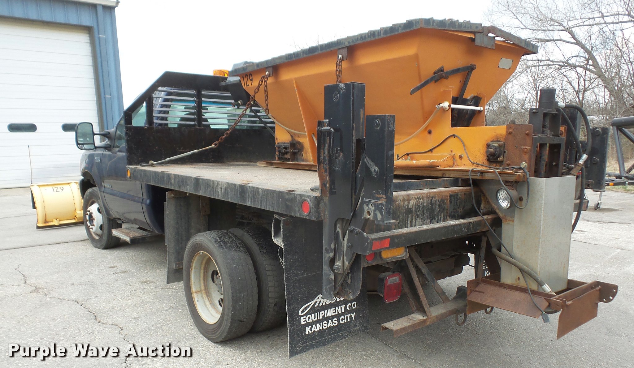 2001 Ford F450 Super Duty flatbed truck. 43,865 miles on odometer, 7.3L V8 OHV 16V diesel engine, Automatic transmission, AC and heat, AM/FM, Manual windows and locks, Vinyl interior, PTO, 9'L x 96"W flatbed Toolbox, Meyers snow plow 8.5'W, FPI fiberglass spreader Model FSC85-A, Hydraulic driven, Receiver hitch, On-spot chains, 225/70R19.5 tires. Kansas title. 1FDXF46F91ED33555. City of Lenexa. 7700 Cottonwood St. Lenexa, KS 66216