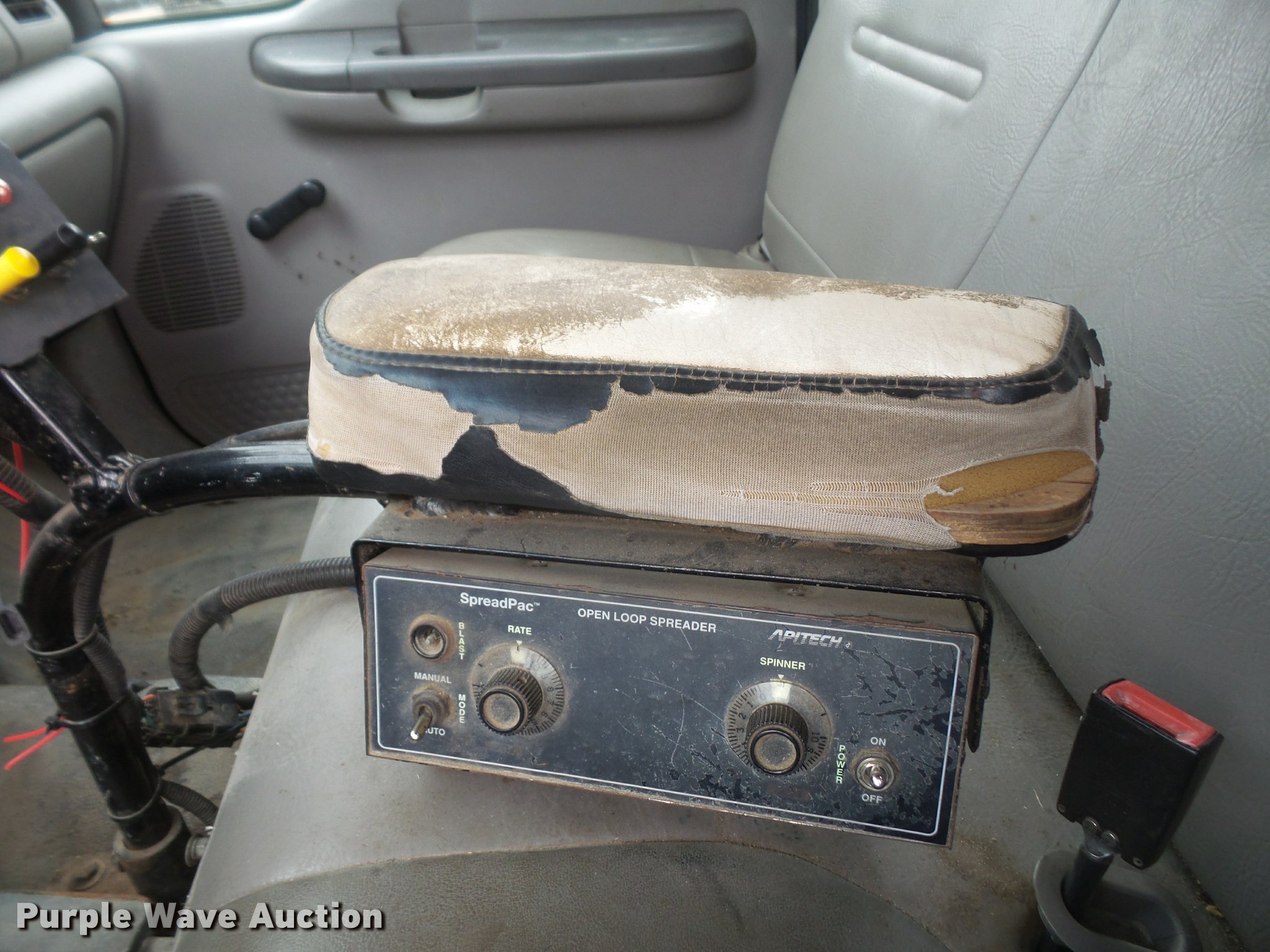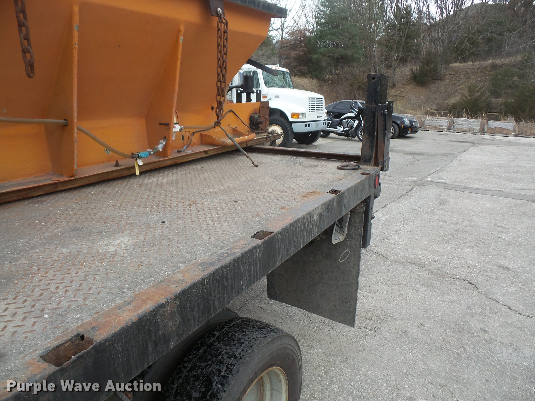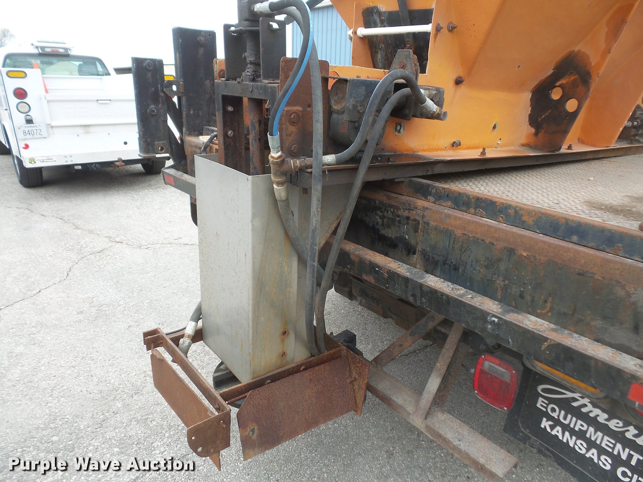 2001 Ford F450 Super Duty flatbed truck. 43,865 miles on odometer, 7.3L V8 OHV 16V diesel engine, Automatic transmission, AC and heat, AM/FM, Manual windows and locks, Vinyl interior, PTO, 9'L x 96"W flatbed Toolbox, Meyers snow plow 8.5'W, FPI fiberglass spreader Model FSC85-A, Hydraulic driven, Receiver hitch, On-spot chains, 225/70R19.5 tires. Kansas title. 1FDXF46F91ED33555. City of Lenexa. 7700 Cottonwood St. Lenexa, KS 66216