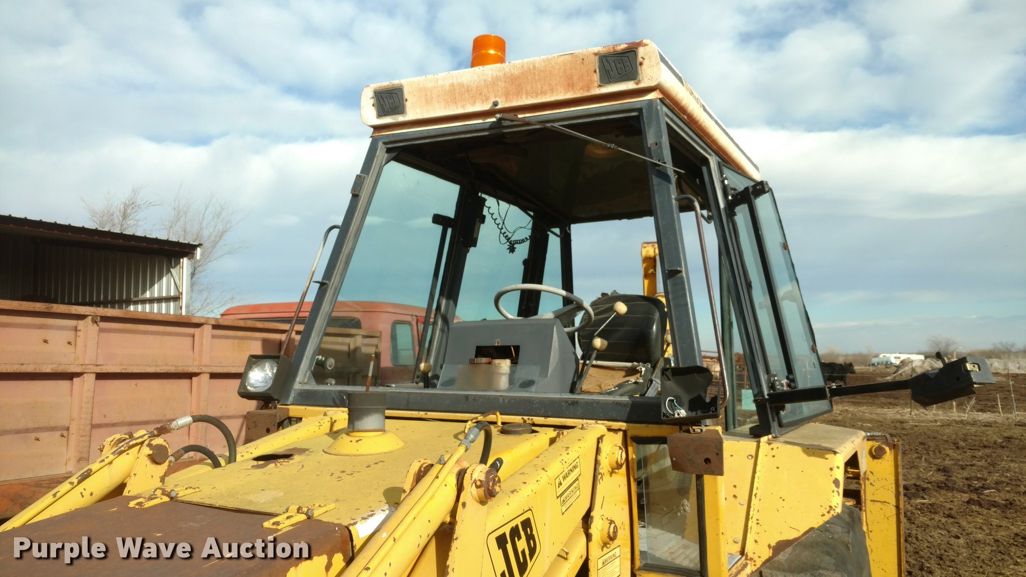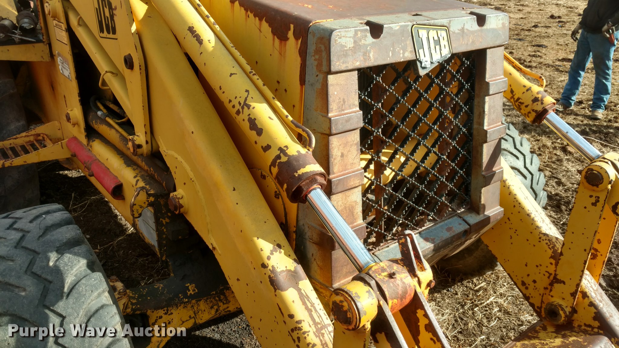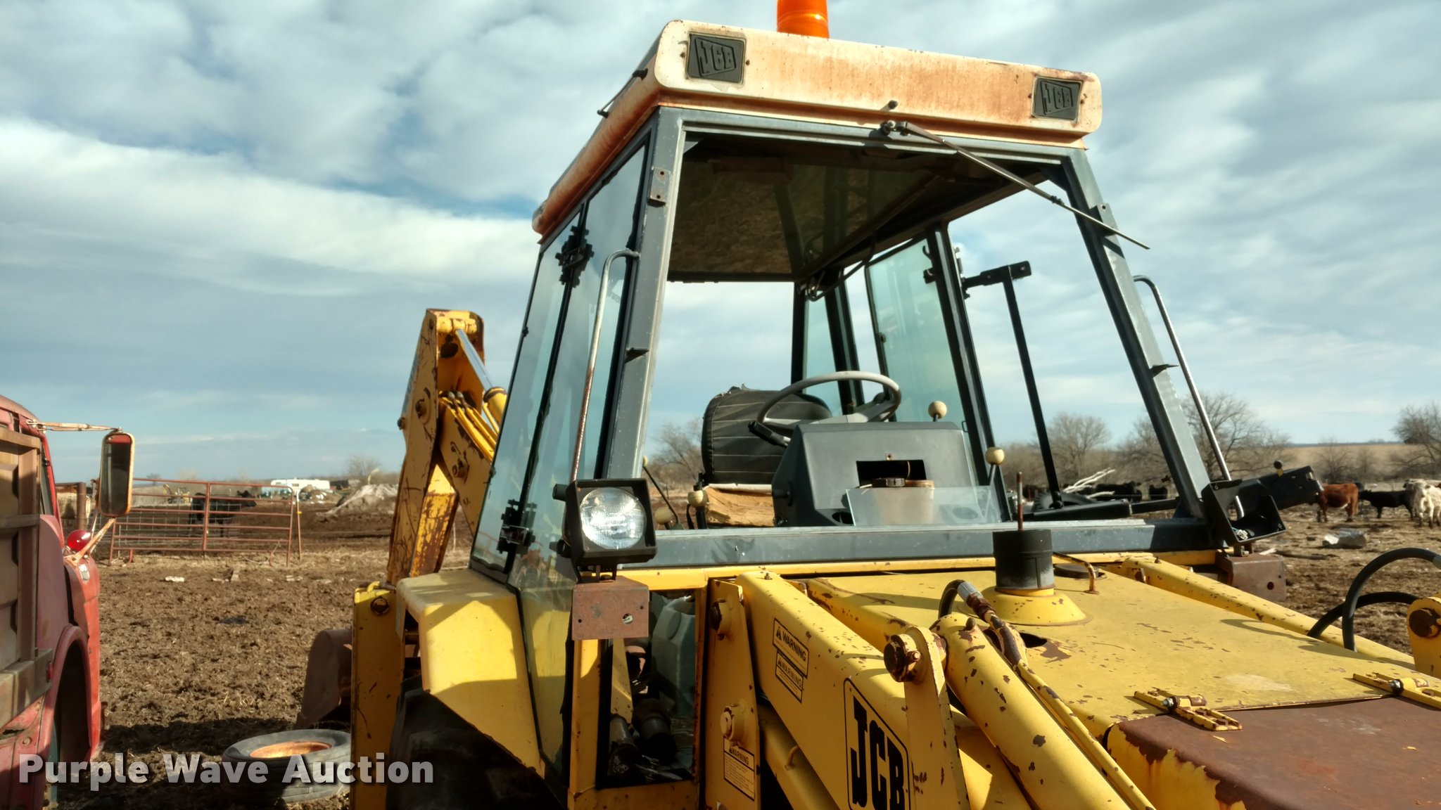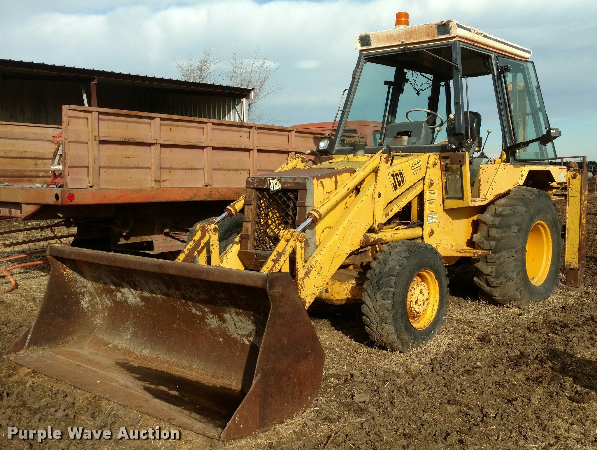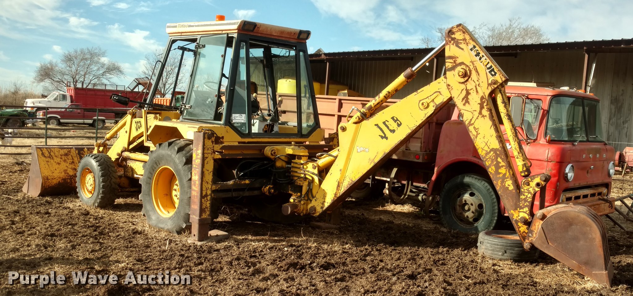 JCB 1400B backhoe. 7,856 hours on meter, Four cylinder turbo diesel engine, Shuttle shift transmission 4F gears, Four wheel drive, Enclosed cab Heat, Wobble stick backhoe controls, 96"W loader bucket, 24"W backhoe bucket Teeth, 14-7.5 front tires, 18.4-24 rear tires, Unit has sat for one year, Serial L-0012140M. Sumner Township. Mayfield, KS 67103