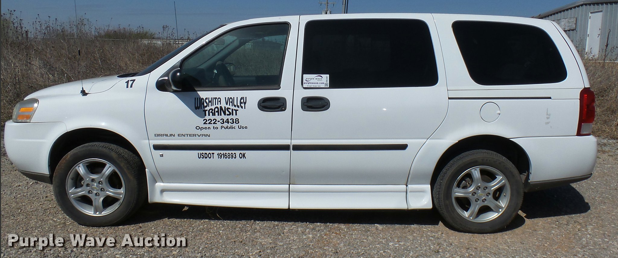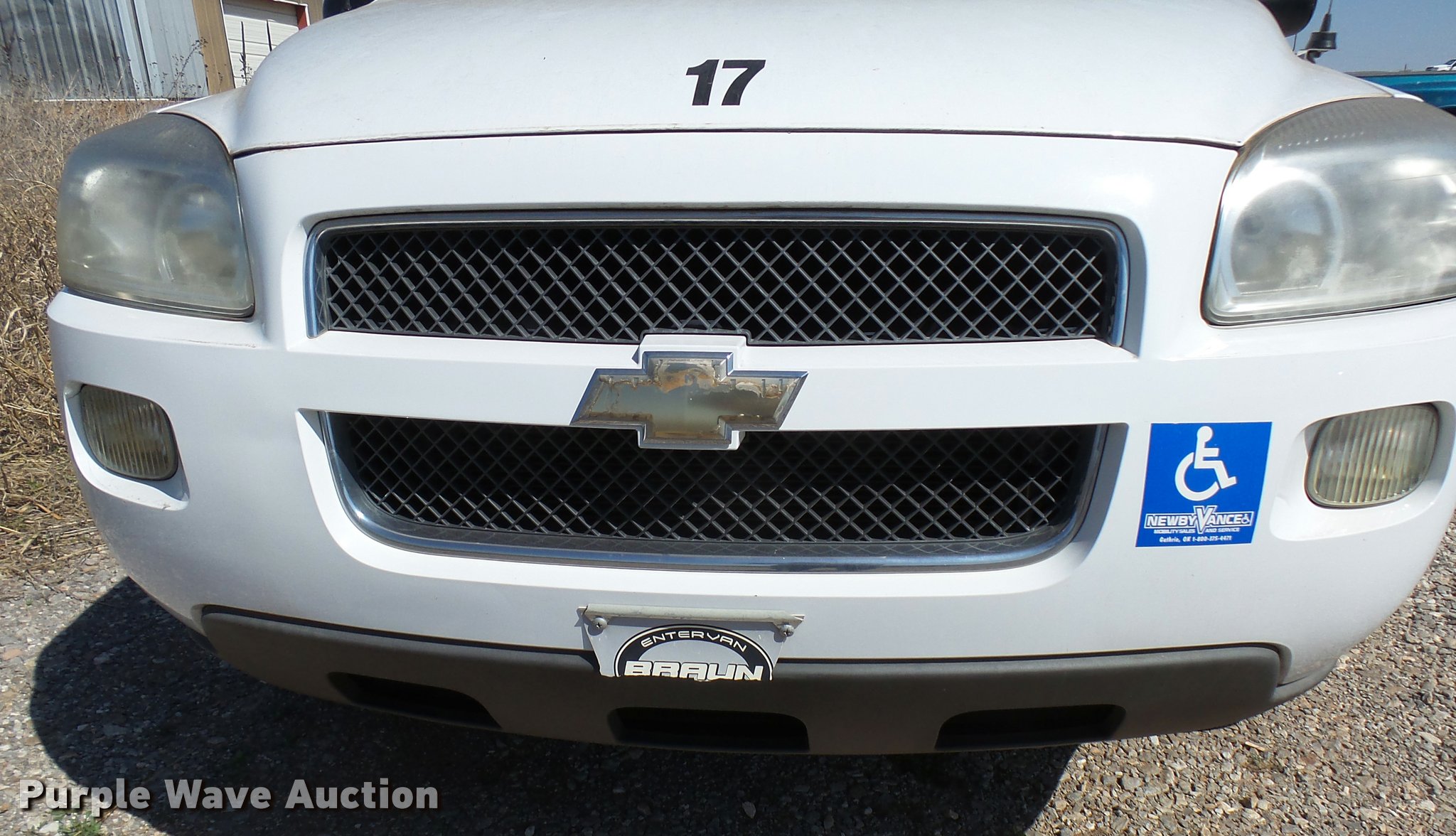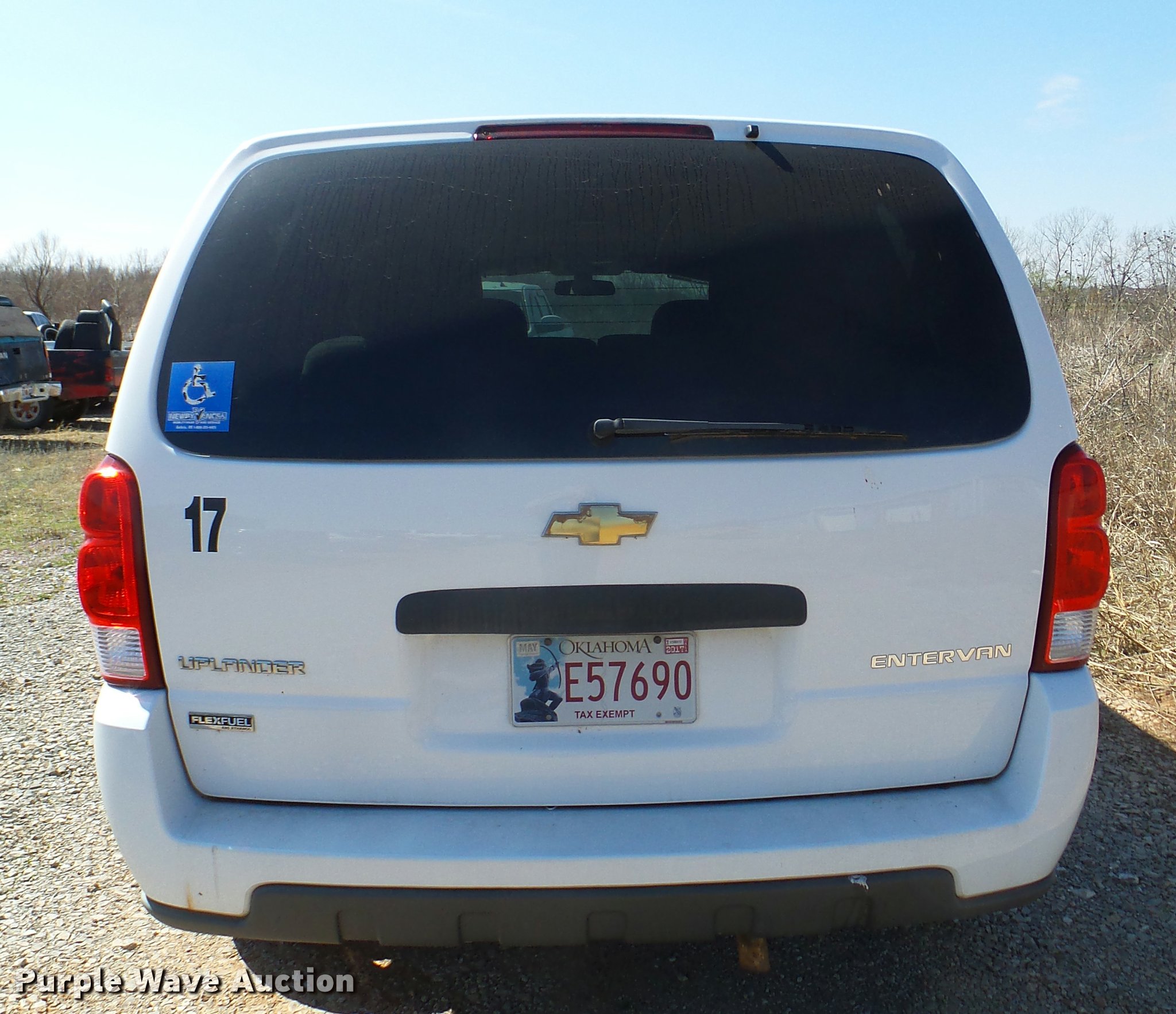 Purple Wave is selling a used Passenger Vehicle in Oklahoma. This item is a 2008 Chevrolet Uplander Cargo van with the following: 82,740 miles on odometer, 3.9L V6 OHV 12V FFV gas engine, Automatic transmission, AC and heat, Tilt, Cruise, AM/FM/CD, Power windows, locks, and mirrors, Cloth interior, Manual wheelchair ramp, Floor tie down notches, Braun body, 225/60R17 tires, Engine ticks, Mechanical issues, Unit# 17