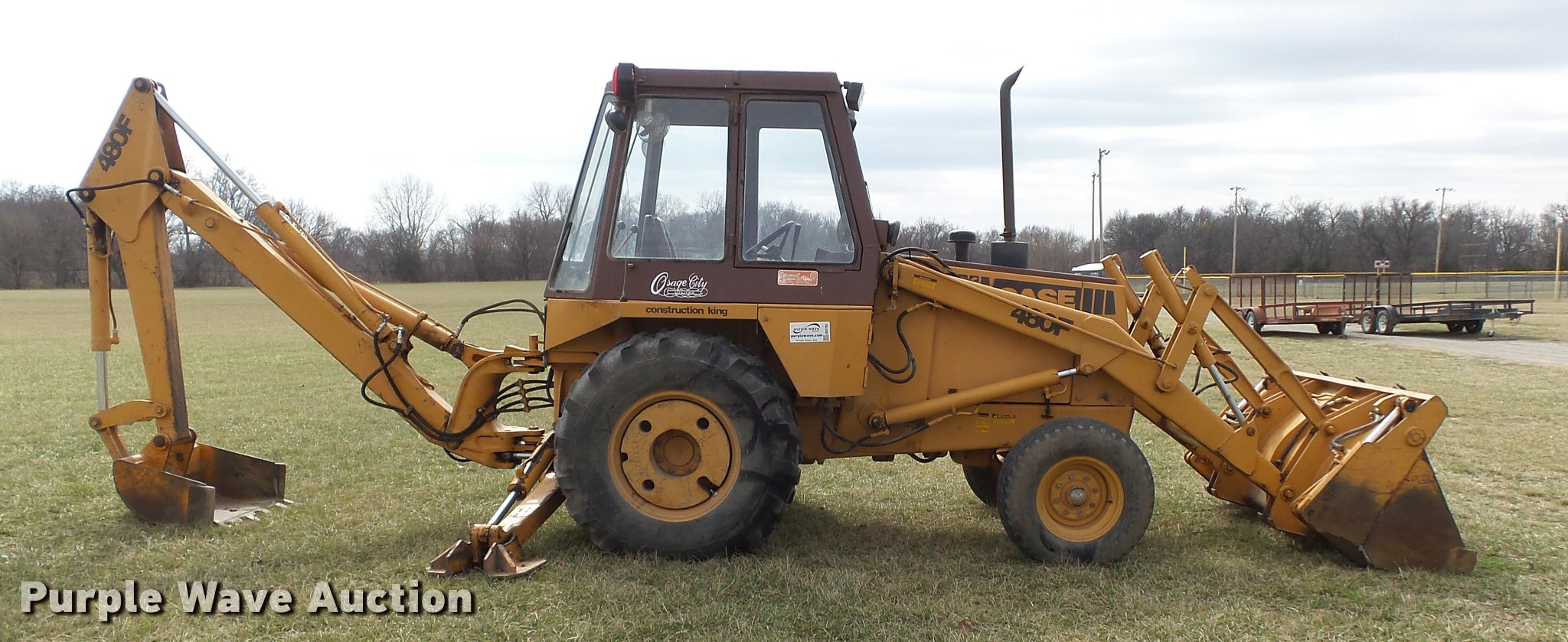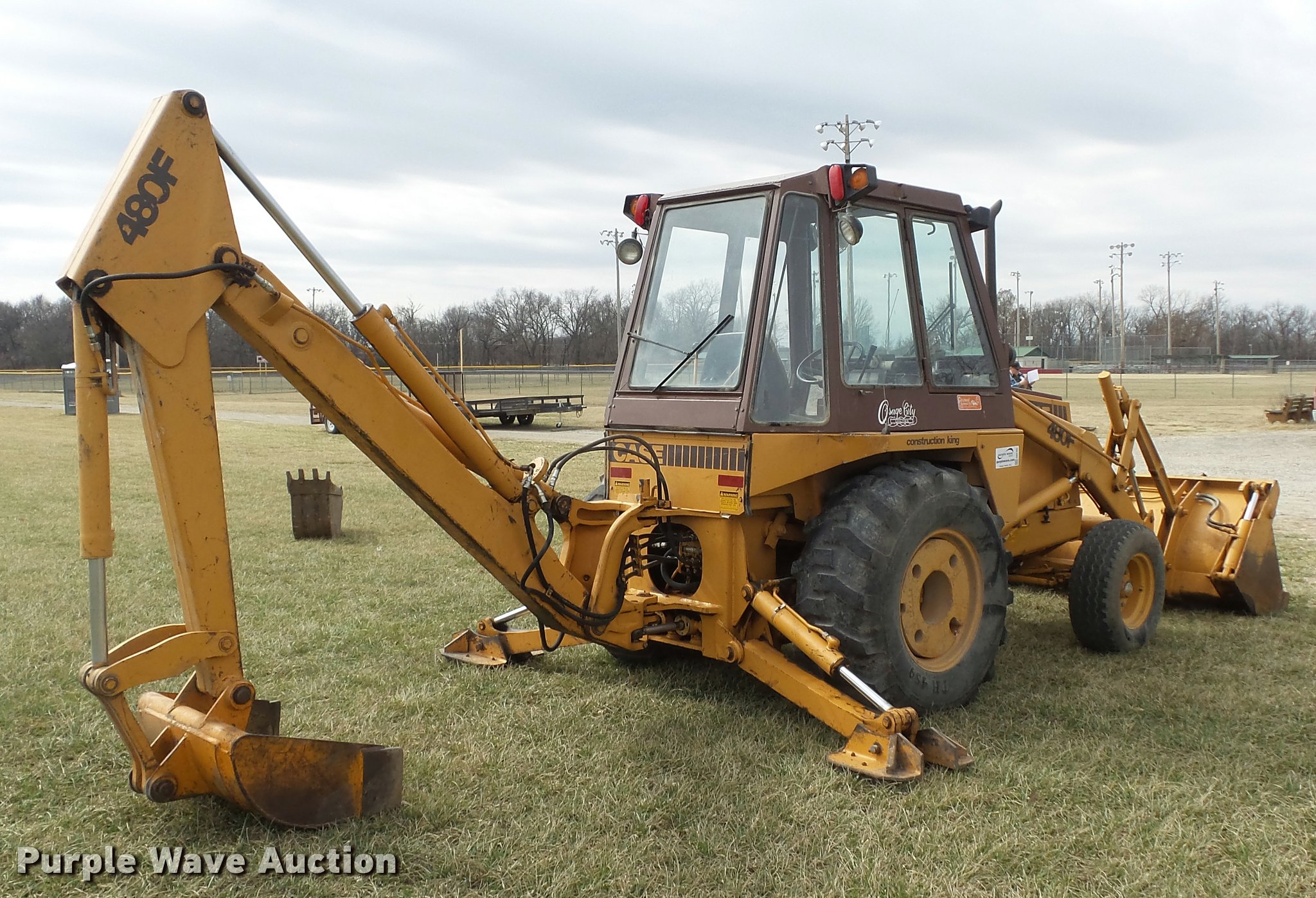 1990 Case 480F Construction King backhoe. 4,982 hours on meter, Case diesel engine, 4F-1R gears, Enclosed cab, Wipers, Four stick backhoe controls, Front and rear work lights, Block heater, Case MD four-in-one loader bucket 80"W, Weld-on cutting edge, Serial JJG0080949, 12'L reach, Cemetary Style backhoe bucket 32"W, Weld-on cutting edge, (6) teeth, 16"W backhoe bucket 16"W, (4) weld-on teeth, Rear stabilizers, 11L-16 front tires, 17.5L-24 rear tires, Serial JJG0004540. Osage City, KS 66523