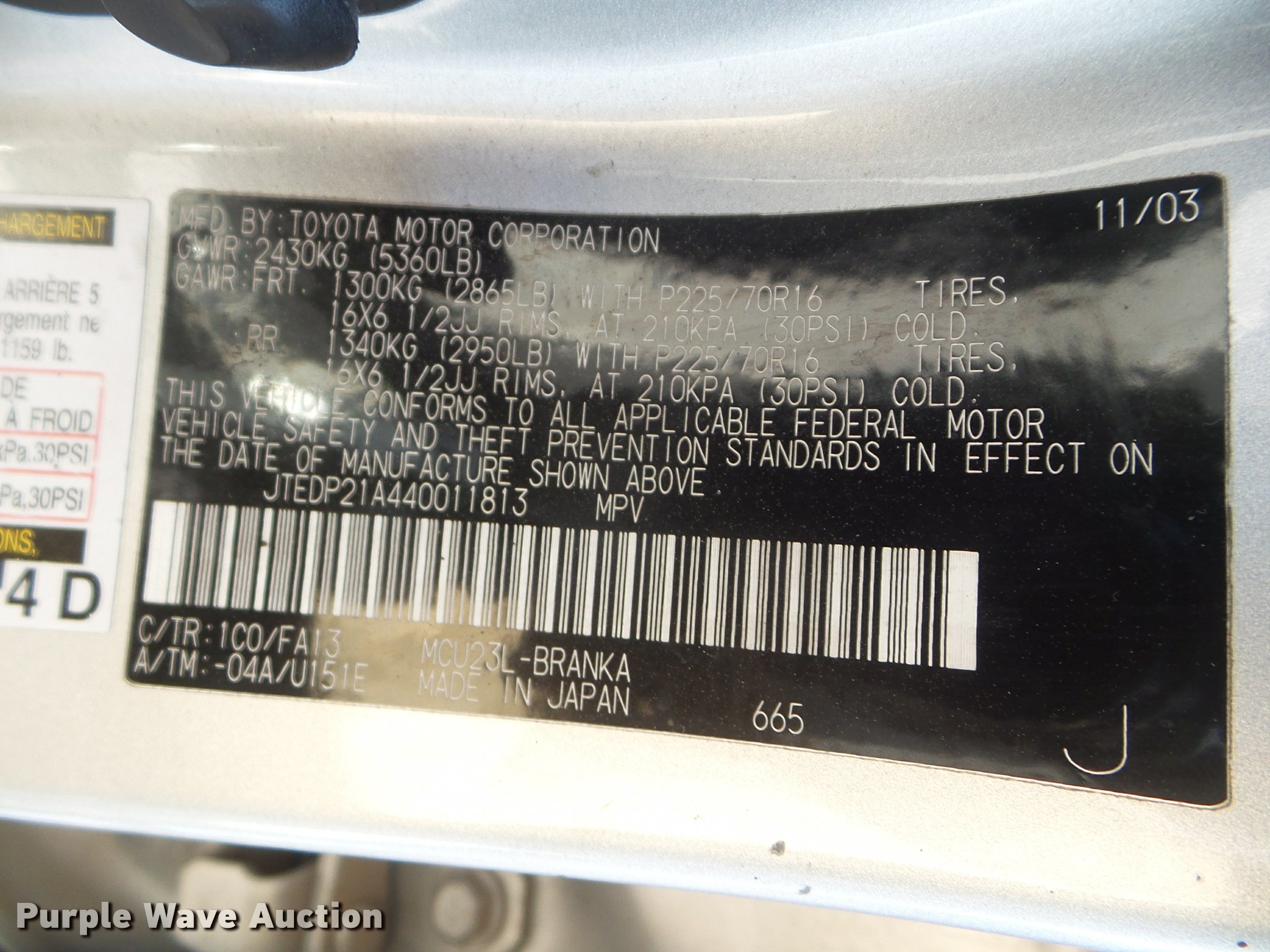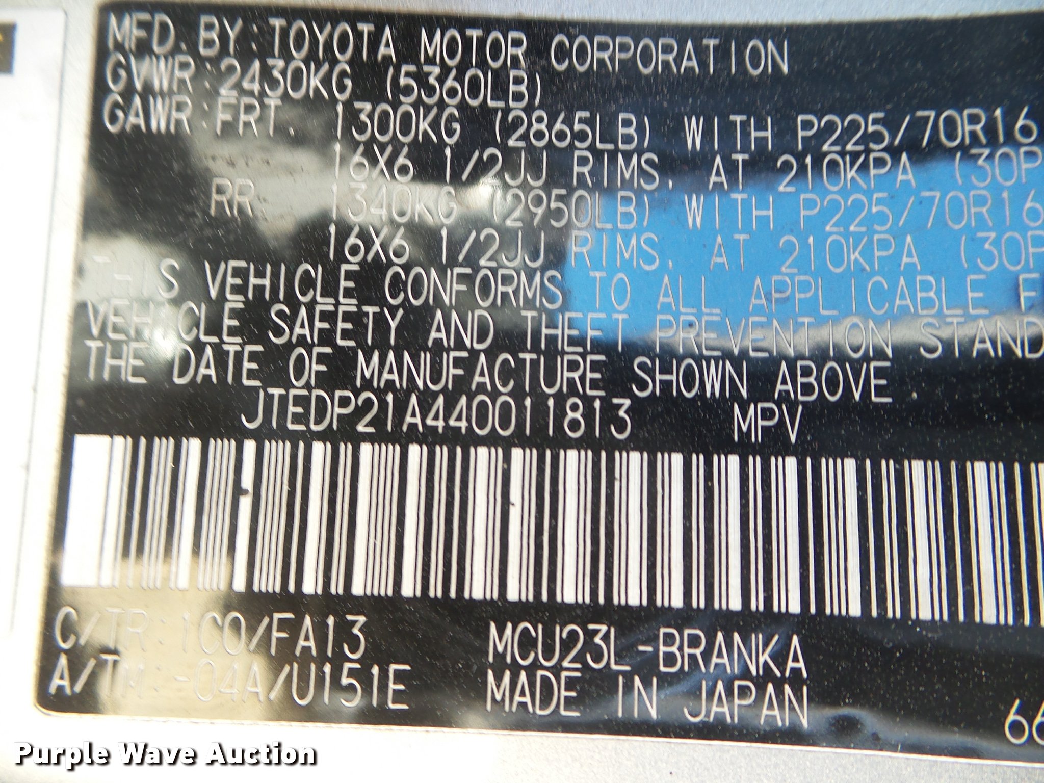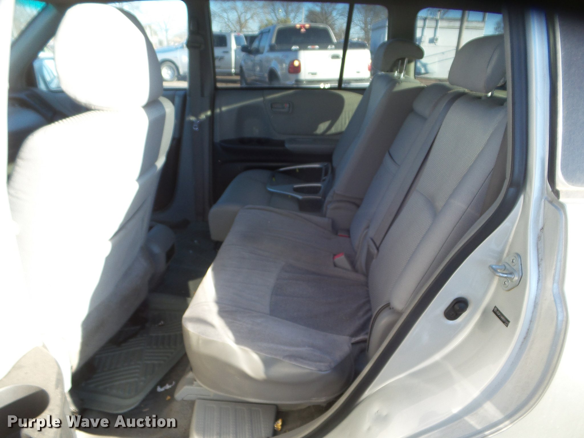 Purple Wave is selling a used Passenger Vehicle in Kansas. This item is a 2004 Toyota Highlander SUV with the following: 396,976 miles on odometer, 3.3L V6 DOHC 24V gas engine, Automatic transmission, AC and heat, Tilt, Cruise, AM/FM/CD, Power windows, locks, mirrors, and seat, Cloth interior, Fog lights, 225/70R16 tires, No front passenger seat