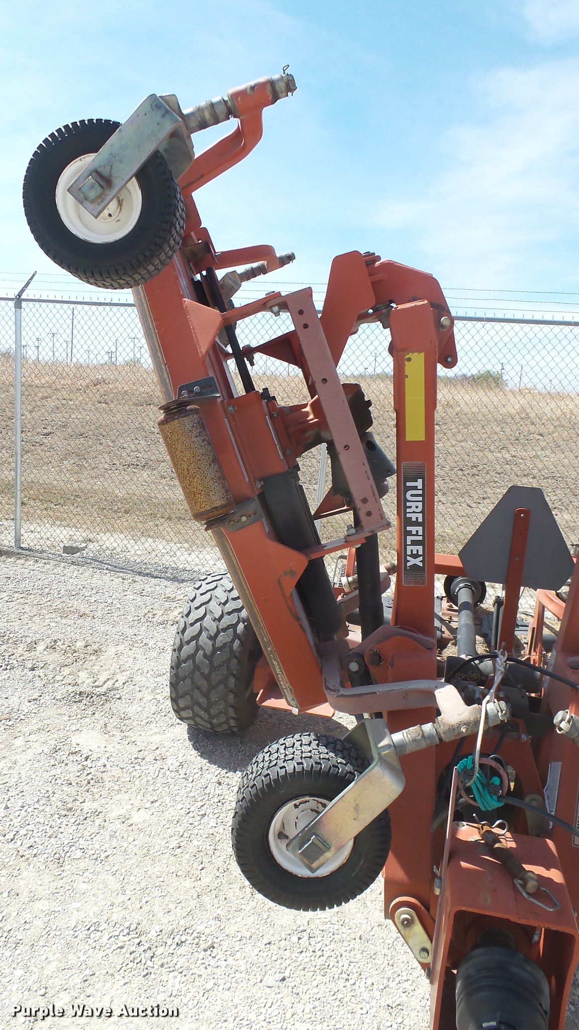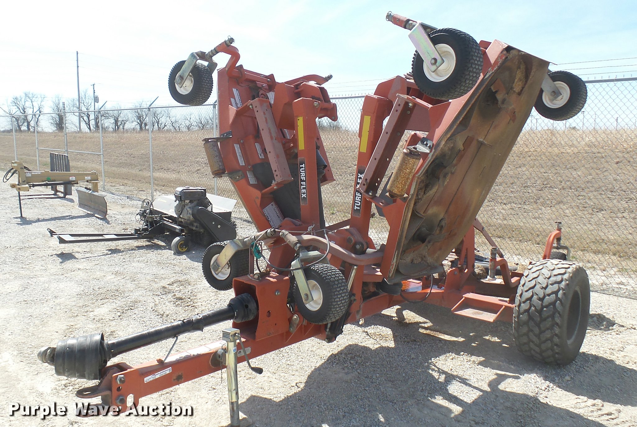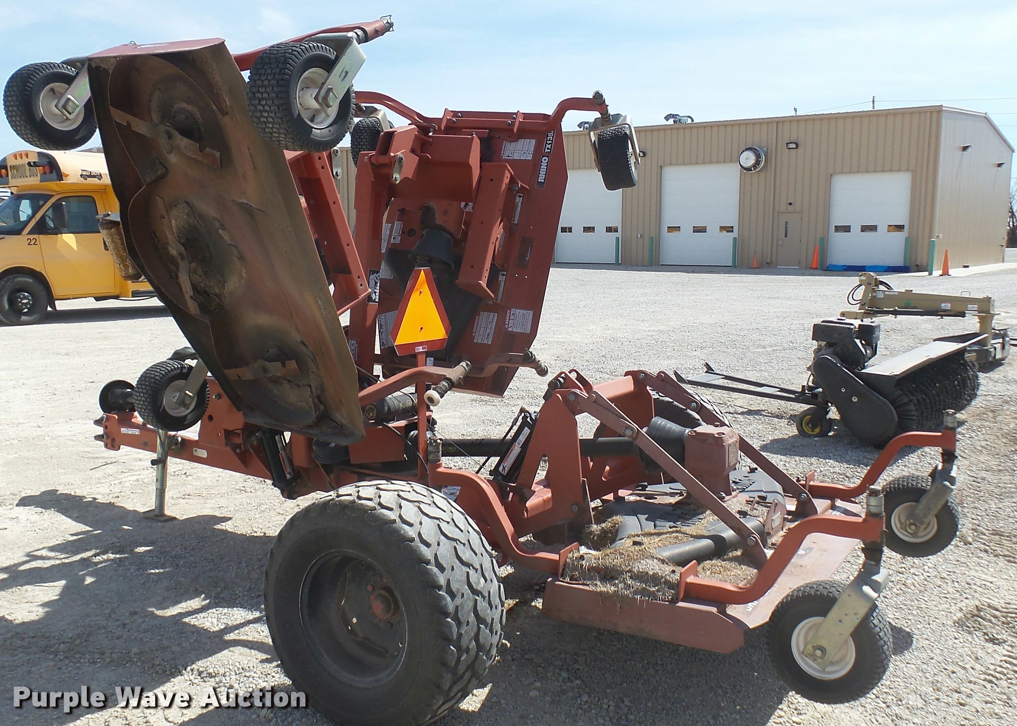 Purple Wave is selling a used Mower, Cutter, Shredder in Kansas. This item is a Rhino TX135A Turfflex batwing rotary mower with the following: 15'W, Hydraulic lift and fold, 540 PTO, Pin hitch, 31x13.50-15 transport tires