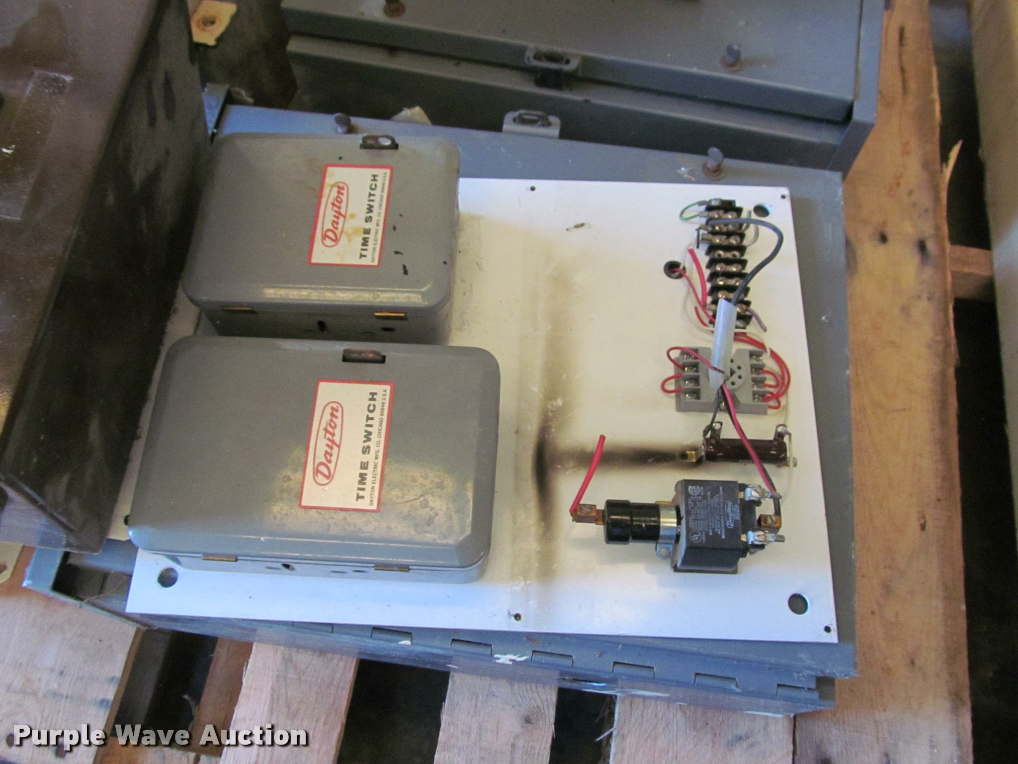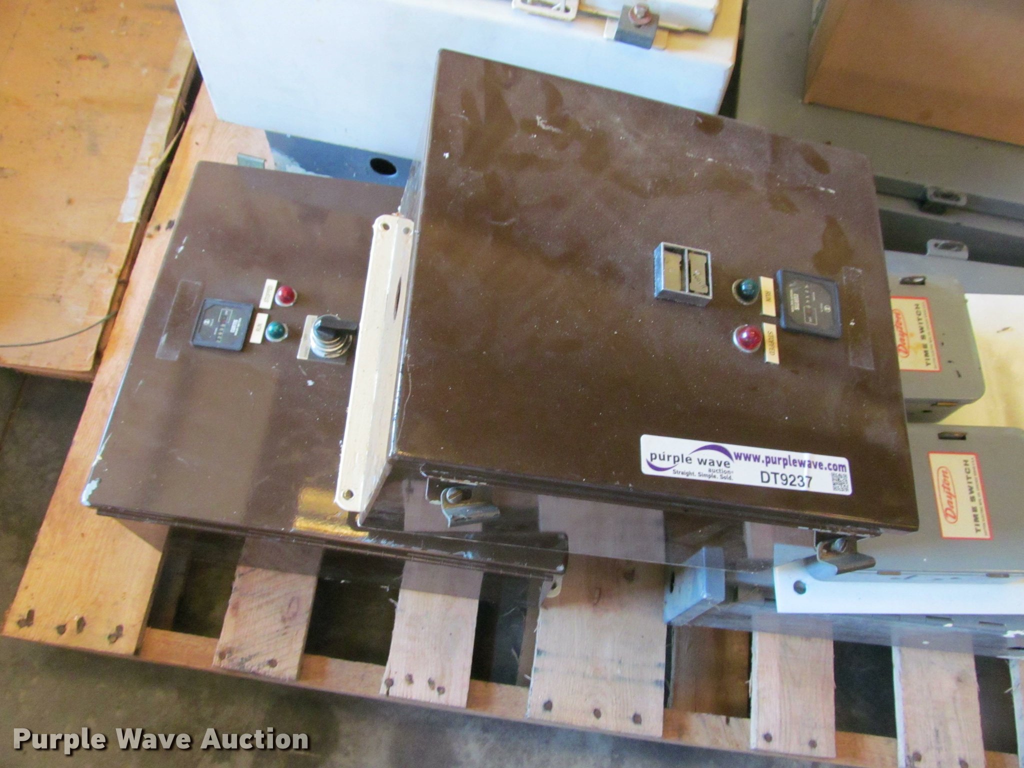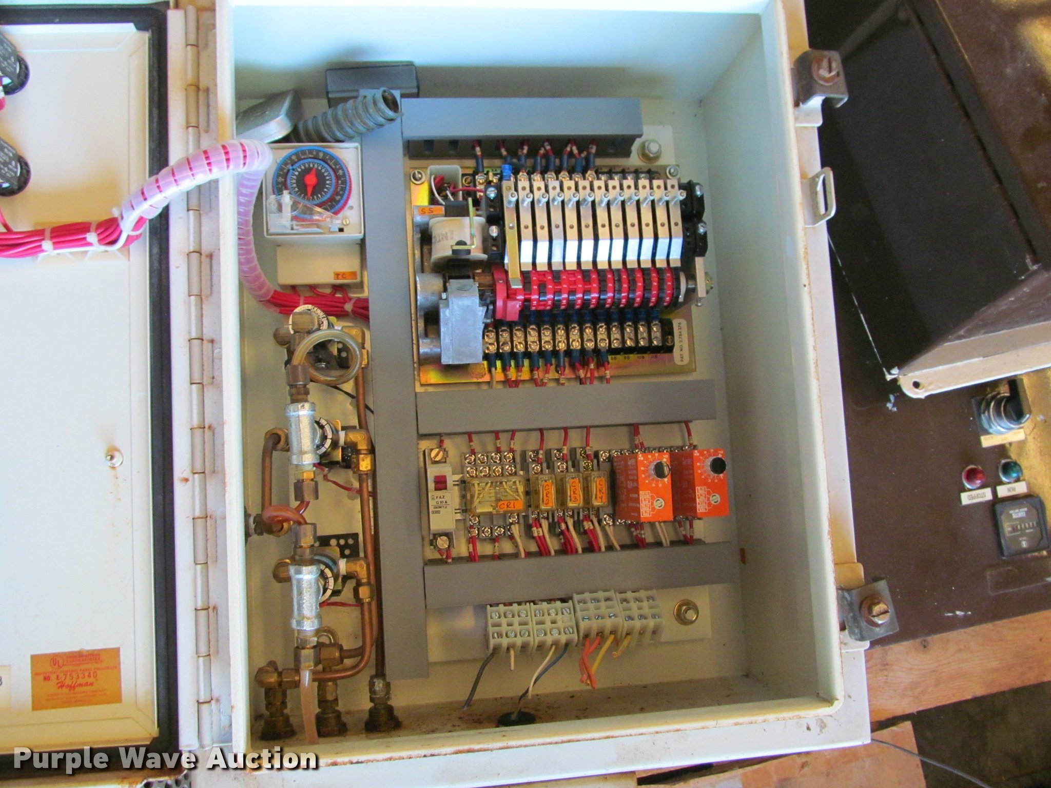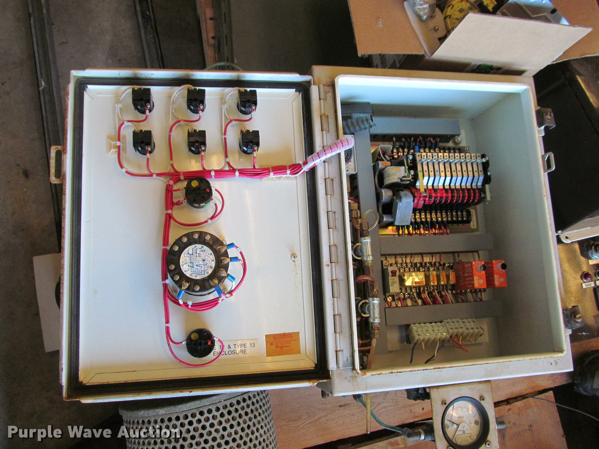 Purple Wave is selling a used Building Materials in Kansas. This item is a Electrical components with the following: Industrial control panel, Timer, PSID gauge, No E-753340, Pressure gauges, Assorted timer panels, Assorted motor control boxes