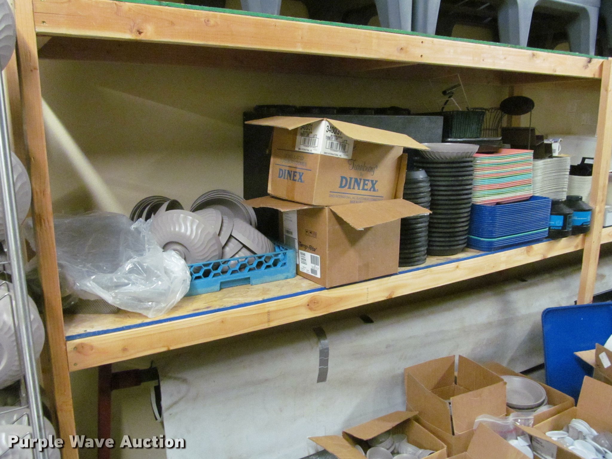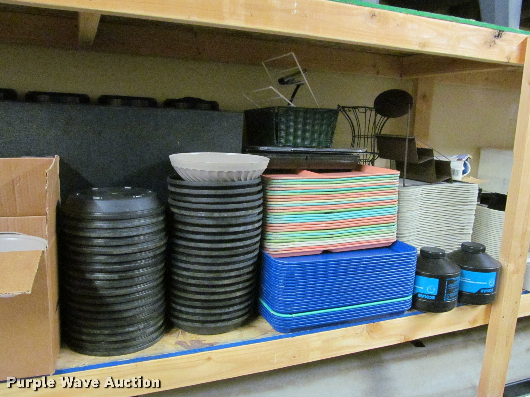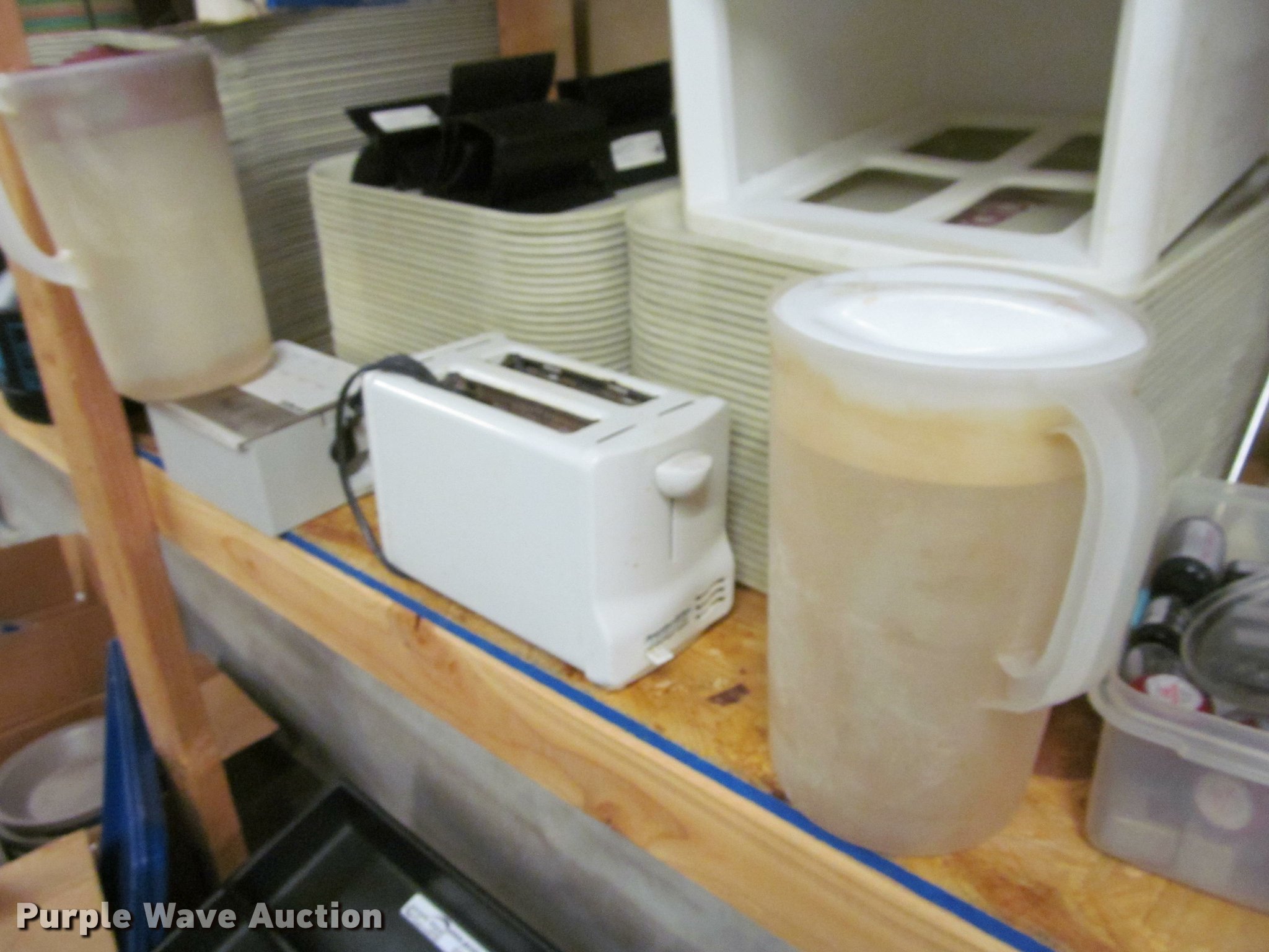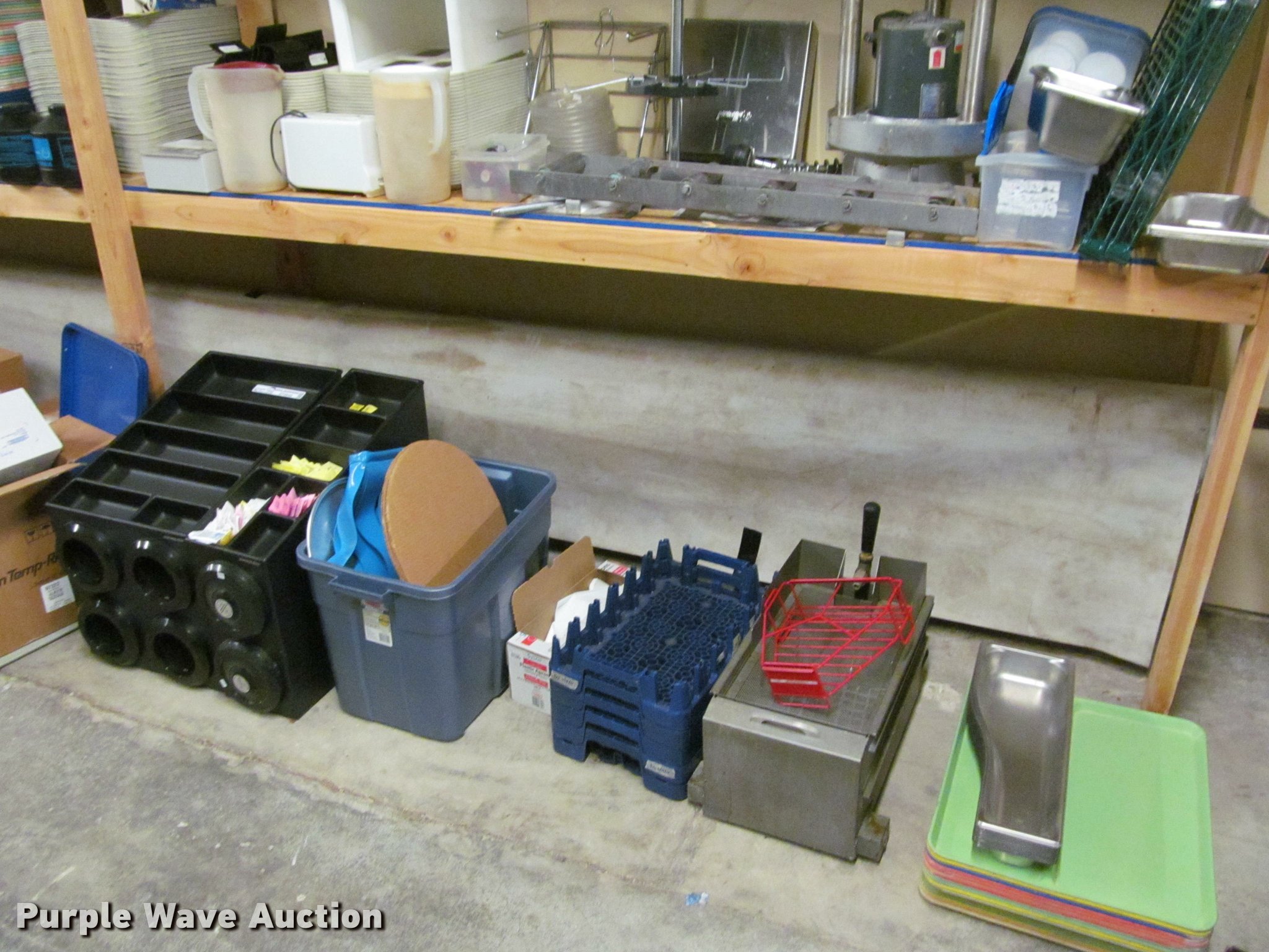 Purple Wave is selling a used Restaurant Equip. in Kansas. This item is a Restaurant equipment with the following: Plates, Bowls, Cups, Lids, Trays, (3) toasters, Cup dispenser, Bowl rack, Rolling, Pitchers, Fryer, Glass vases, Hobart FD3/150 garbage disposals, Wood storage rack, White vinyl roll not included