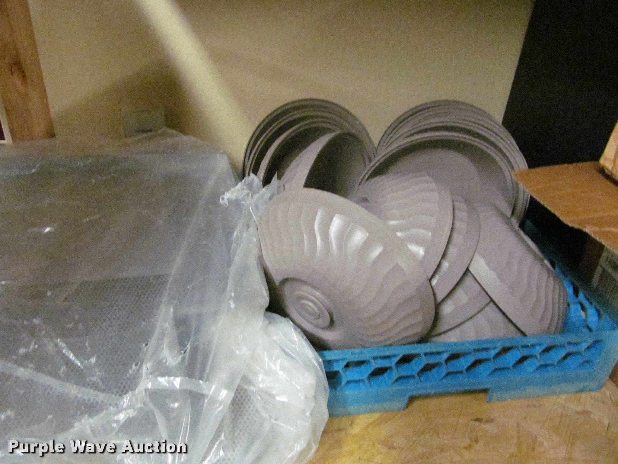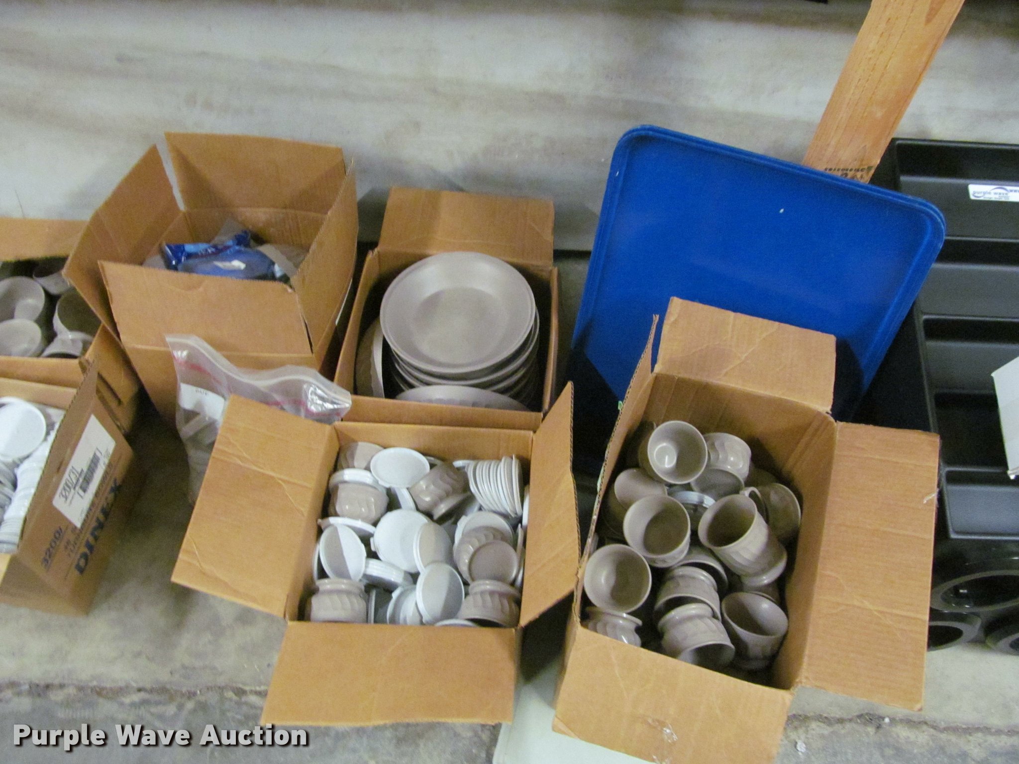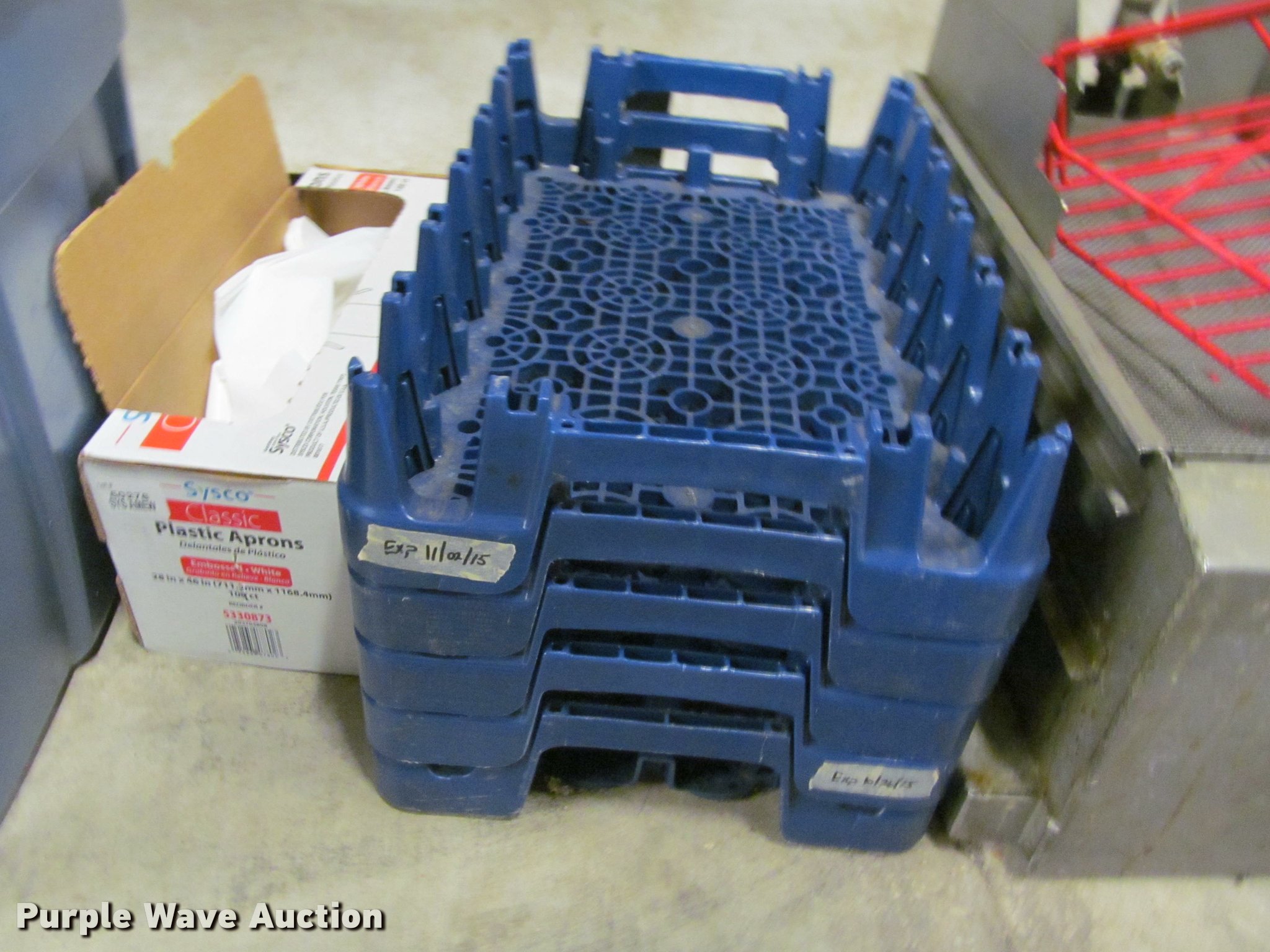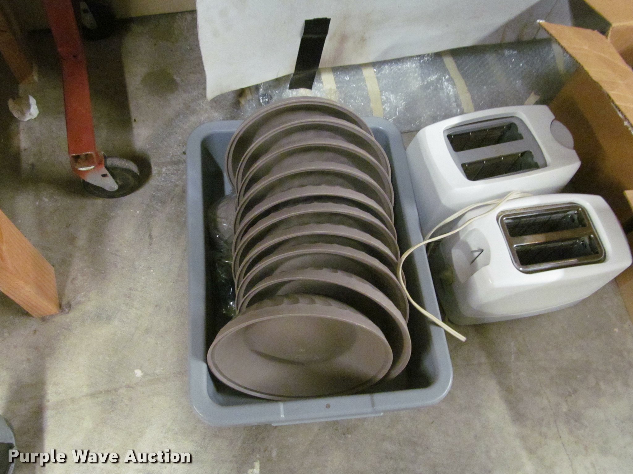 Purple Wave is selling a used Restaurant Equip. in Kansas. This item is a Restaurant equipment with the following: Plates, Bowls, Cups, Lids, Trays, (3) toasters, Cup dispenser, Bowl rack, Rolling, Pitchers, Fryer, Glass vases, Hobart FD3/150 garbage disposals, Wood storage rack, White vinyl roll not included