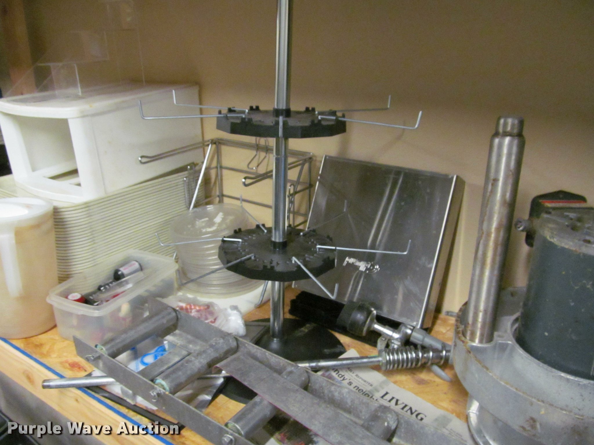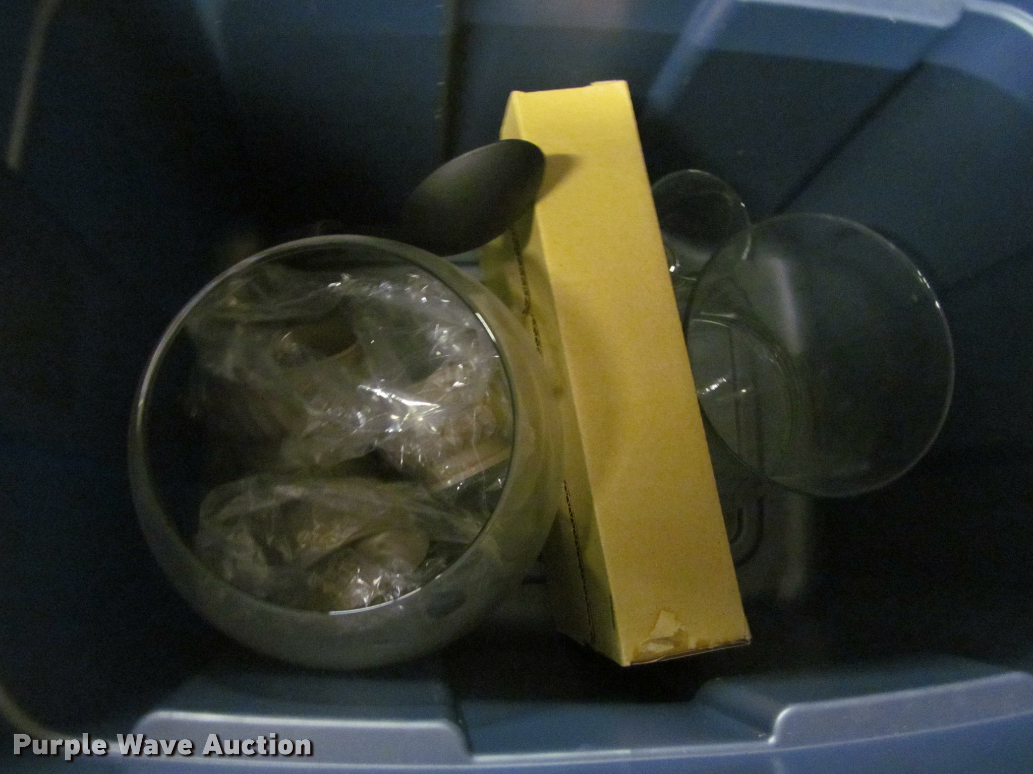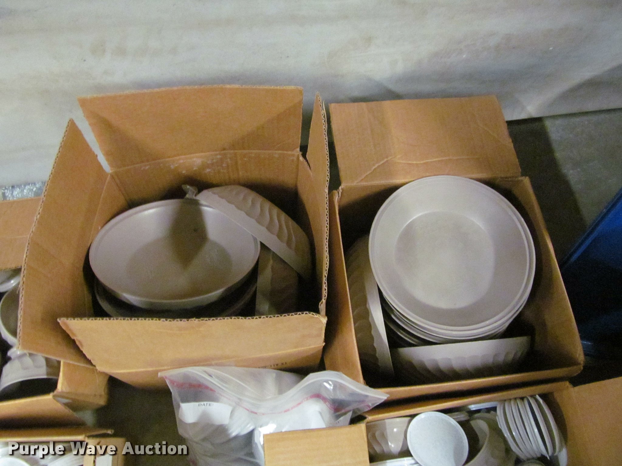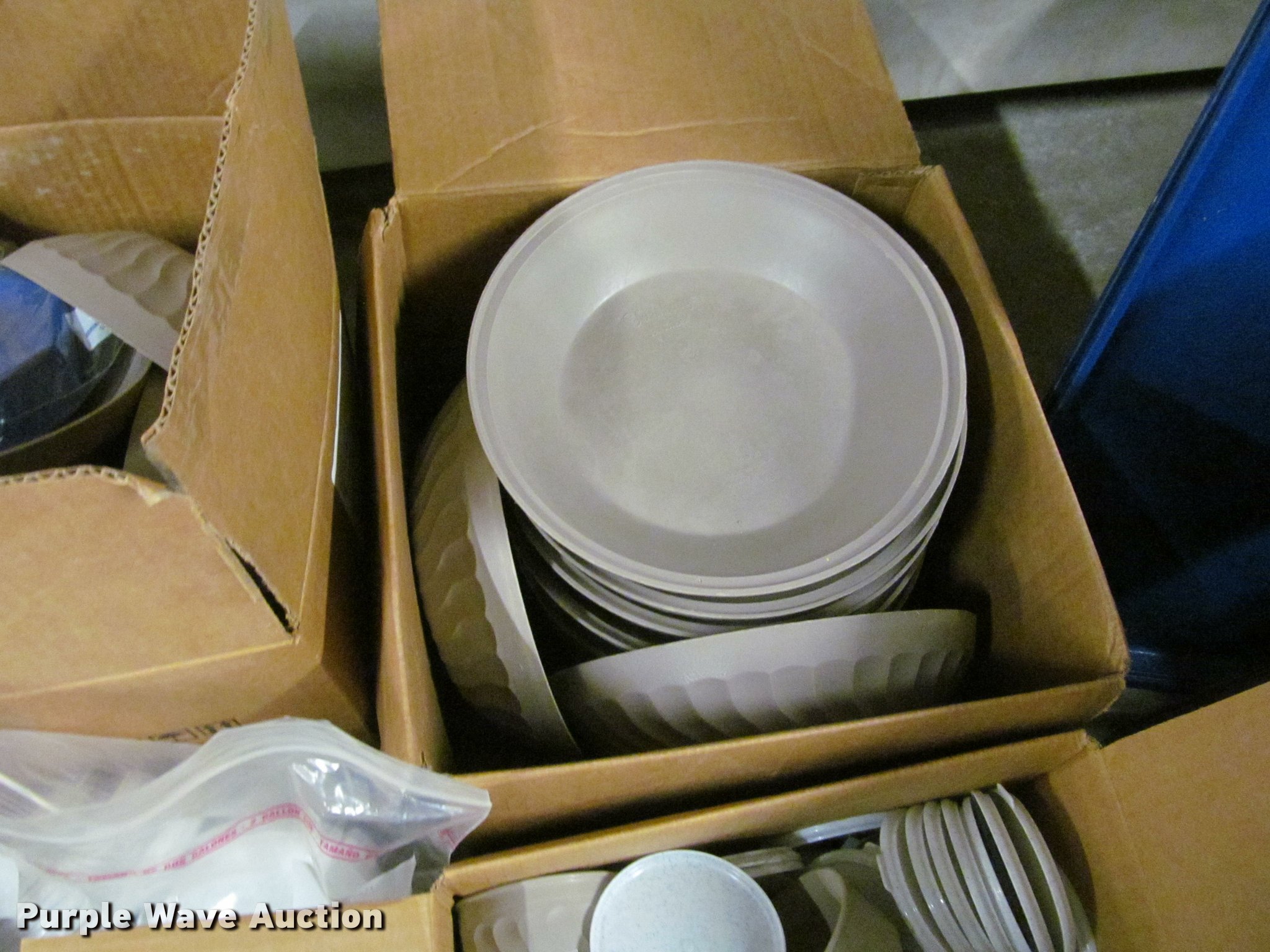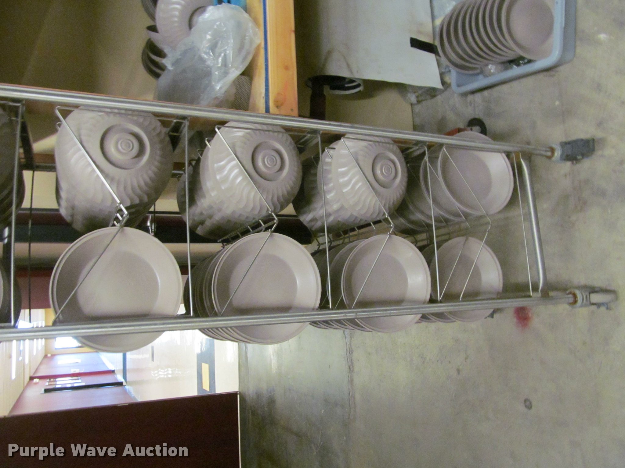 Purple Wave is selling a used Restaurant Equip. in Kansas. This item is a Restaurant equipment with the following: Plates, Bowls, Cups, Lids, Trays, (3) toasters, Cup dispenser, Bowl rack, Rolling, Pitchers, Fryer, Glass vases, Hobart FD3/150 garbage disposals, Wood storage rack, White vinyl roll not included