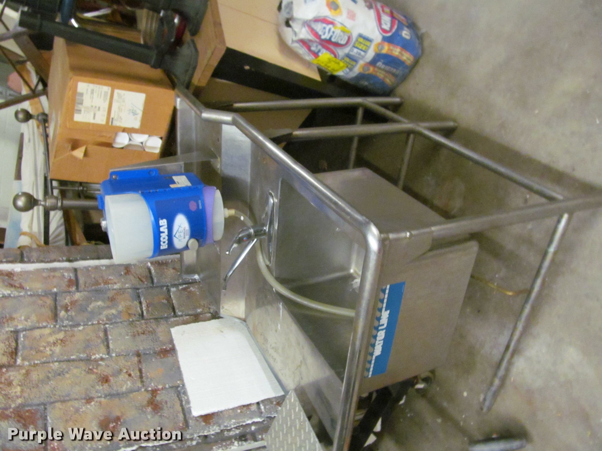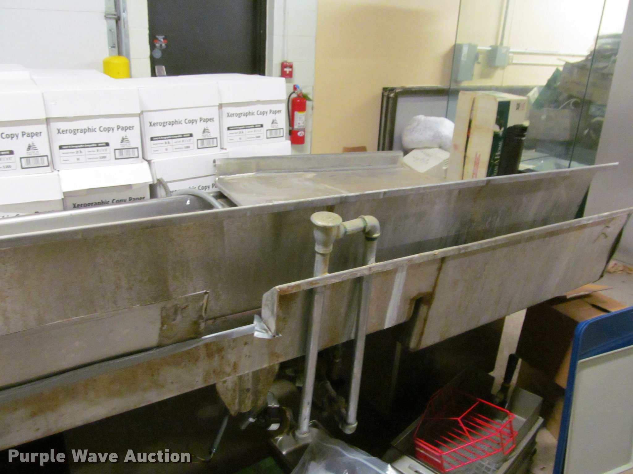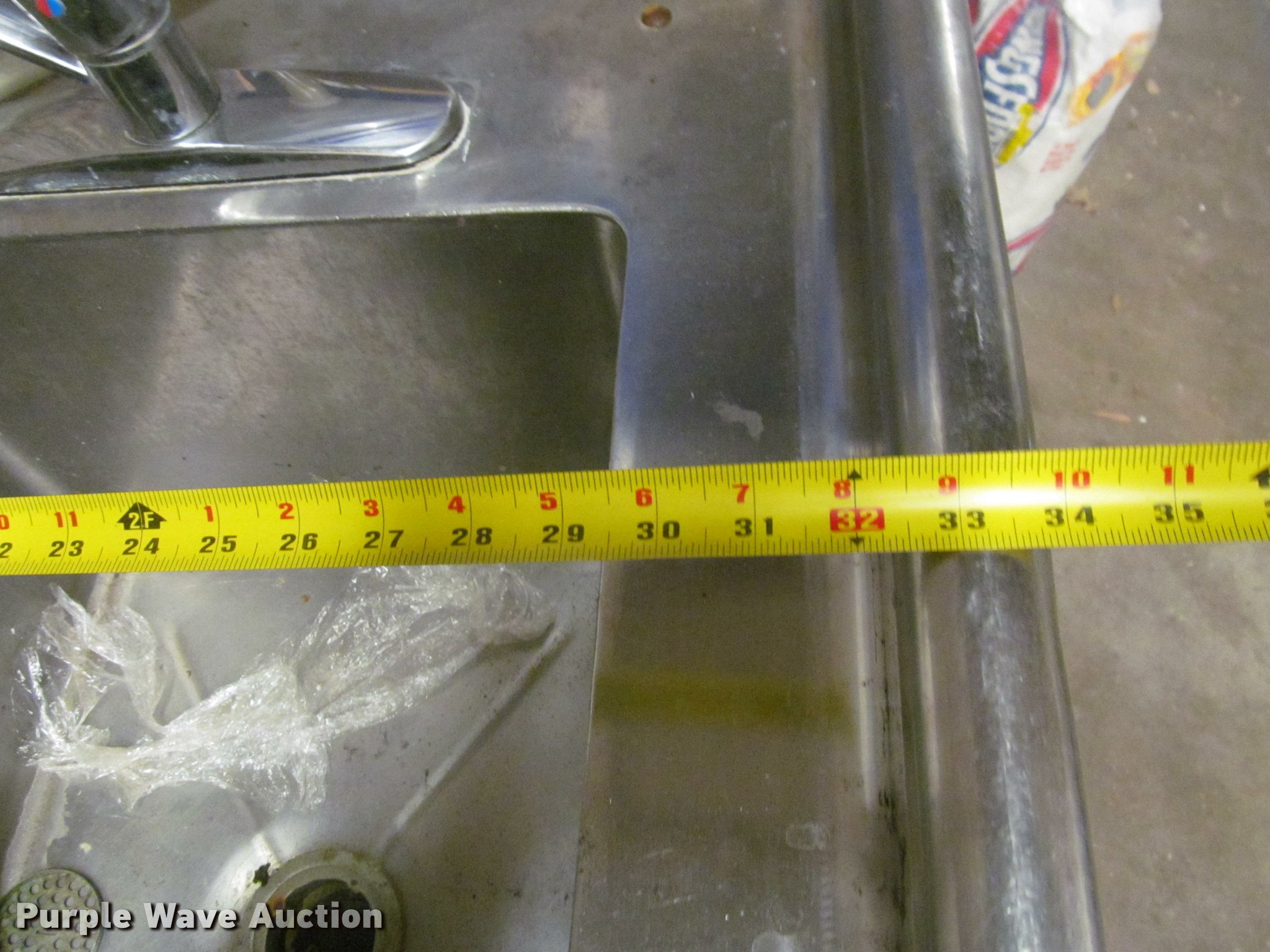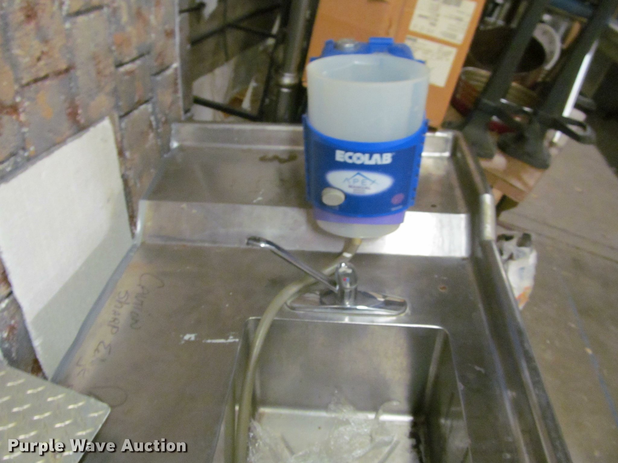 Purple Wave is selling a used Building Materials in Kansas. This item is a Stainless steel sink with the following: 89"L x 36"W, 126"L x 39"W, Assorted plumbing, No legs, Handwash station, 47"L x 34"W, Ecolab soap dispenser