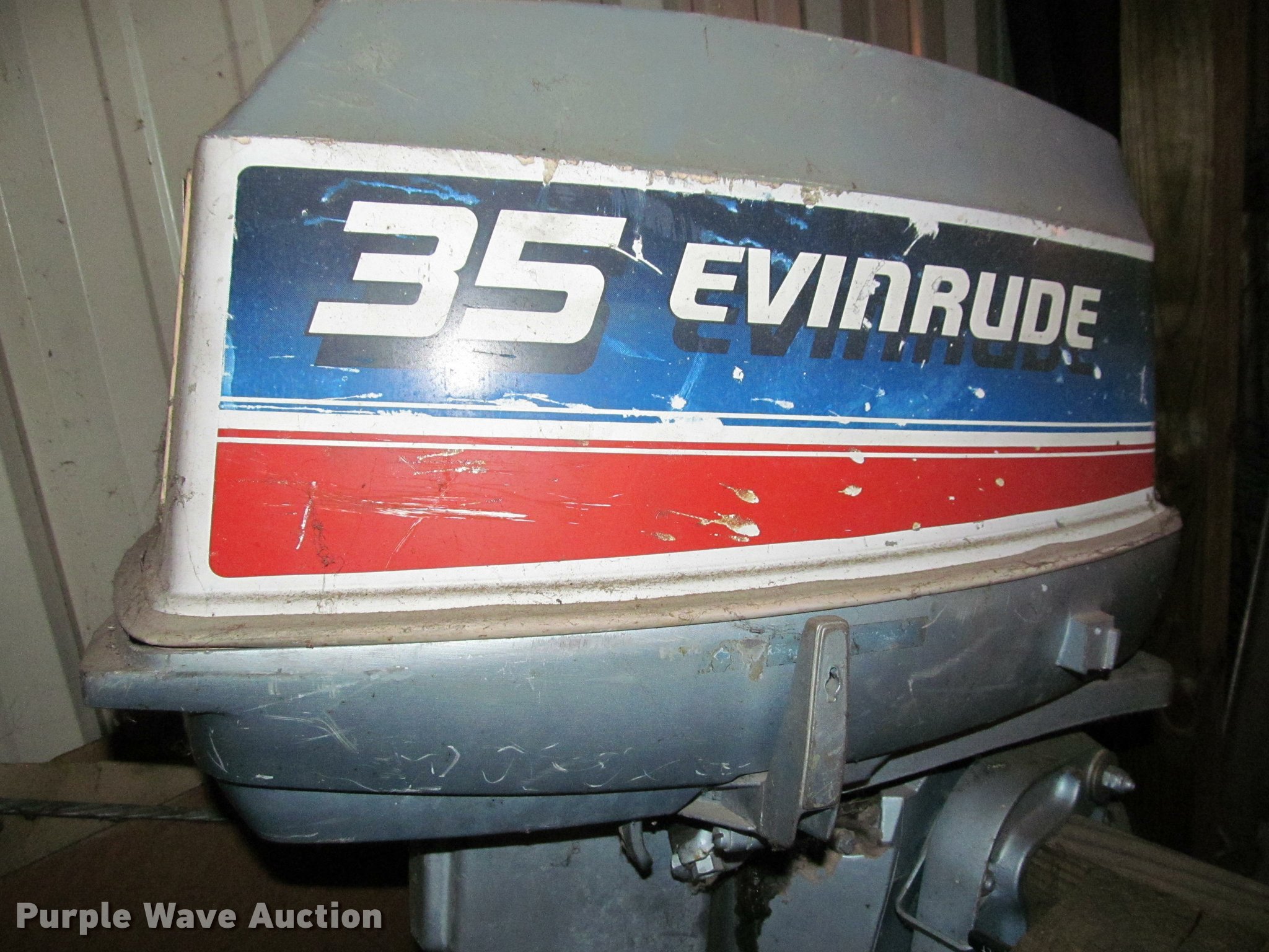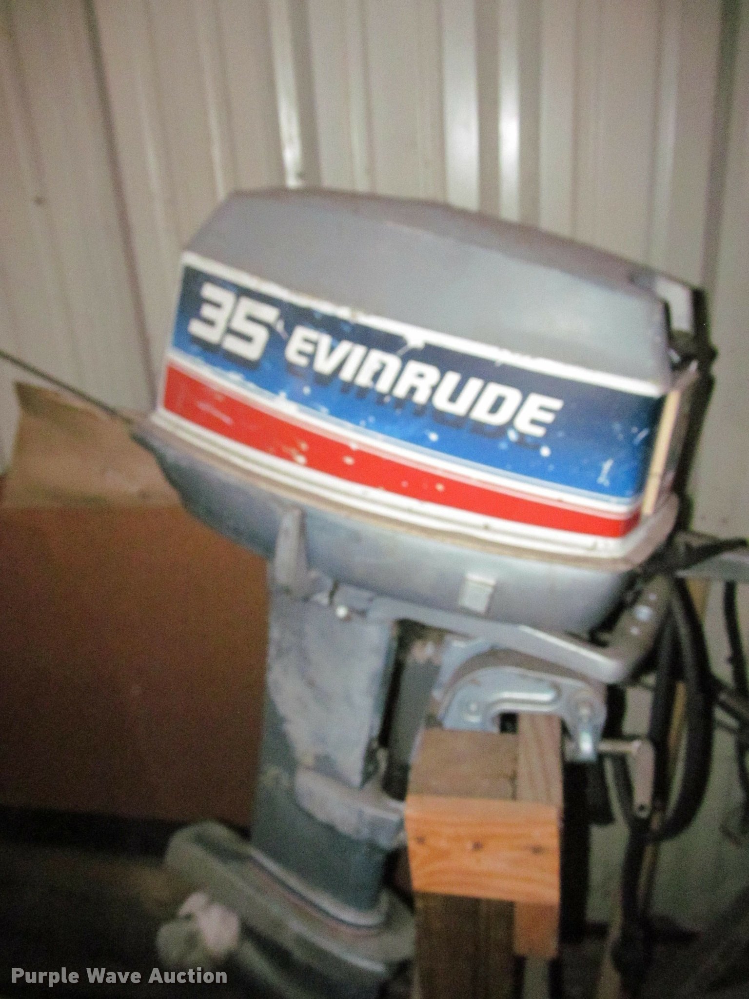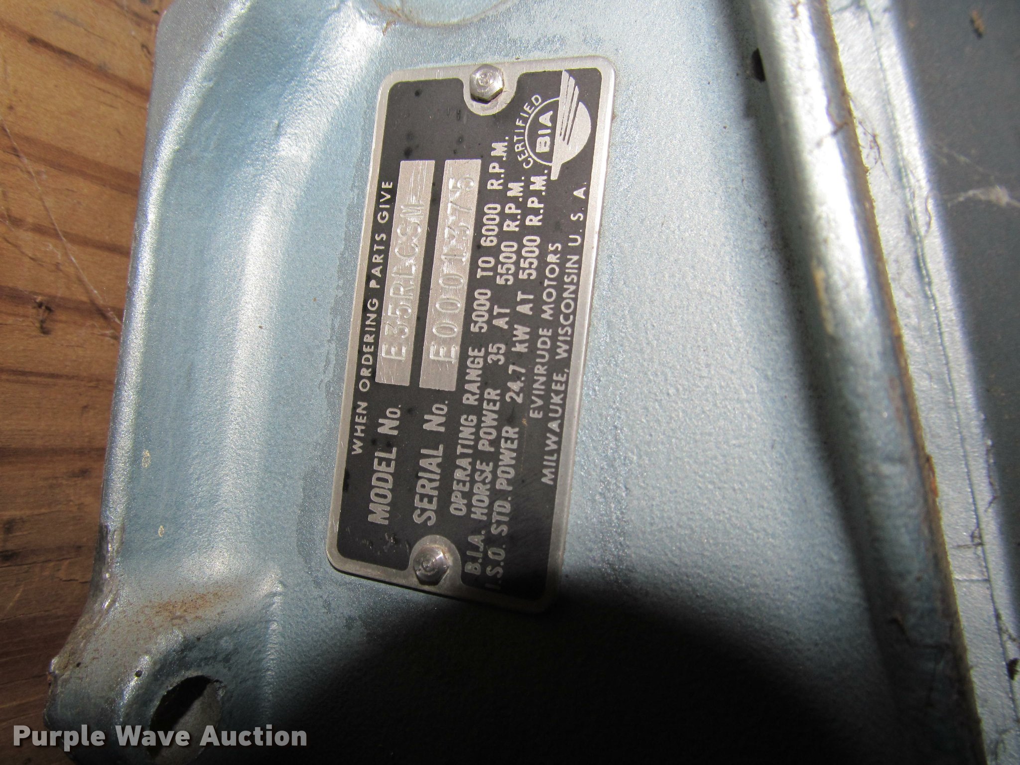 Purple Wave is selling a used Boat in Kansas. This item is a Evinrude boat motor with the following: Model E35RLCSM, 35 HP, Prop damaged, Serial E0001375