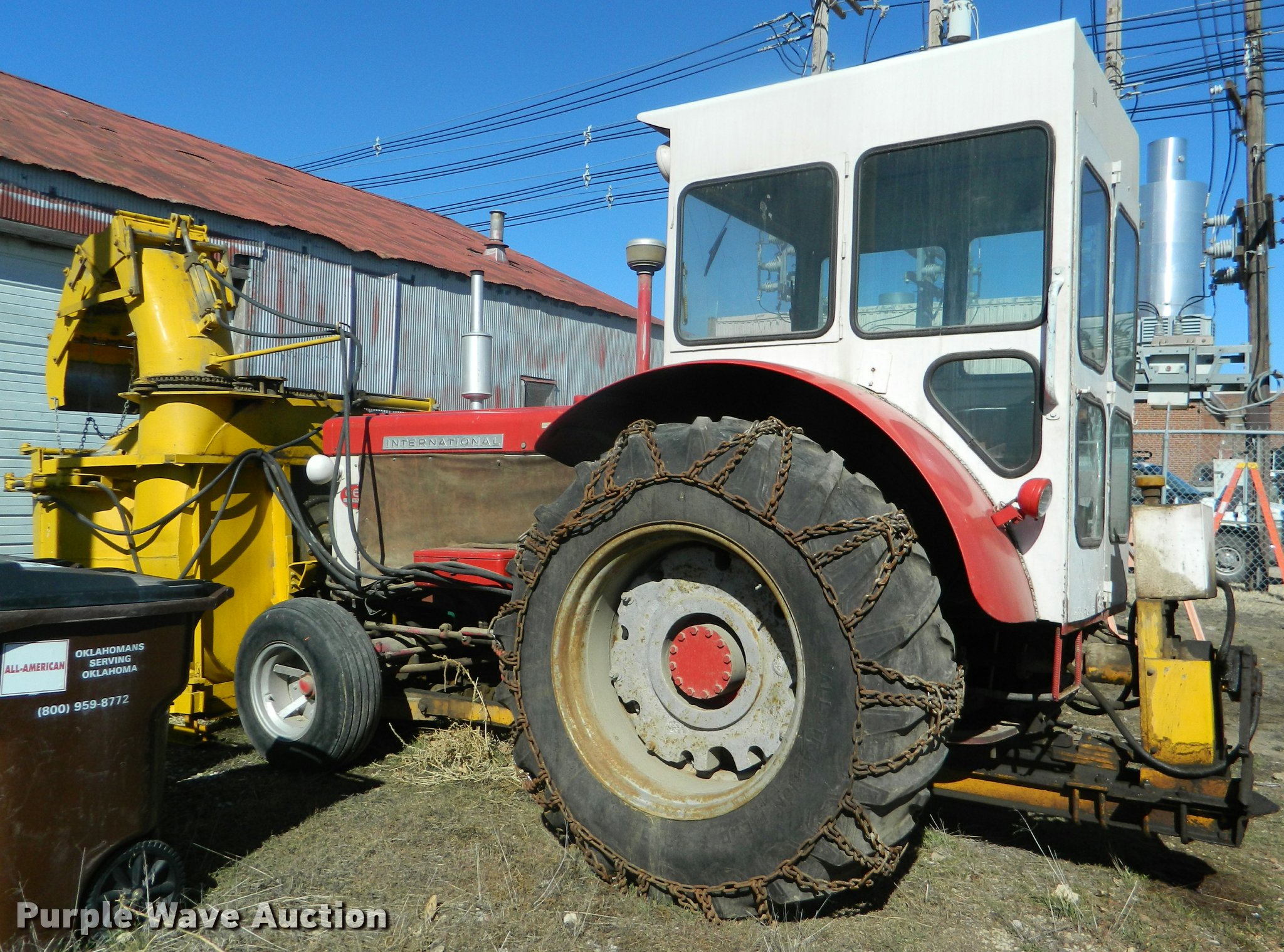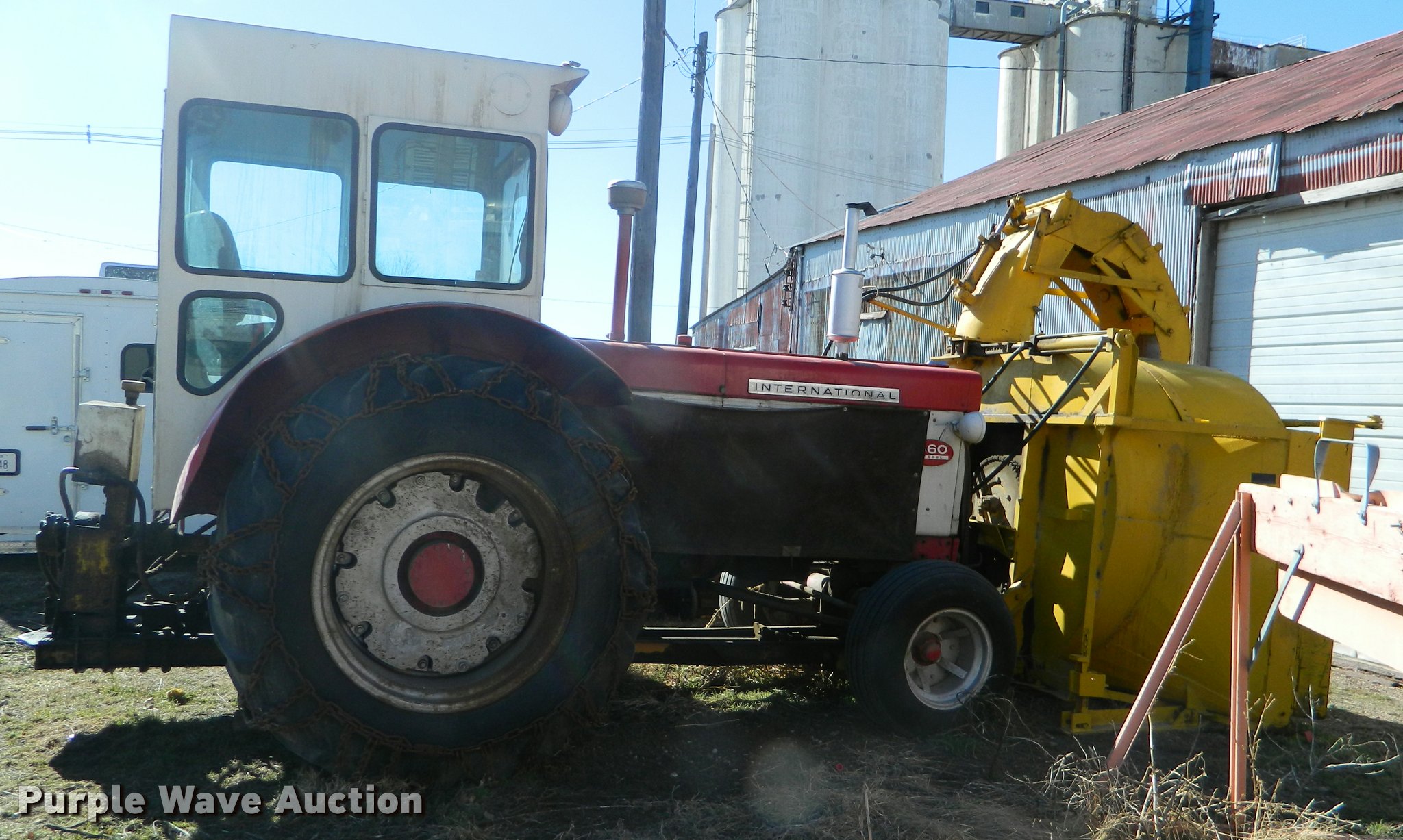 Purple Wave is selling a used Tractor in Kansas. This item is a 1961 International 660 tractor with the following: 403 hours on meter, Six cylinder diesel engine, Five speed manual transmission, Enclosed cat, Heat, 540 PTO, Richardson 66RU4 snow blower, Serial 766R384, 18.4-34 calcium filled rear tires, Tire chains, Cab glass cracked, Serial 5533S