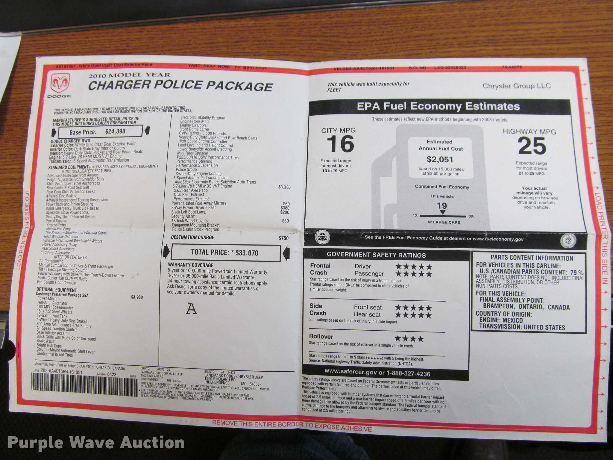 Purple Wave is selling a used Passenger Vehicle in Kansas. This item is a 2010 Dodge Charger with the following: 140,830 miles on odometer, 5.7L V8 OHV 16V gas engine, Automatic transmission, AC and heat, Tilt, Cruise, AM/FM/CD, Power windows, locks, mirrors, and seat, Cloth interior, Spotlight, Goodyear Eagle S-A P225/60R18 tires, Center console removed