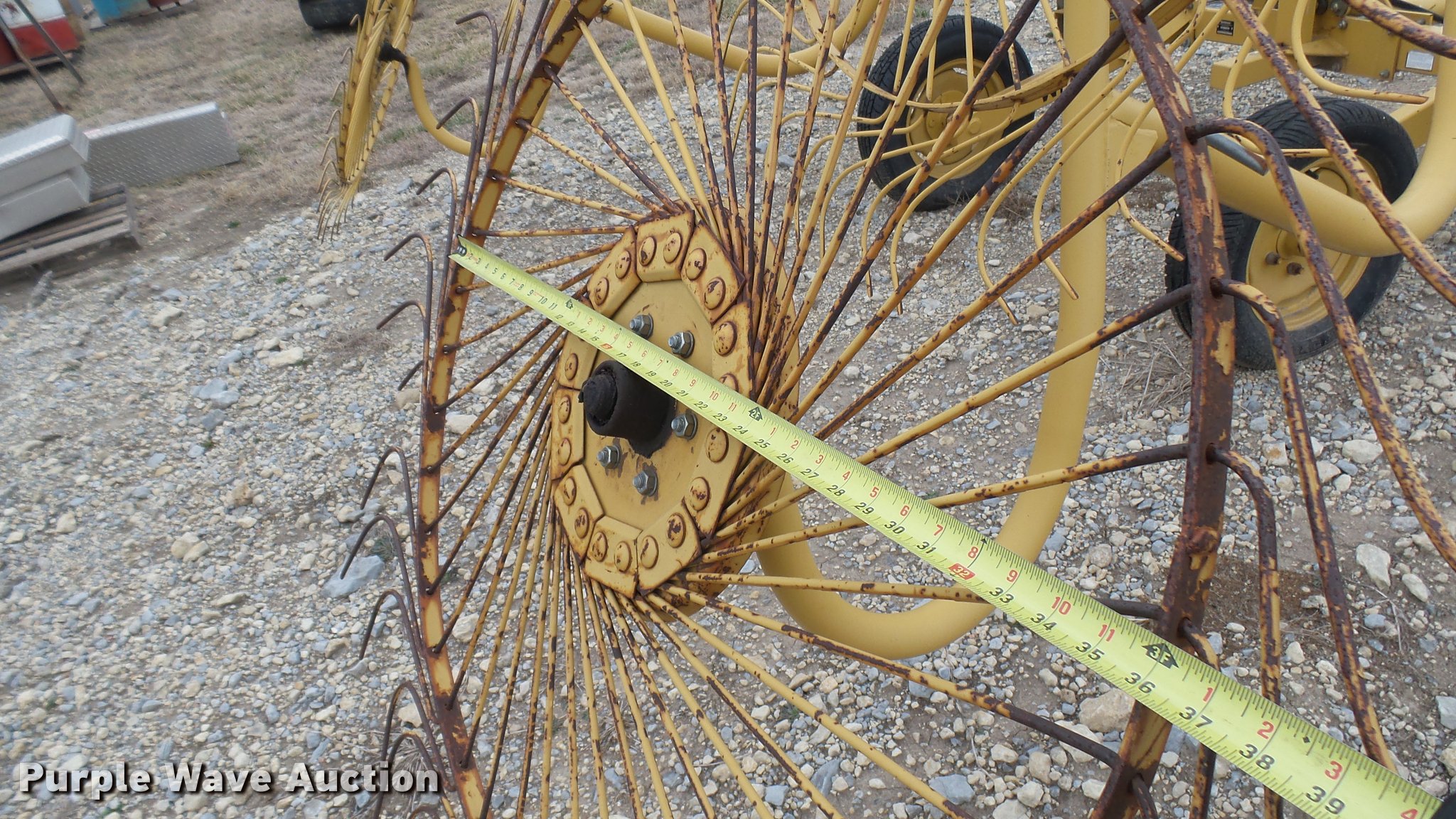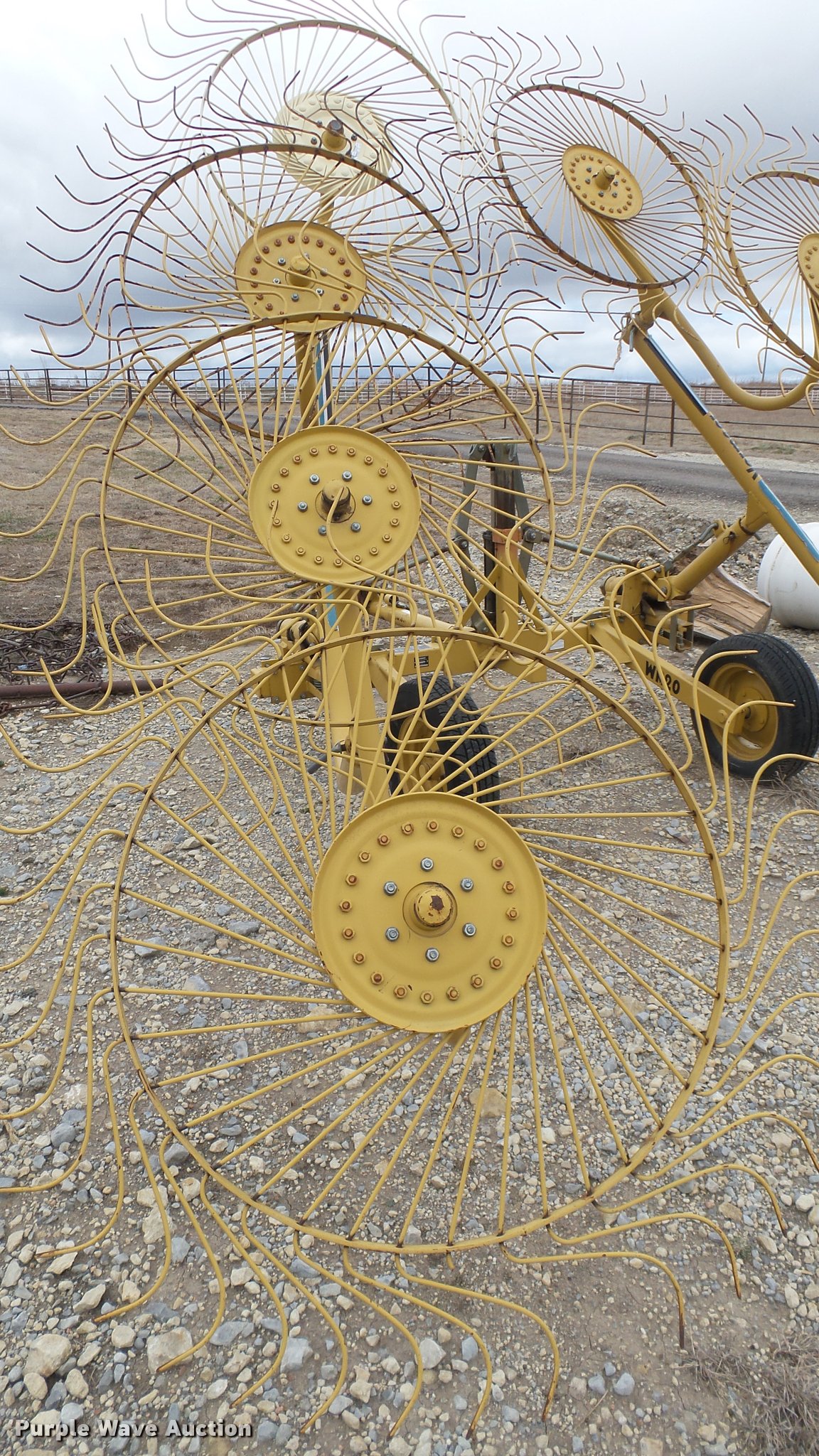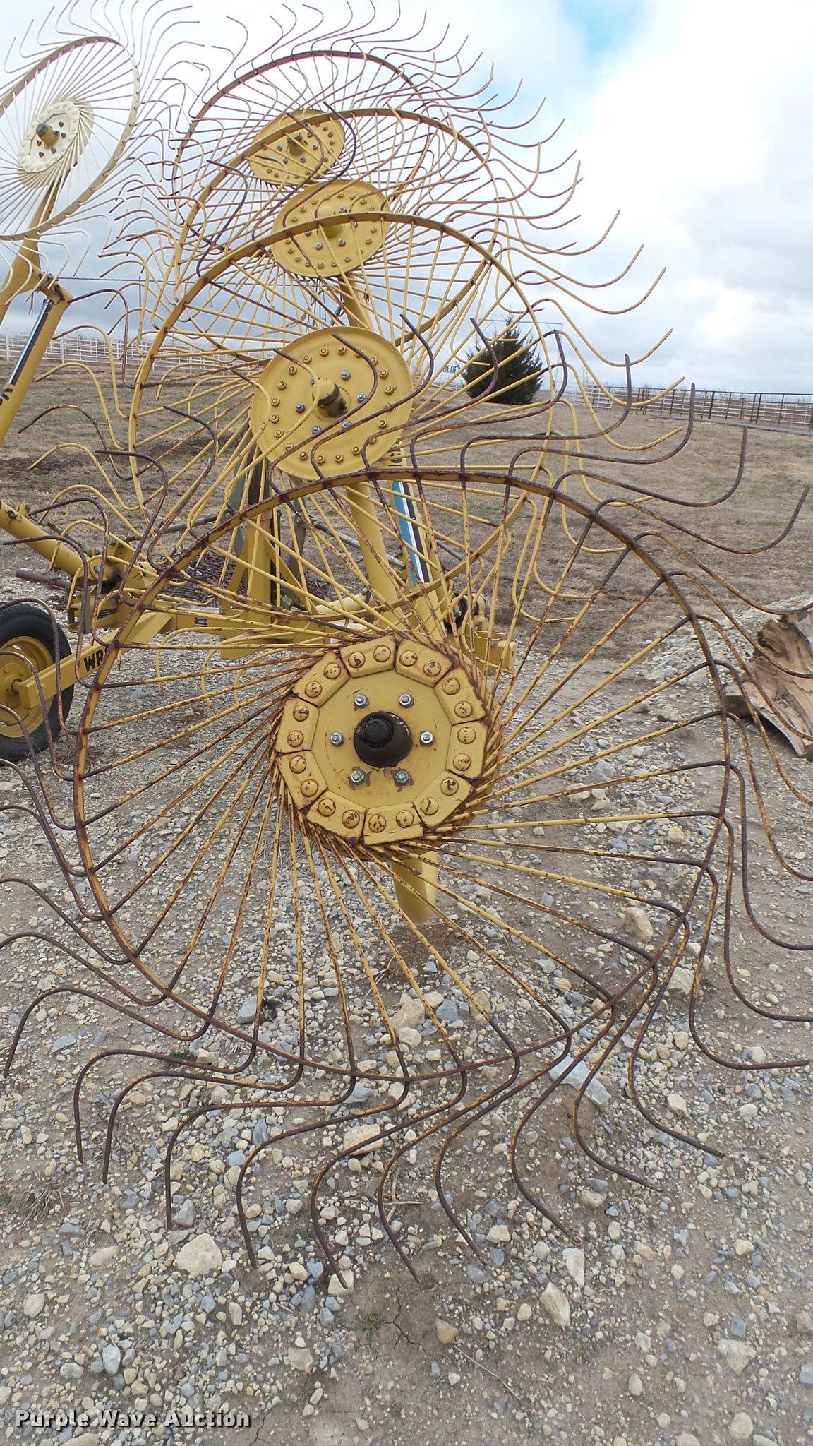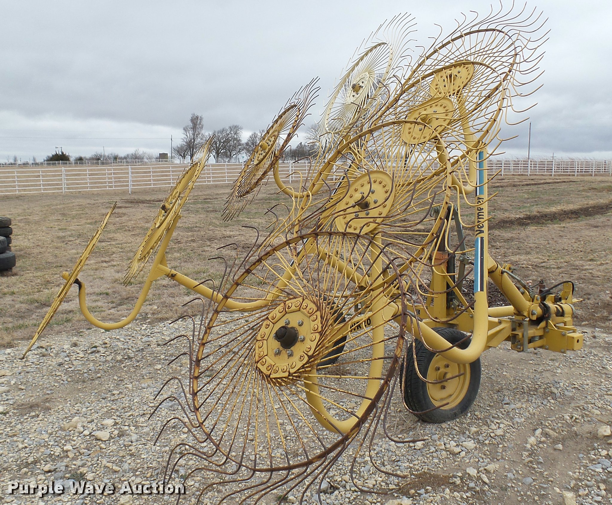 Purple Wave is selling a used Hay Rake in Kansas. This item is a Vermeer WR20 wheel hay rake with the following: 29'W swath, (8) 36" diameter wheels, Hydraulic fold, Pin hitch, 185/65R14 tires, Serial 1VRB161W011005643
