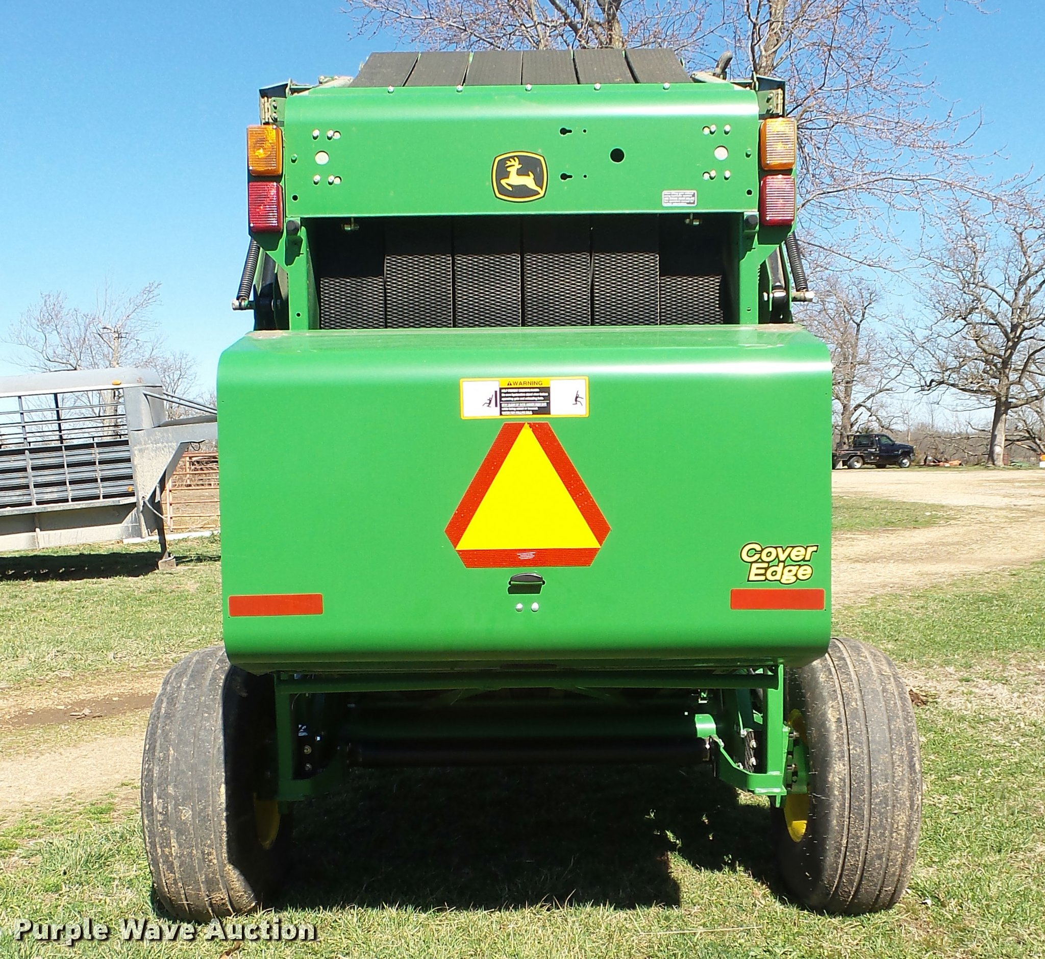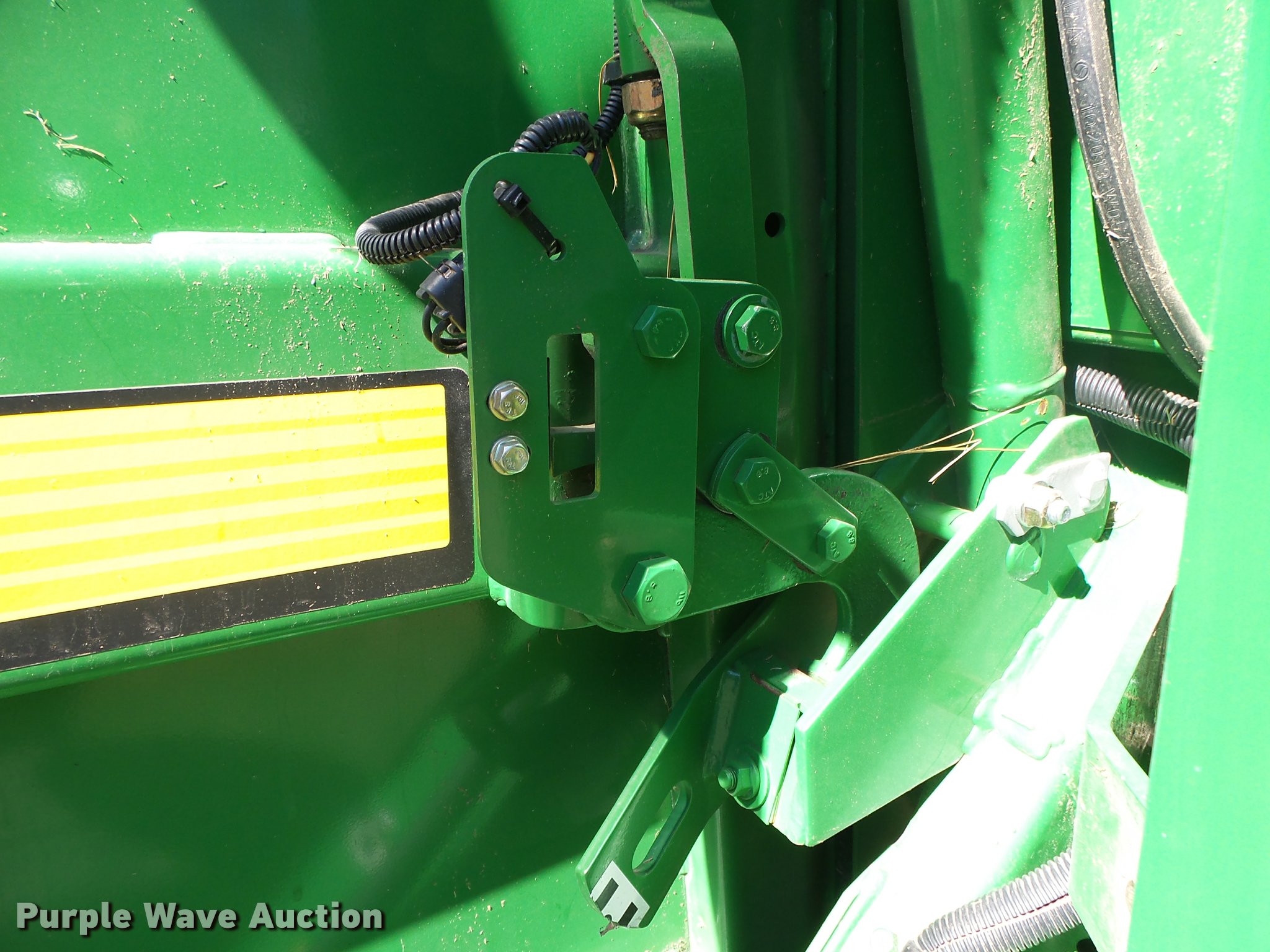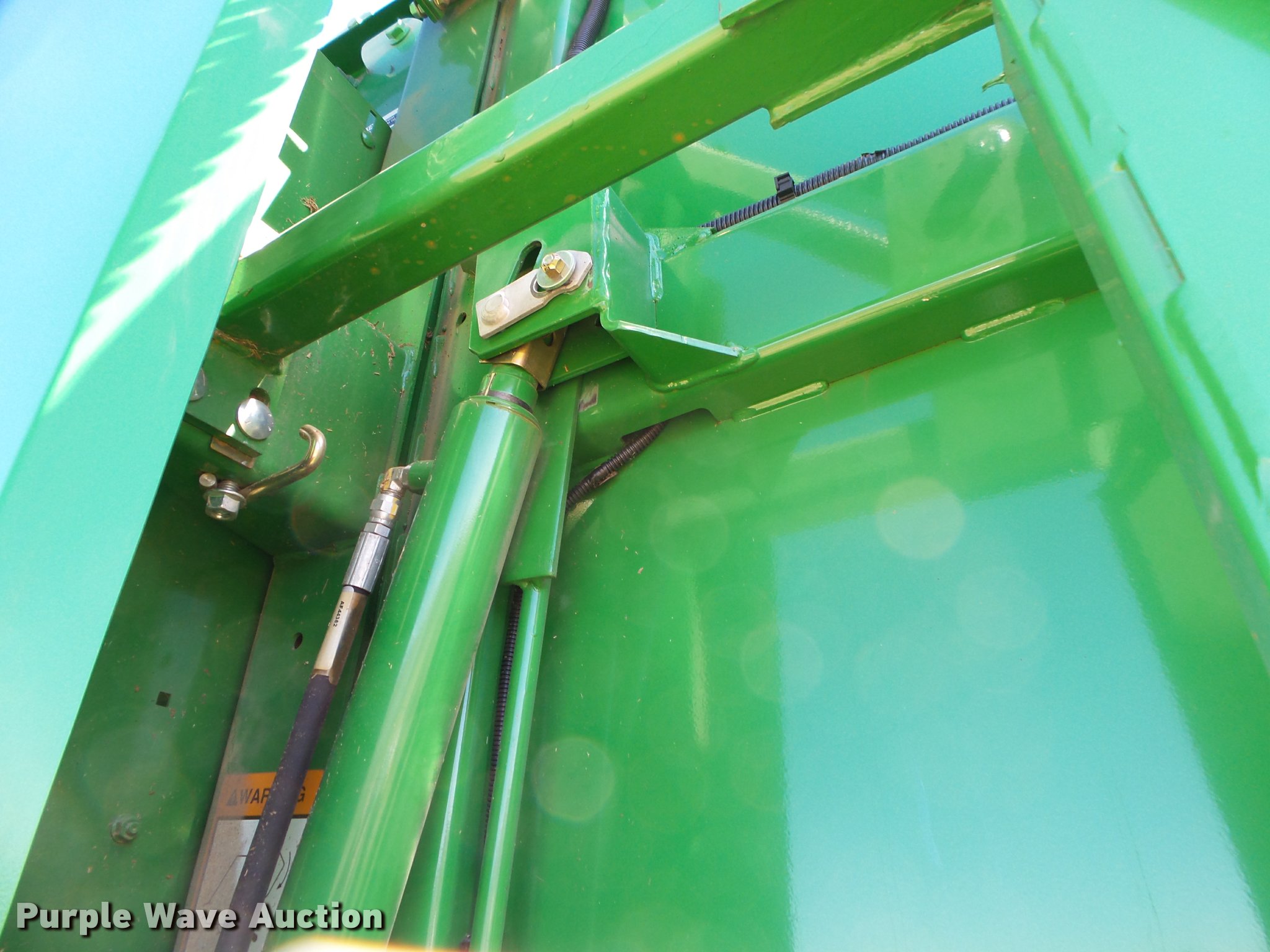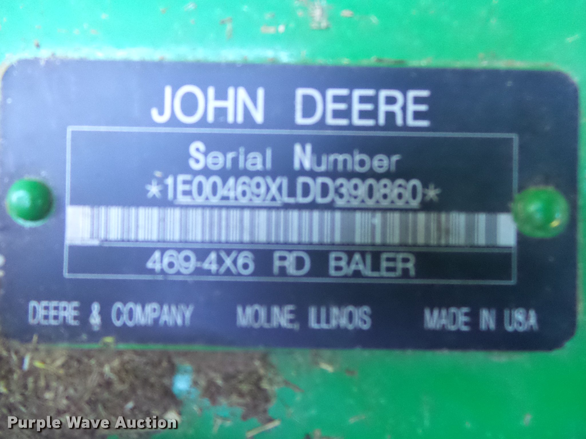 Purple Wave is selling a used Round Baler in Missouri. This item is a 2013 John Deere 469 Mega Wide Plus round baler with the following: 1,698 bales on counter, 4' x 6' bale capacity, Hydraulic pickup lift, 4.80-8/3.75 gauge wheels, Feed assist roller, John Deere monitor, Wet bale kit, Auto-tie, Net-wrap, Bale kicker, Transport lights, 540 PTO, Pin hitch, 14L-16.1SL tires, Serial 1E00469XLDD390860