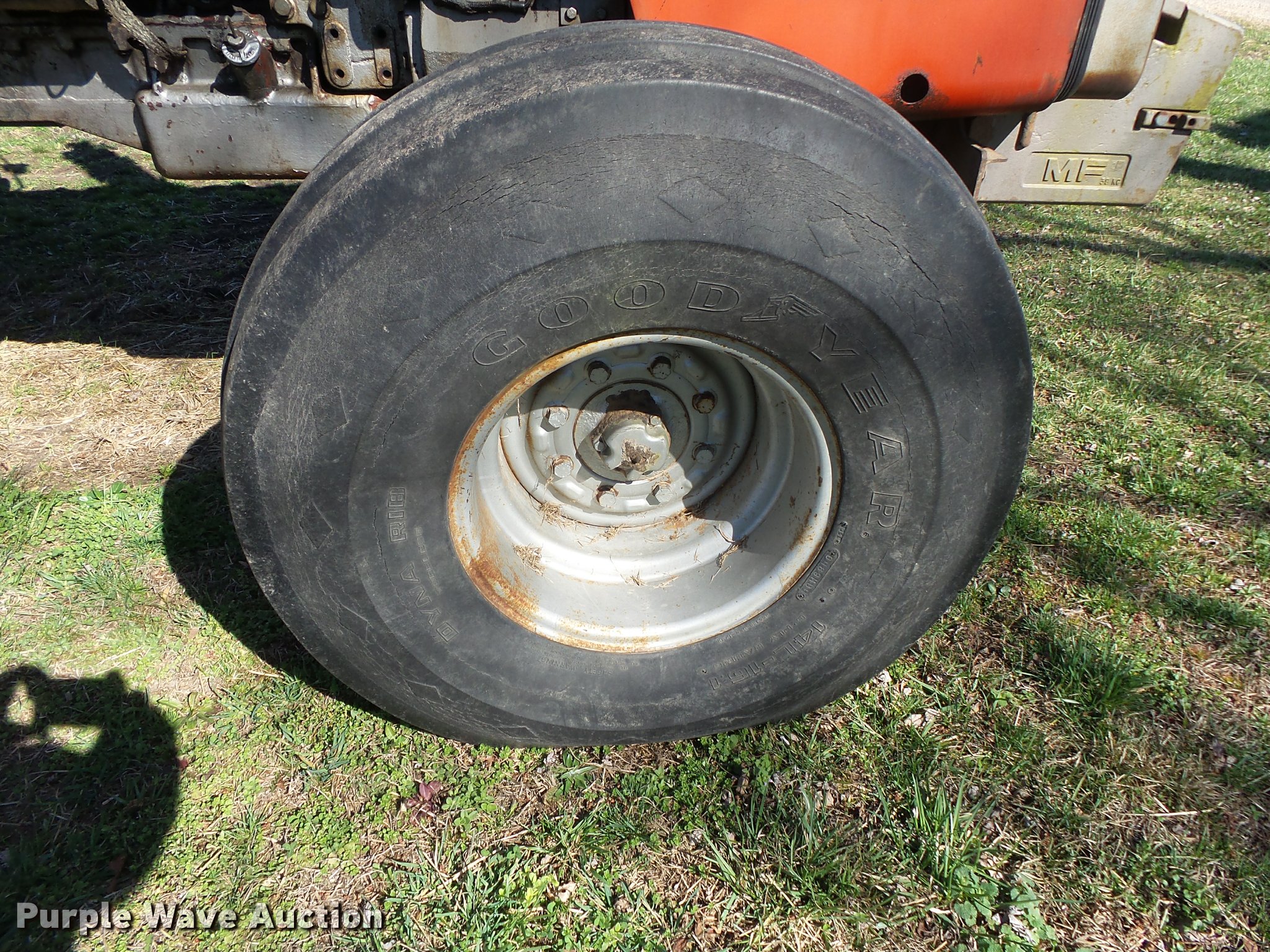 Purple Wave is selling a used Tractor in Missouri. This item is a 1978 Massey-Ferguson 2775 tractor with the following: 2,842 hours on meter, Eight cylinder diesel engine, Multi-power transmission, 24F-24R gears, AC and heat, Non-operational AC, AM/FM, Suspension seat, Three point, Top link, 1000 PTO, (3) rear hydraulic remote sets, (6) suitcase weights, 14L-16.1SL front tires, 20.8R38 dual rear tires, Additional front wheel and tire, Serial 9R001650