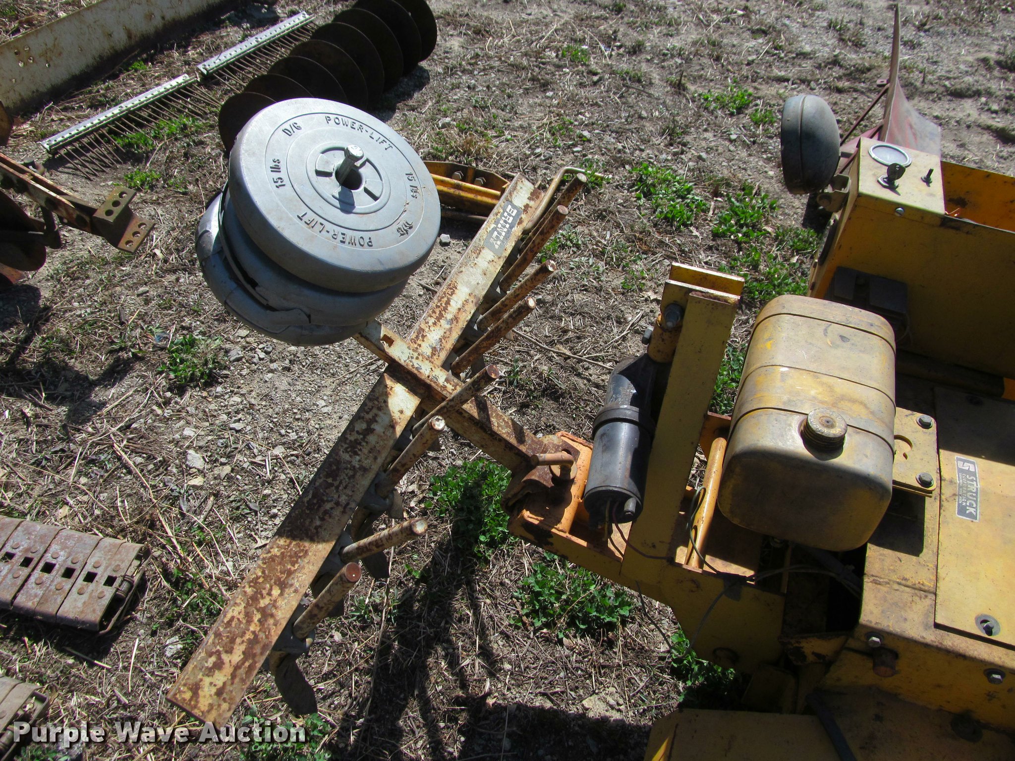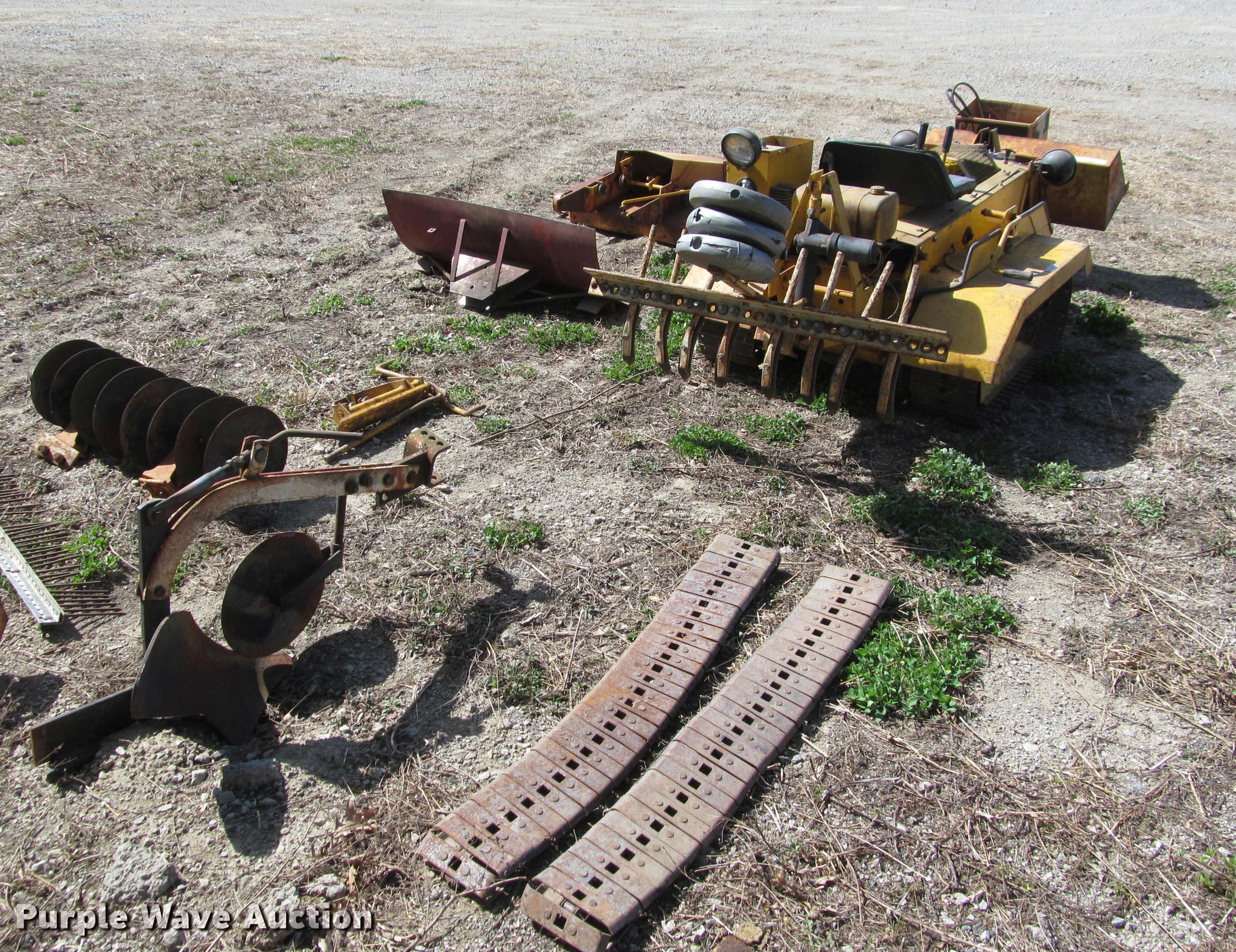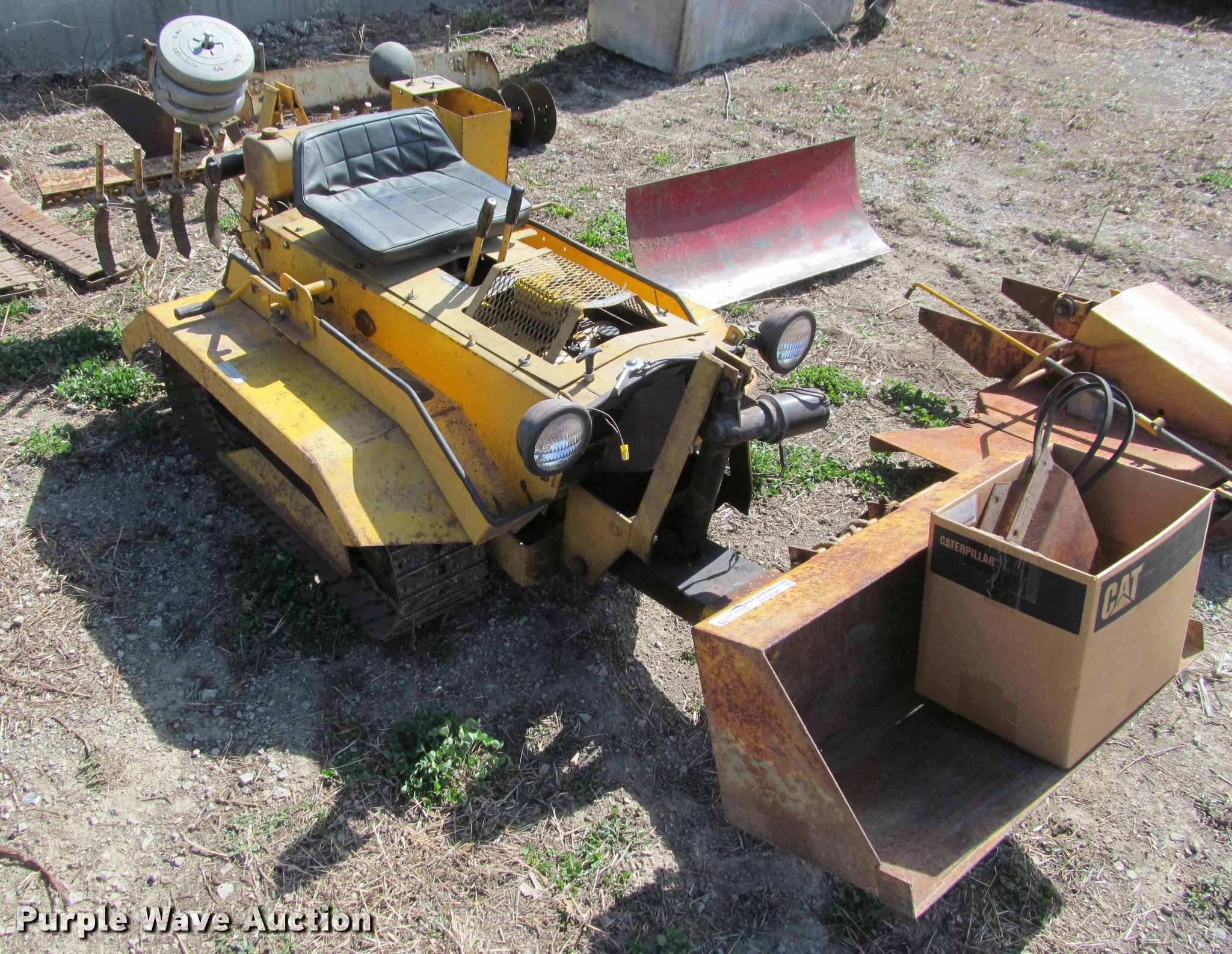 Purple Wave is selling a used Crawler Dozer in Kansas. This item is a Struck mini-dozer with the following: 350 hours on meter, 16 HP gas engine, No spark, Hand controls, Work lights, 30"W bucket, Electric height adjust, 41.5"W ripper, (8) shanks, Electric height adjust, 8"W tracks, Owners manual, Additional attachments, Mower, 92"W snow blade, Eight row disk, One row plow, 6"W turf tracks