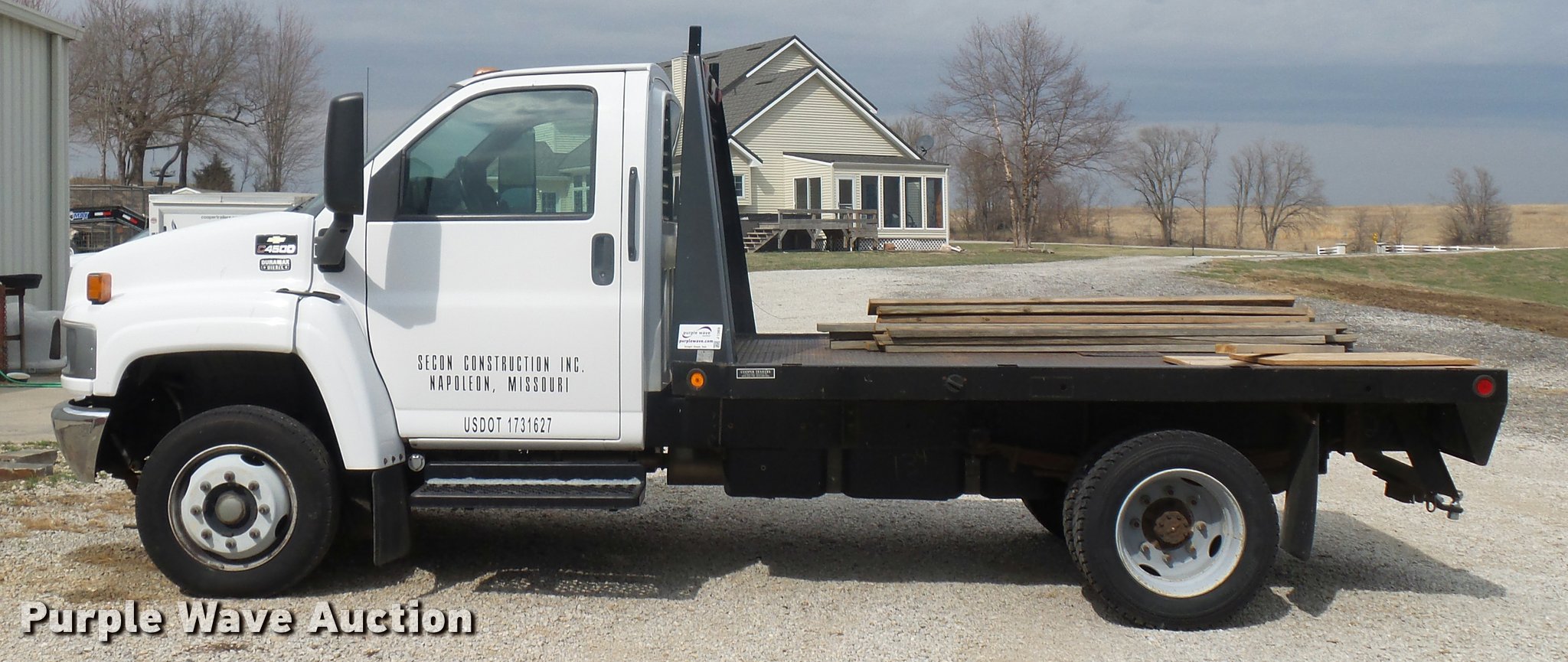 Purple Wave is selling a used Flat Bed Truck in Missouri. This item is a 2003 Chevrolet C4500 flatbed truck with the following: 15,716 miles on odometer, 6.6L V8 OHV 32V turbo diesel engine, Automatic transmission, AC and heat, AM/FM, Manual windows and locks, 11'L x 8'W flatbed, Receiver hitch, Trailer wiring, Spring suspension, Hydraulic brakes, 295/70R19.5 tires, Check engine light on