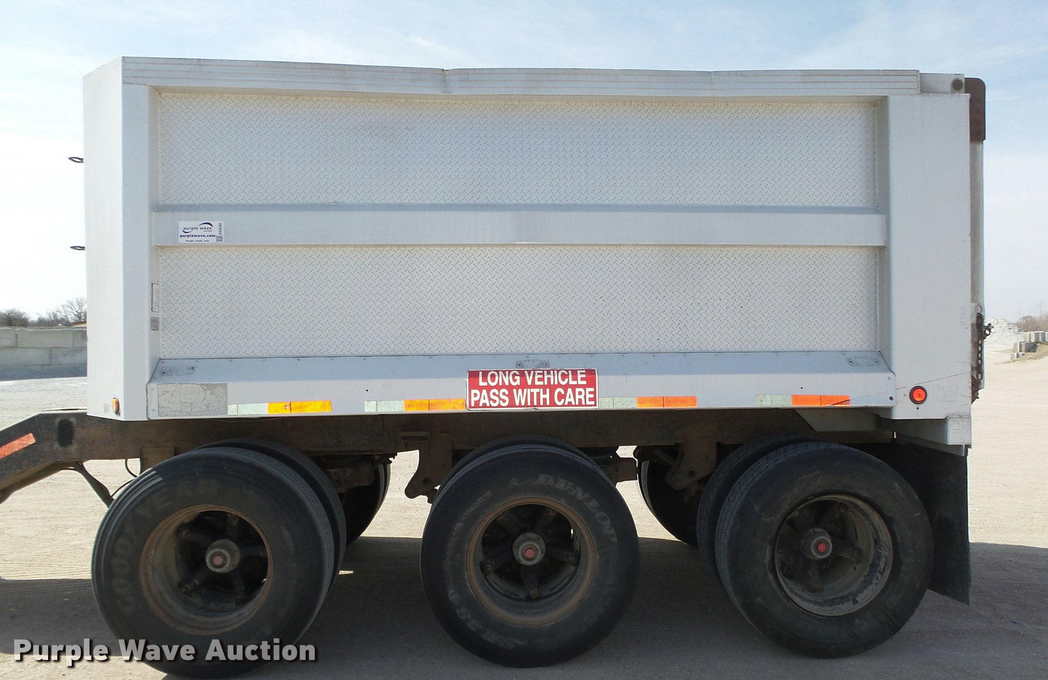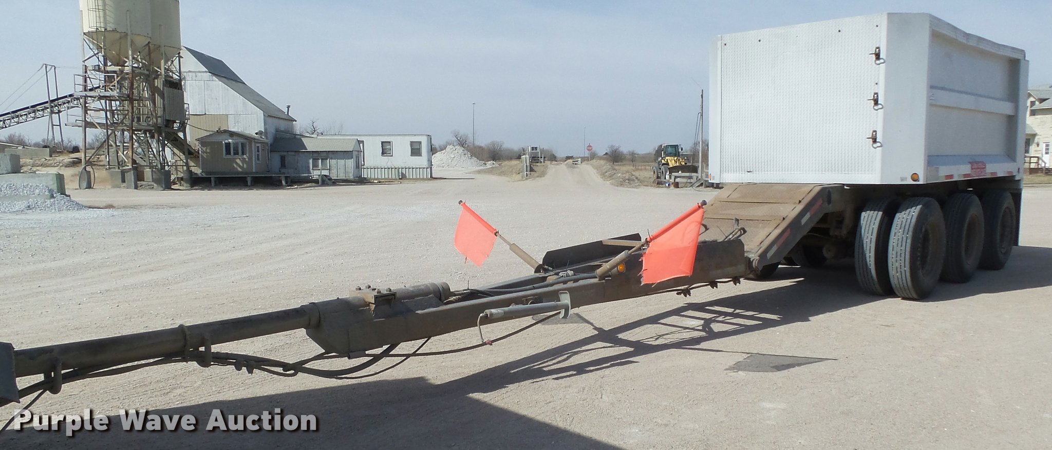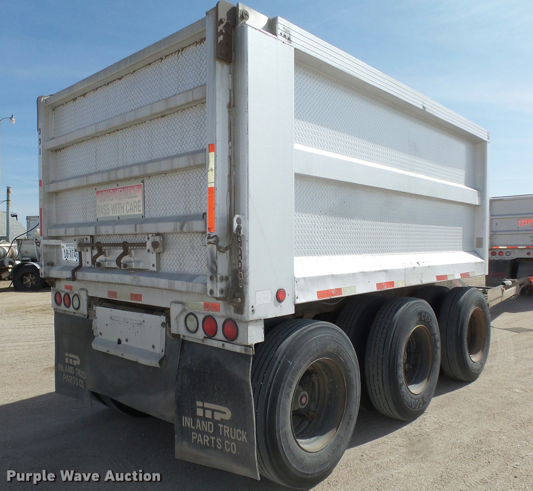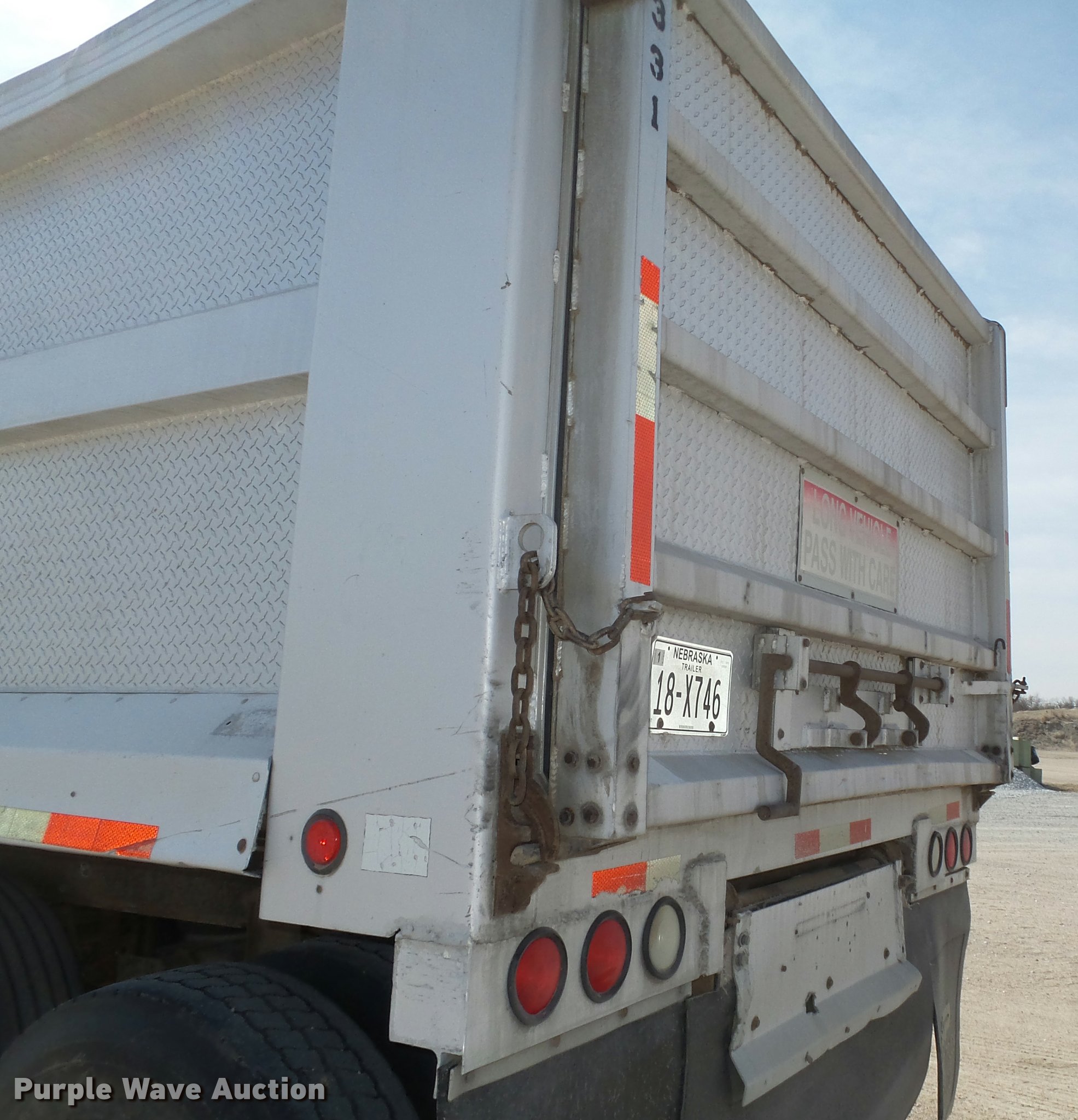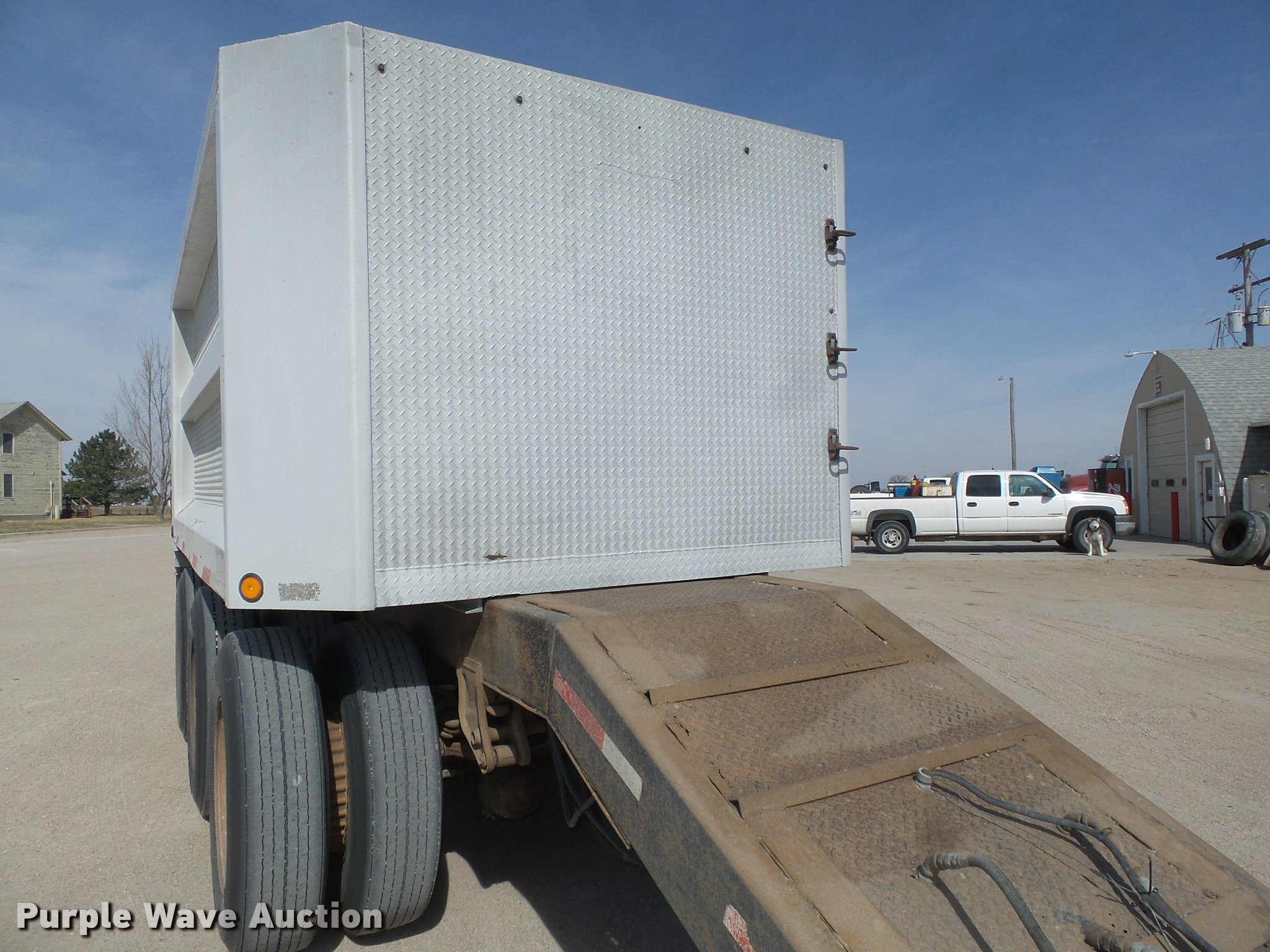 Purple Wave is selling a used End Dump Rock Trailer in Nebraska. This item is a 1992 Cornhusker 800 end dump pup trailer with the following: 32'7" overall length, 14'L x 96"W box, Model AD14-6060, 58" side height, 112" from ground to top of sides, Aluminum construction, Single hydraulic cylinder, Air operated grain door end gate, Poly liner, Tarp, Single leg landing gear, Bumper pull, Triple axle, Air over spring suspension, Air brakes, Steel wheels, 11R22.5 tires, Serial 93126