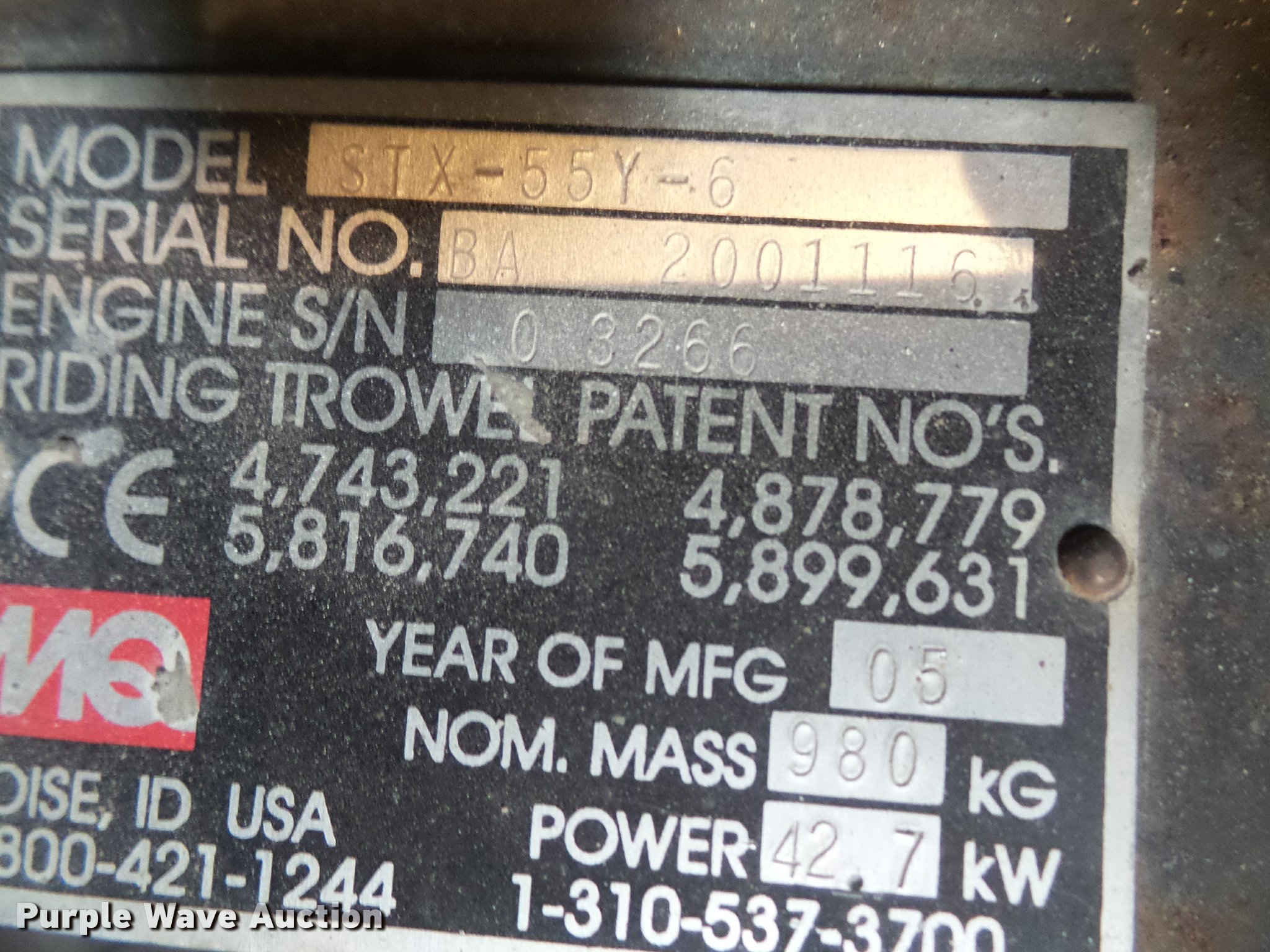 Purple Wave is selling a used Concrete Equip. or Acces. in Kansas. This item is a 2005 Whiteman STX-55Y-6 power trowel with the following: 338 hours on meter, Yanmar 4TNVB4T-D 1.995L four cylinder turbo diesel engine, 42.7 kW, 10'W, Work lights, Float pans included, Serial BA2001116
