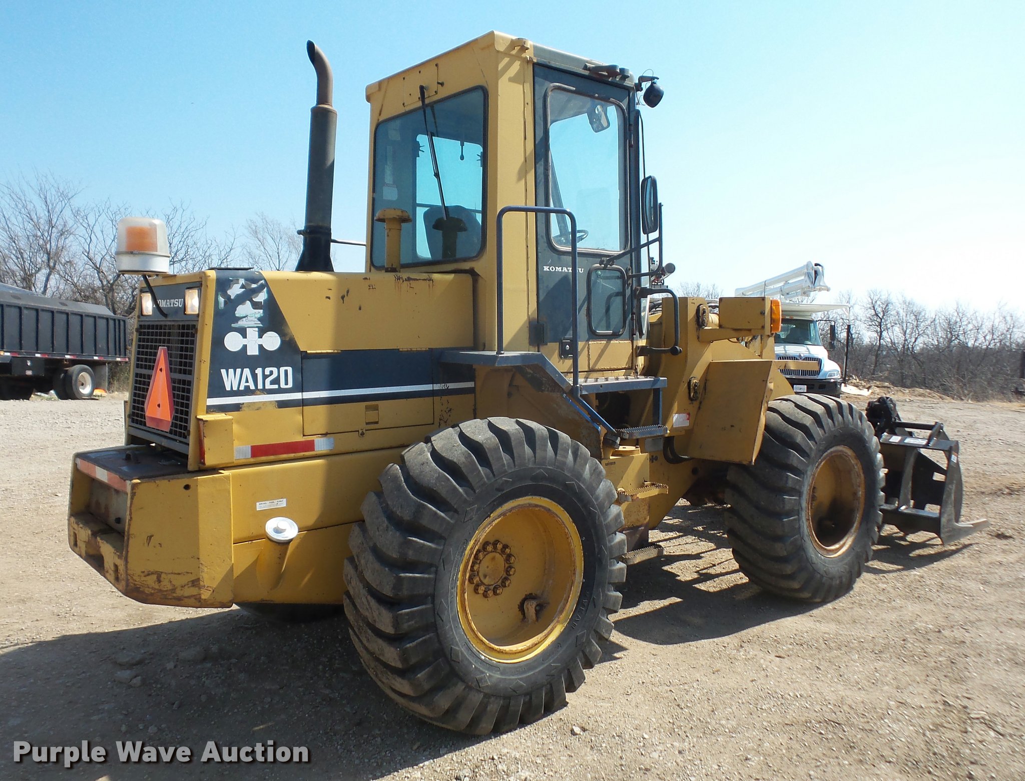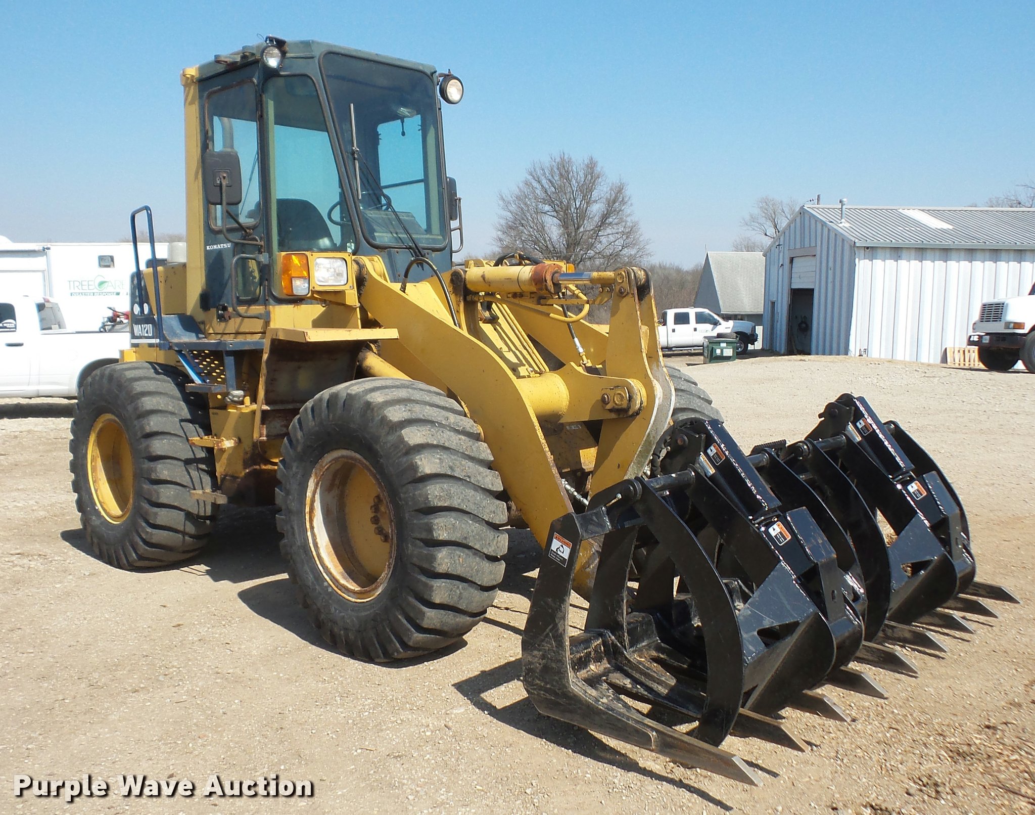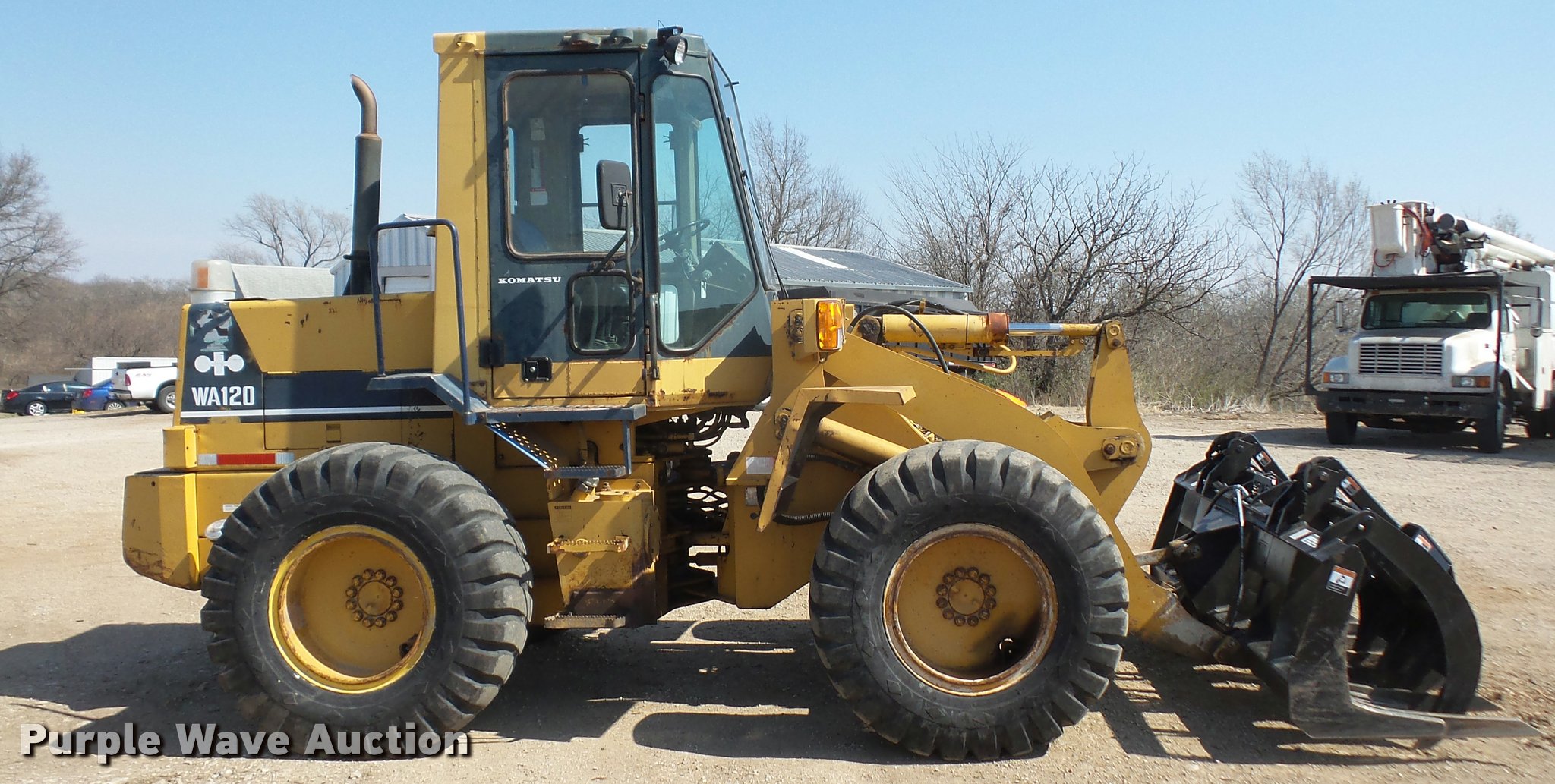 Purple Wave is selling a used Wheel Loader in Kansas. This item is a 1987 Komatsu WA120 wheel loader with the following: 5,888 hours on meter, Komatsu 6D95L six cylinder diesel engine, Serial 25540, Powershift transmission, 3F-3R gears, EROPS, Heat, Suspension seat, Joystick bucket controls, Front and rear work lights, 94"W general purpose bucket, Faver 8'W grapple bucket, Stroge light, Front auxiliary hydraulics, 17.5-25 tires, Serial 10007