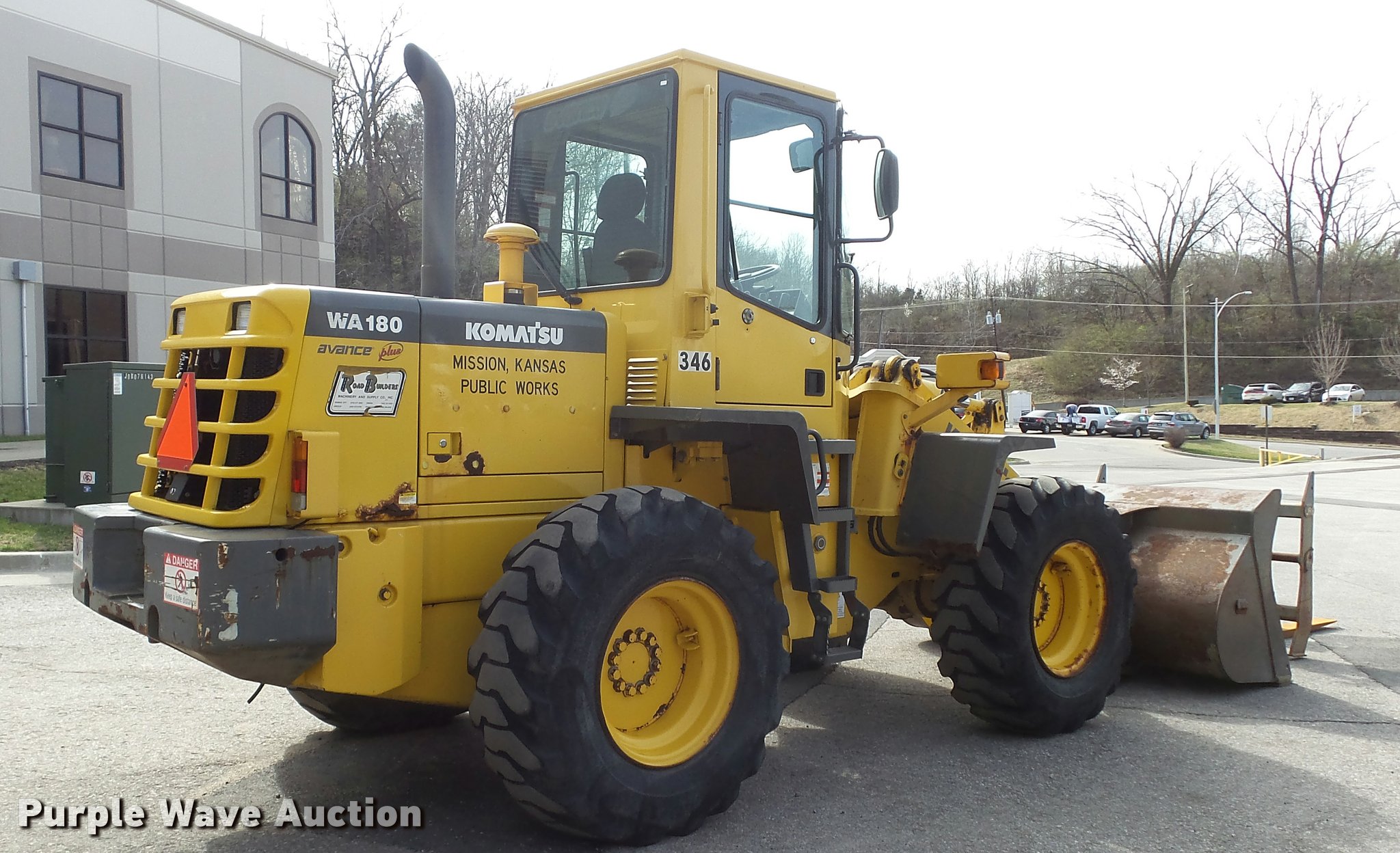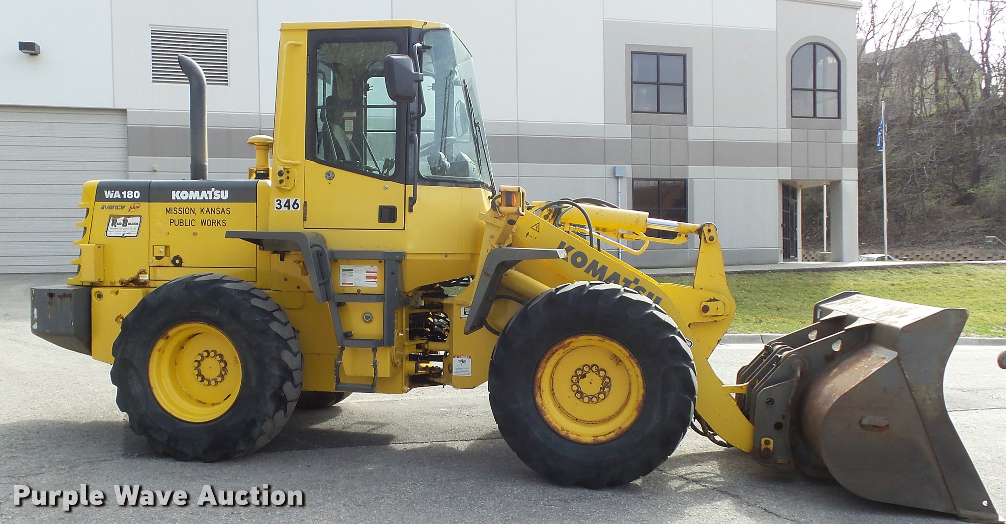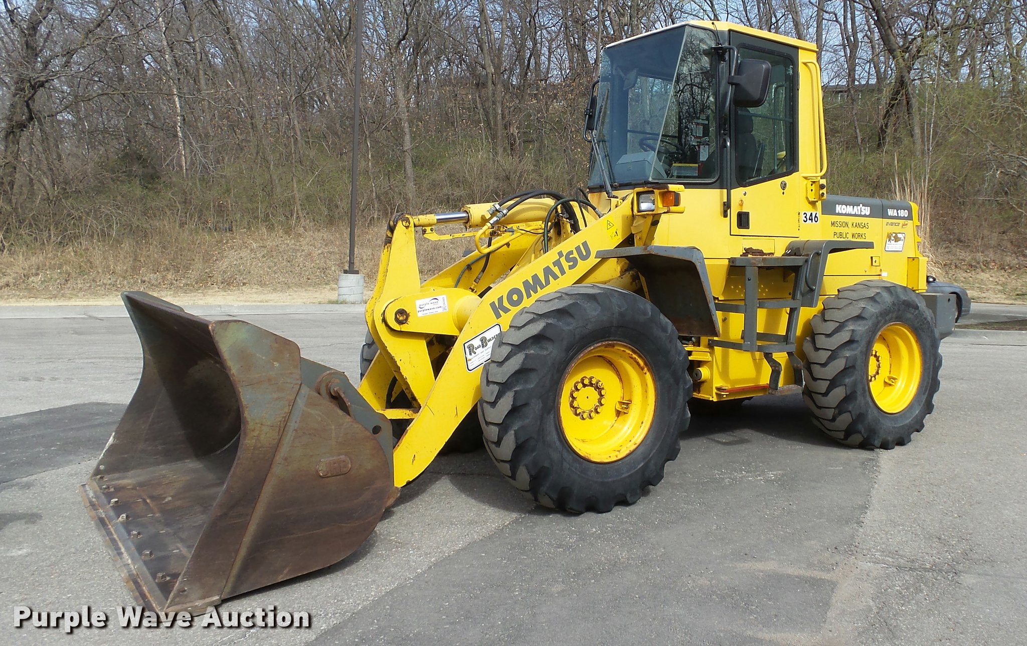 Purple Wave is selling a used Wheel Loader in Kansas. This item is a 2003 Komatsu WA180-3MC wheel loader with the following: 4,372 hours on meter, Komatsu S6D102E-1 5.9L six cylinder turbo diesel engine, 128 HP, Serial 46265927, 4F-4R gears, Enclosed cab, AC and heat, Rear window defrost, Suspension seat, Hand steering controls, Two-lever bucket controls, Wipers, Front and rear work lights, Backup alarm, JRB WA180-3 general purpose bucket, 8'W, 2.5 cu. yd. capacity, Bolt-on cutting edge, Self-leveling, JRB WA250-3 pallet forks, 60"L x 6"W x 2.5" thick, Hydraulic quick coupler, Counterweights, Firestone 7.50-25L-2 tires, Operator manual, Filters, Sluggish on forward side, Rust, Serial A81346, Unit# 346