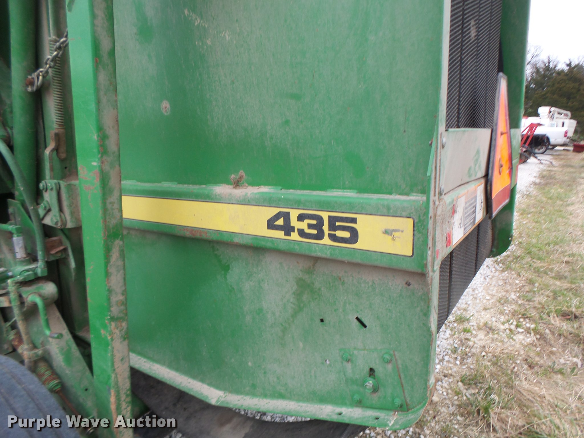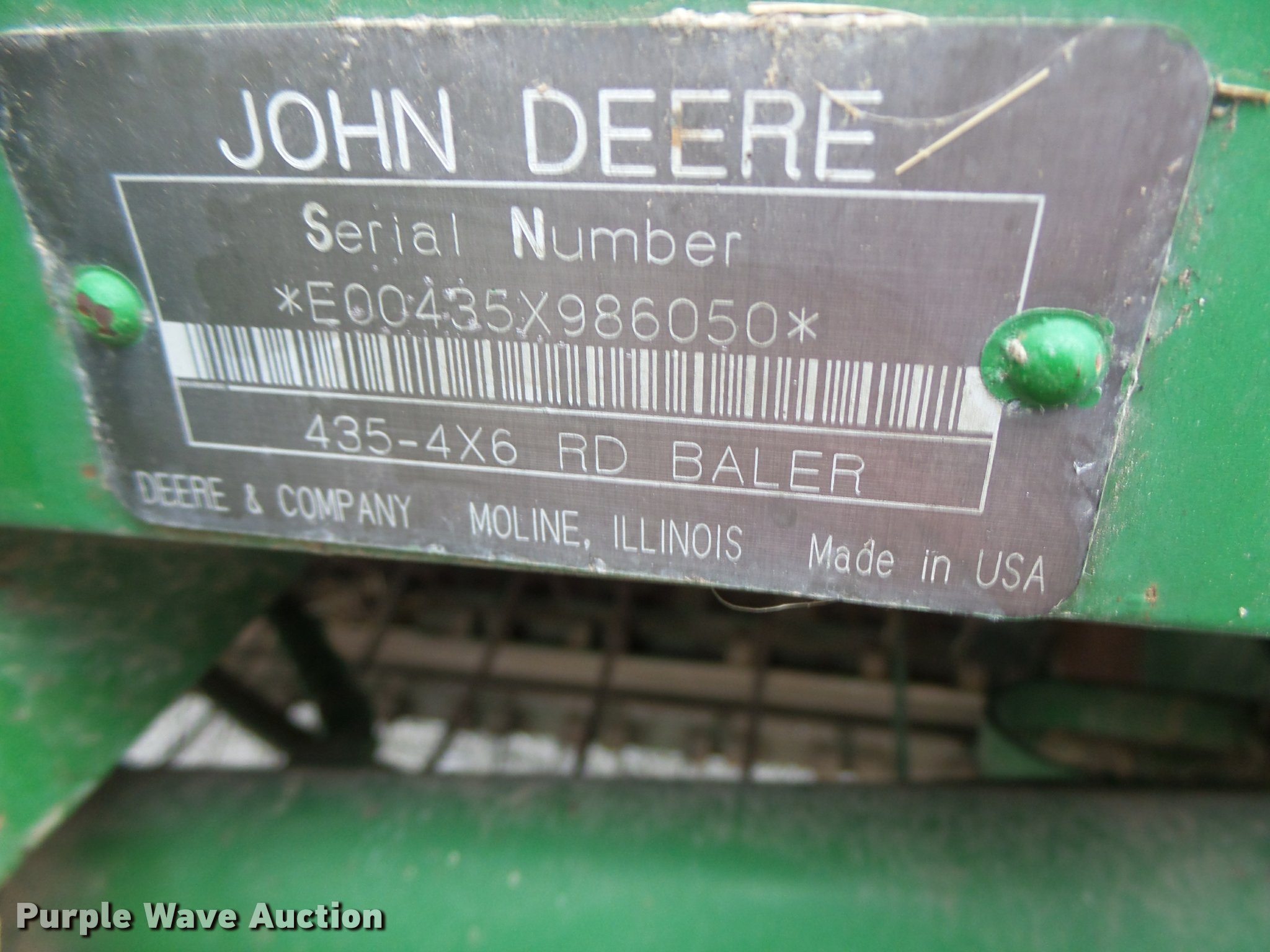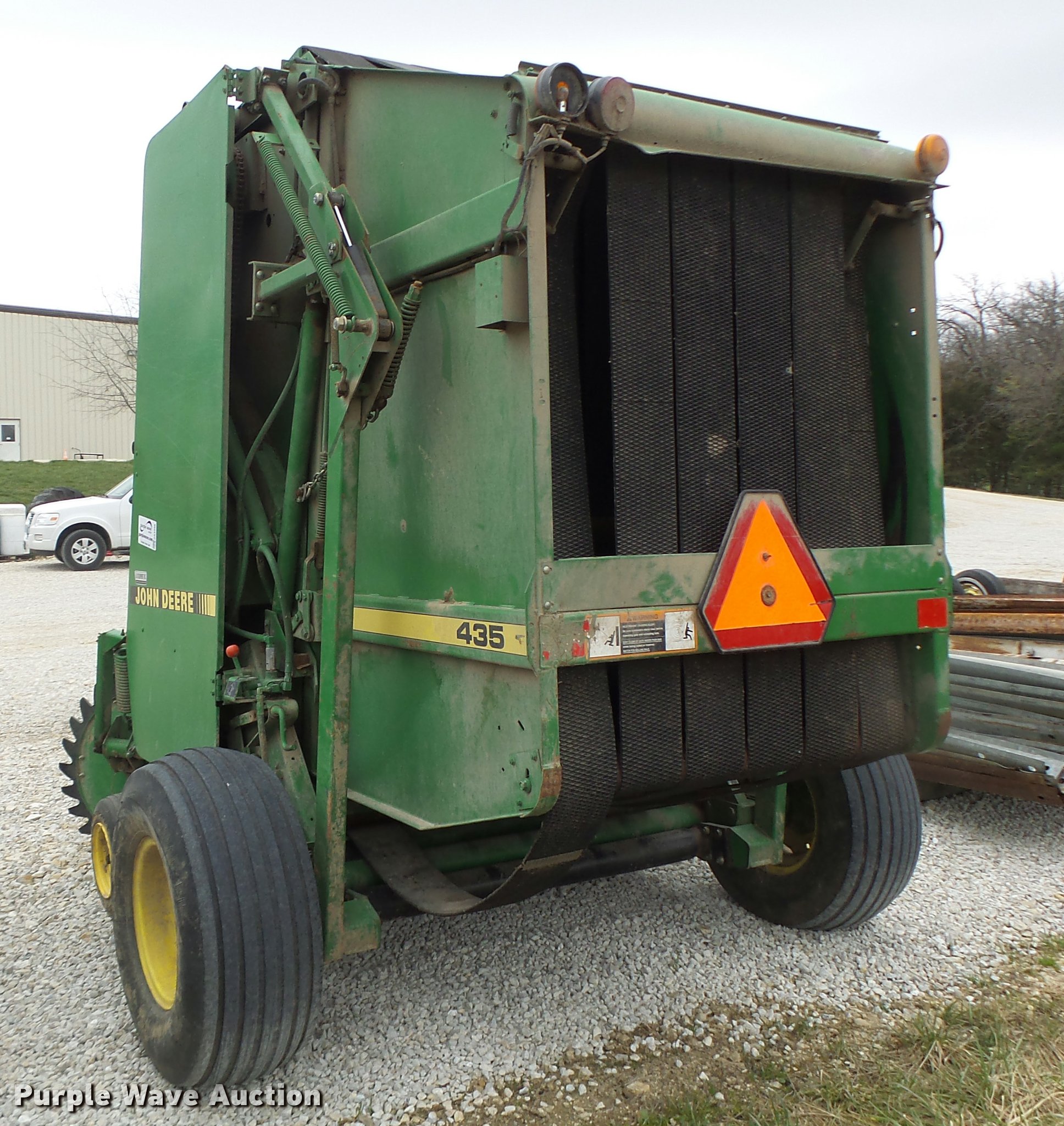 Purple Wave is selling a used Round Baler in Missouri. This item is a 1995 John Deere 435 round baler with the following: 4' x 6' bale capacity, Twine tie, Large 1000 PTO, Pin hitch, 31x13.50-15 NHS tires, Fire damage, Serial E00435X986050