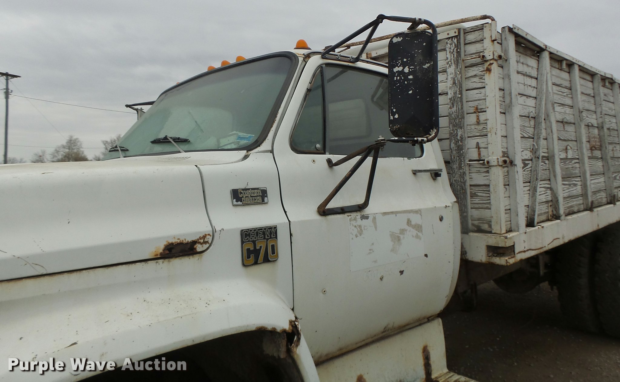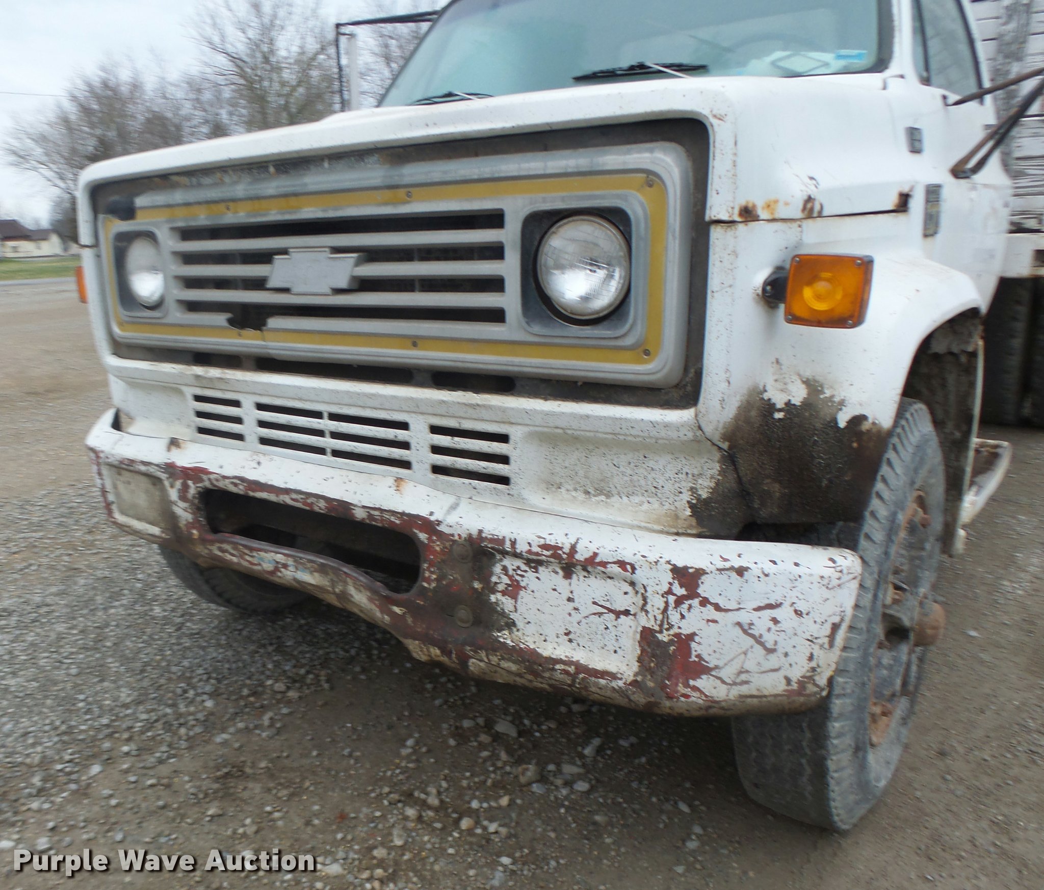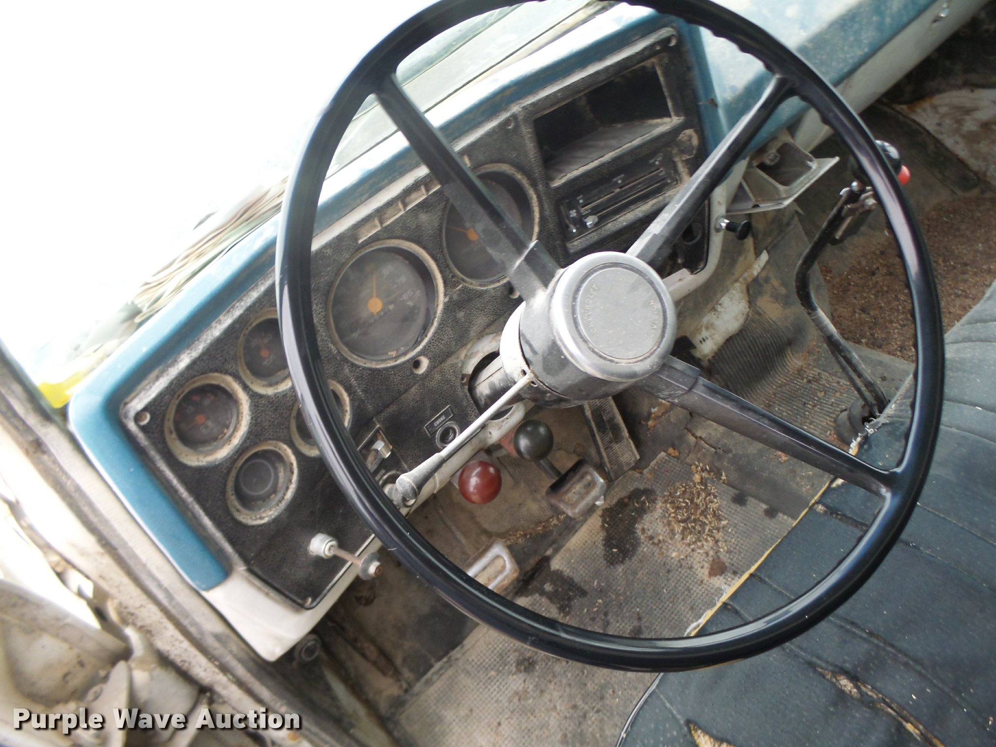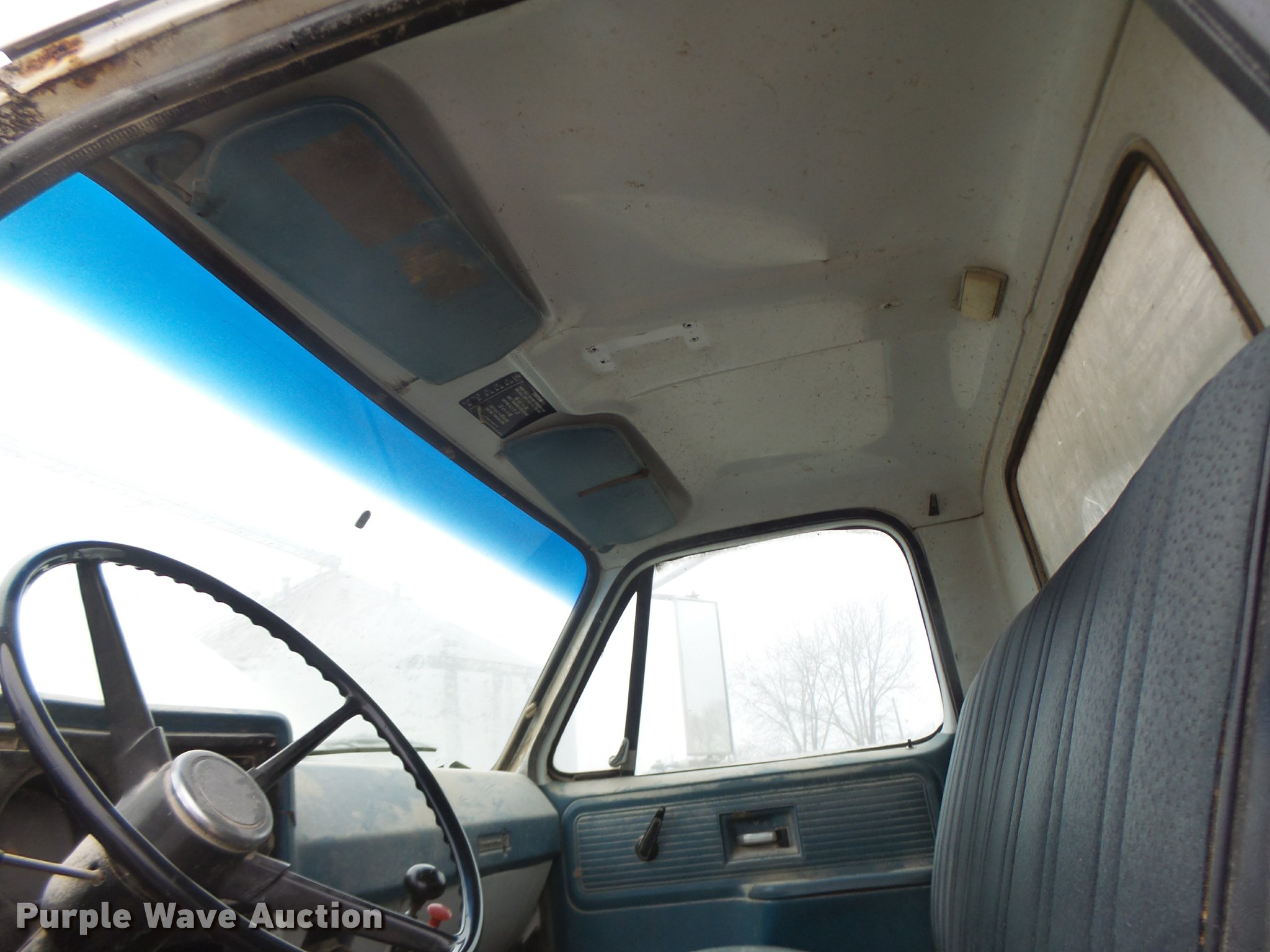 Purple Wave is selling a used Grain Truck in Missouri. This item is a 1979 Chevrolet C70 grain truck with the following: 19,595 miles on odometer, Eight cylinder gas engine, Five speed manual transmission, Single axle, Heat, Suspension seat, 15'L x 8'W grain bed, Single ram hoist, Single fuel tank, Spring suspension, Hydraulic brakes, 9.00-20 tires, Brakes inoperable