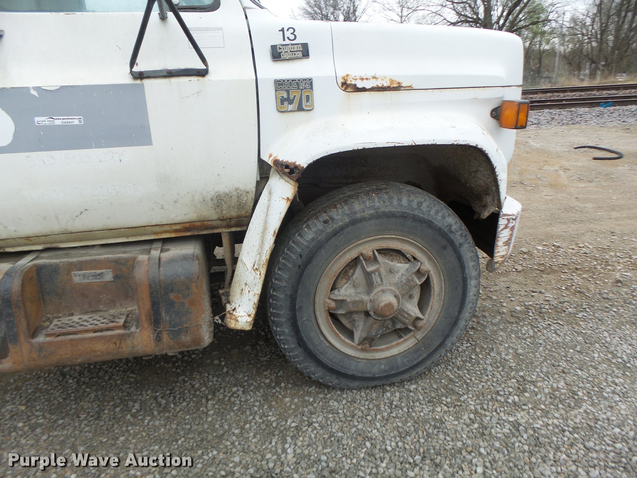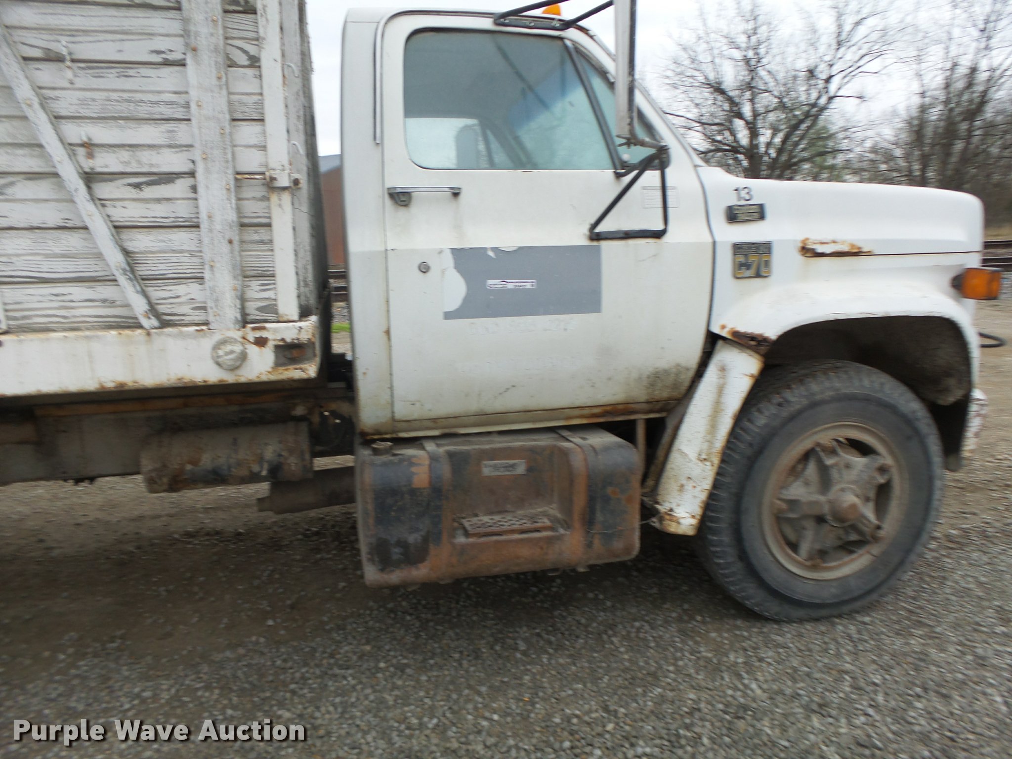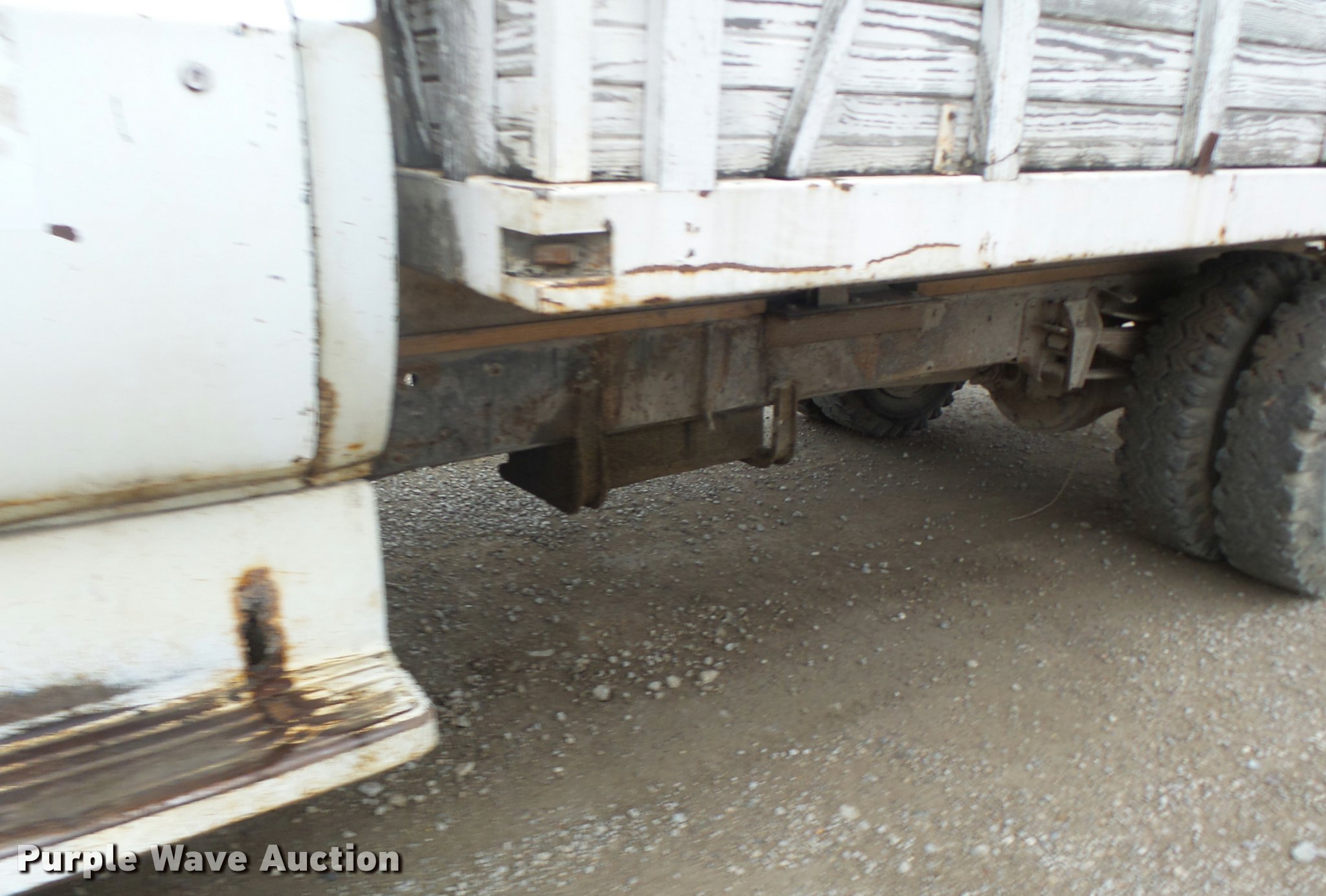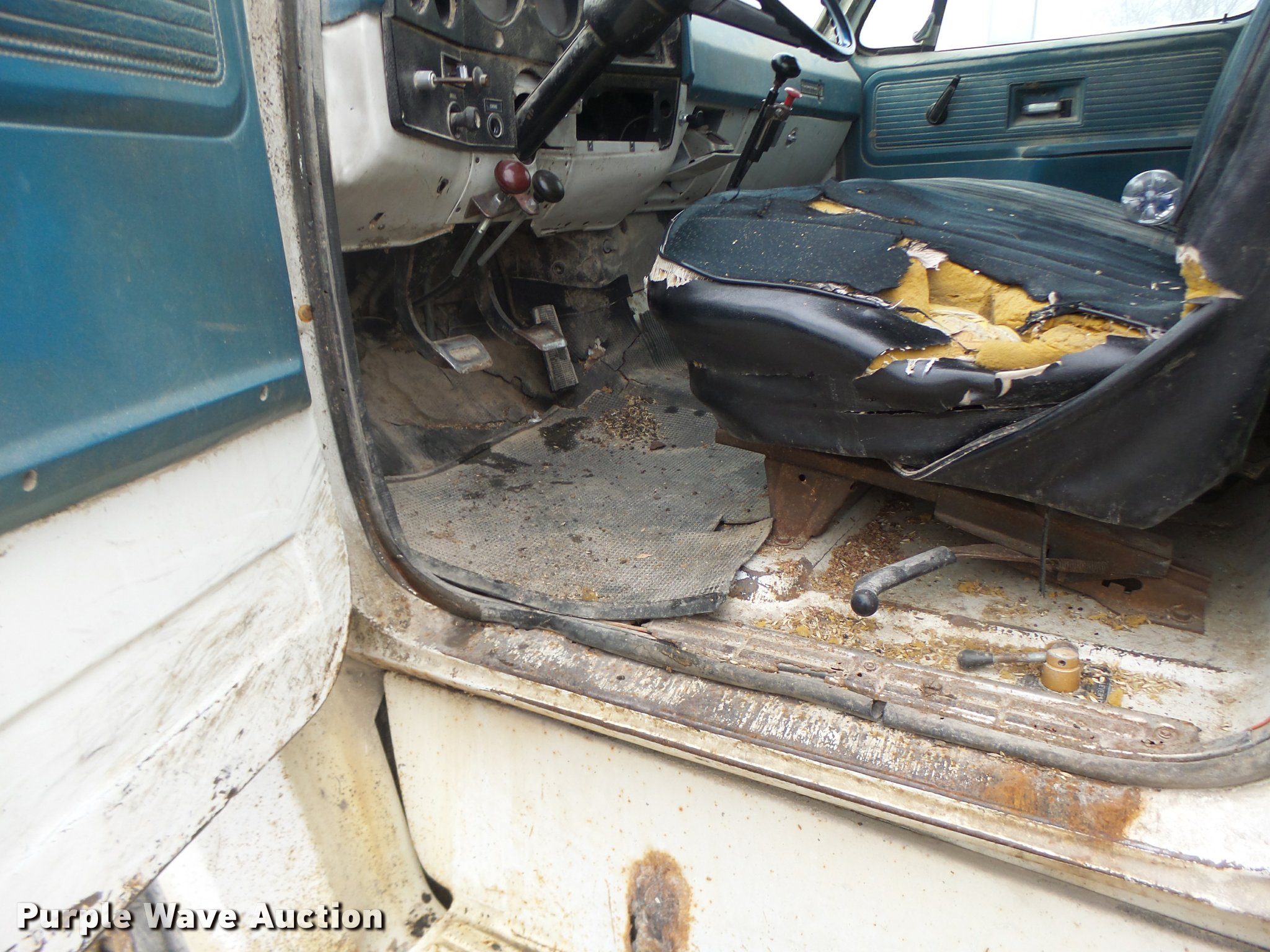 Purple Wave is selling a used Grain Truck in Missouri. This item is a 1979 Chevrolet C70 grain truck with the following: 19,595 miles on odometer, Eight cylinder gas engine, Five speed manual transmission, Single axle, Heat, Suspension seat, 15'L x 8'W grain bed, Single ram hoist, Single fuel tank, Spring suspension, Hydraulic brakes, 9.00-20 tires, Brakes inoperable