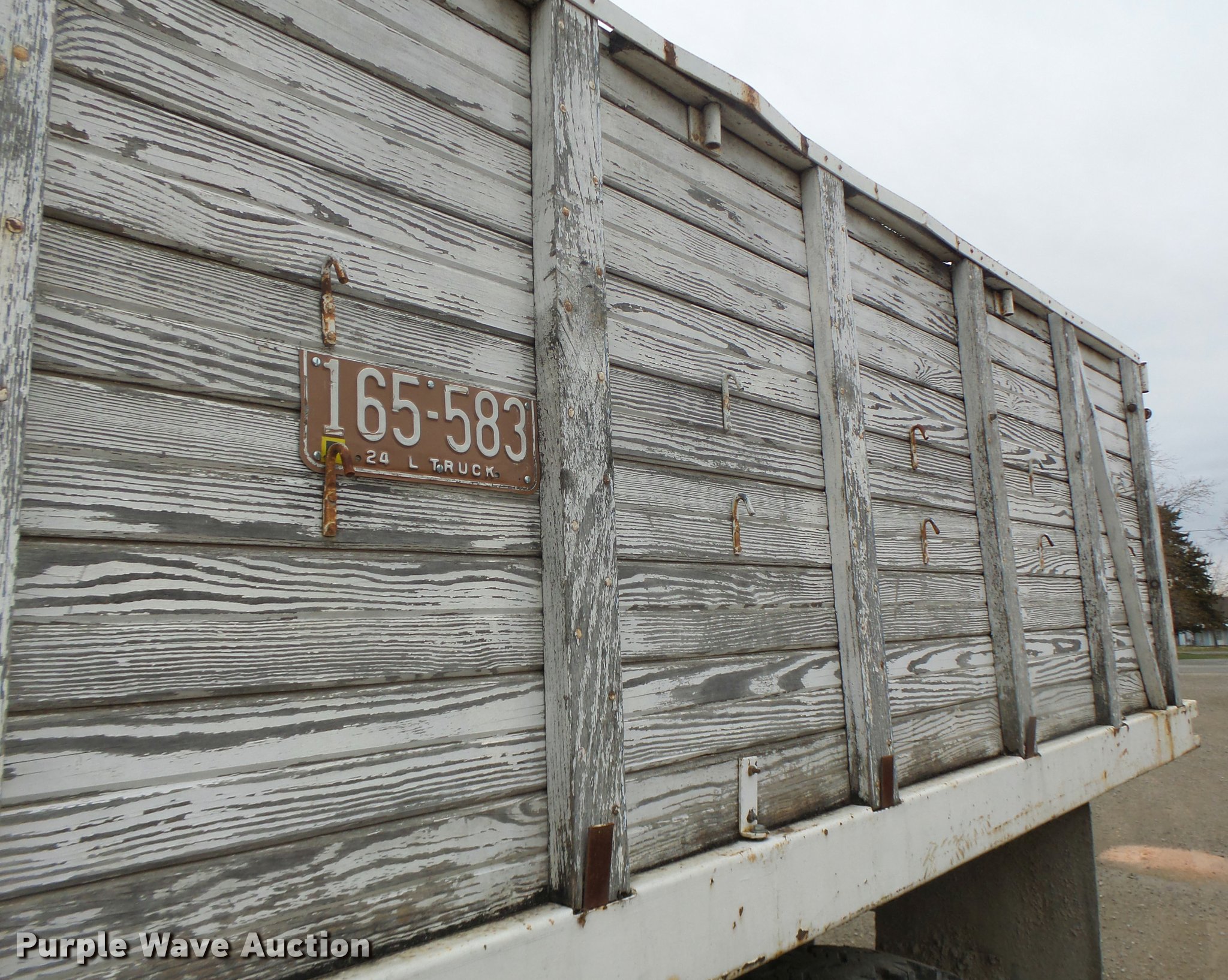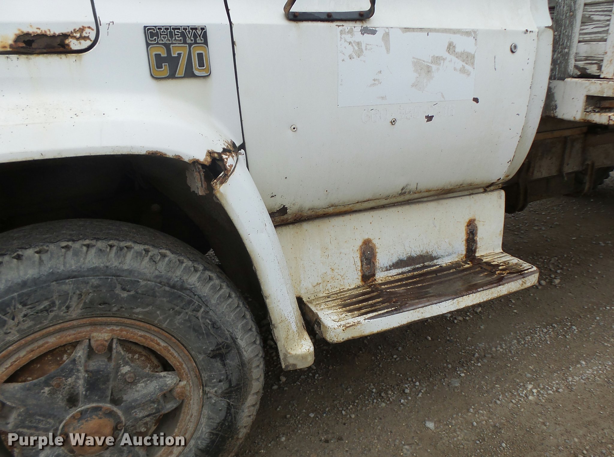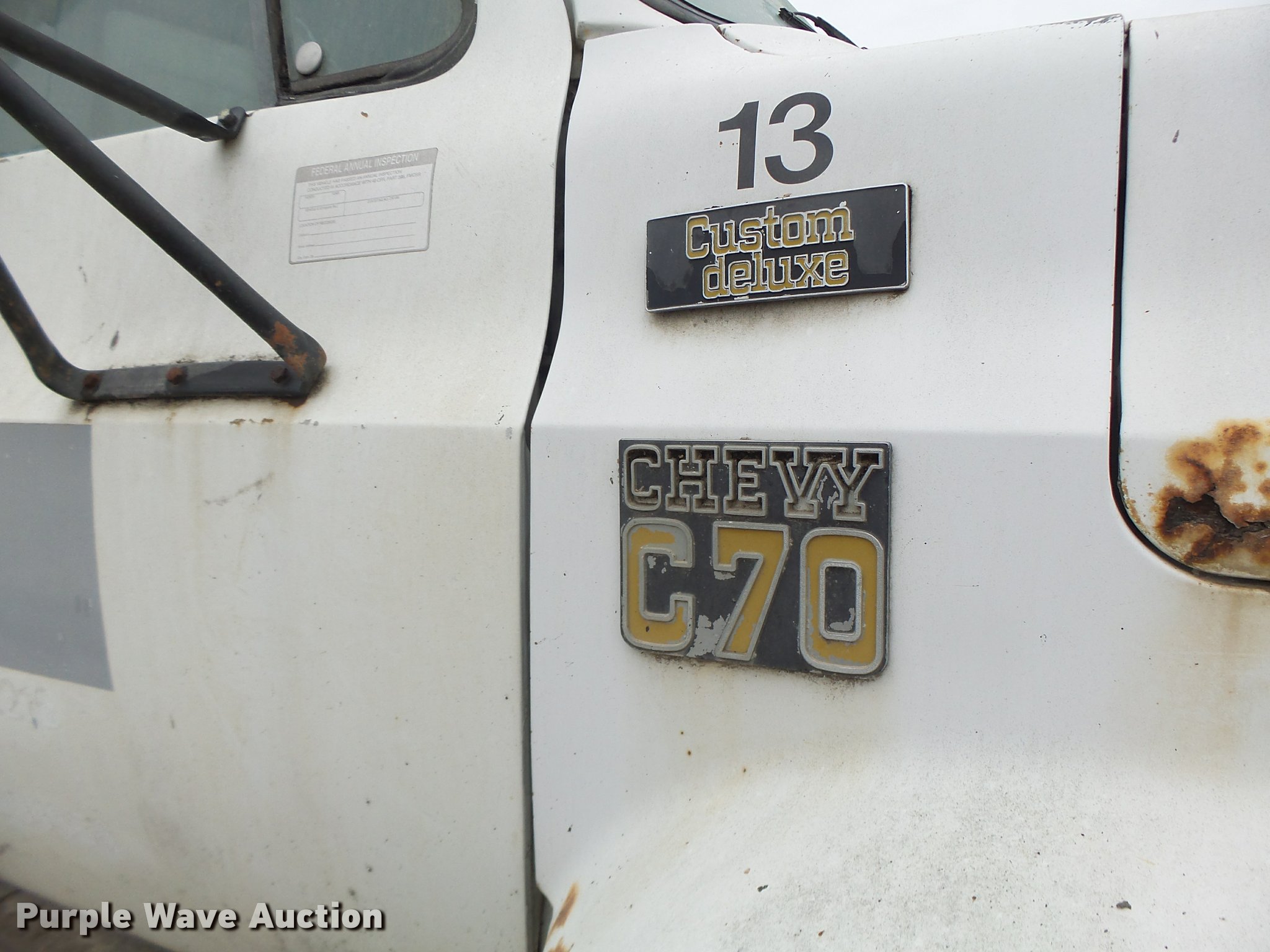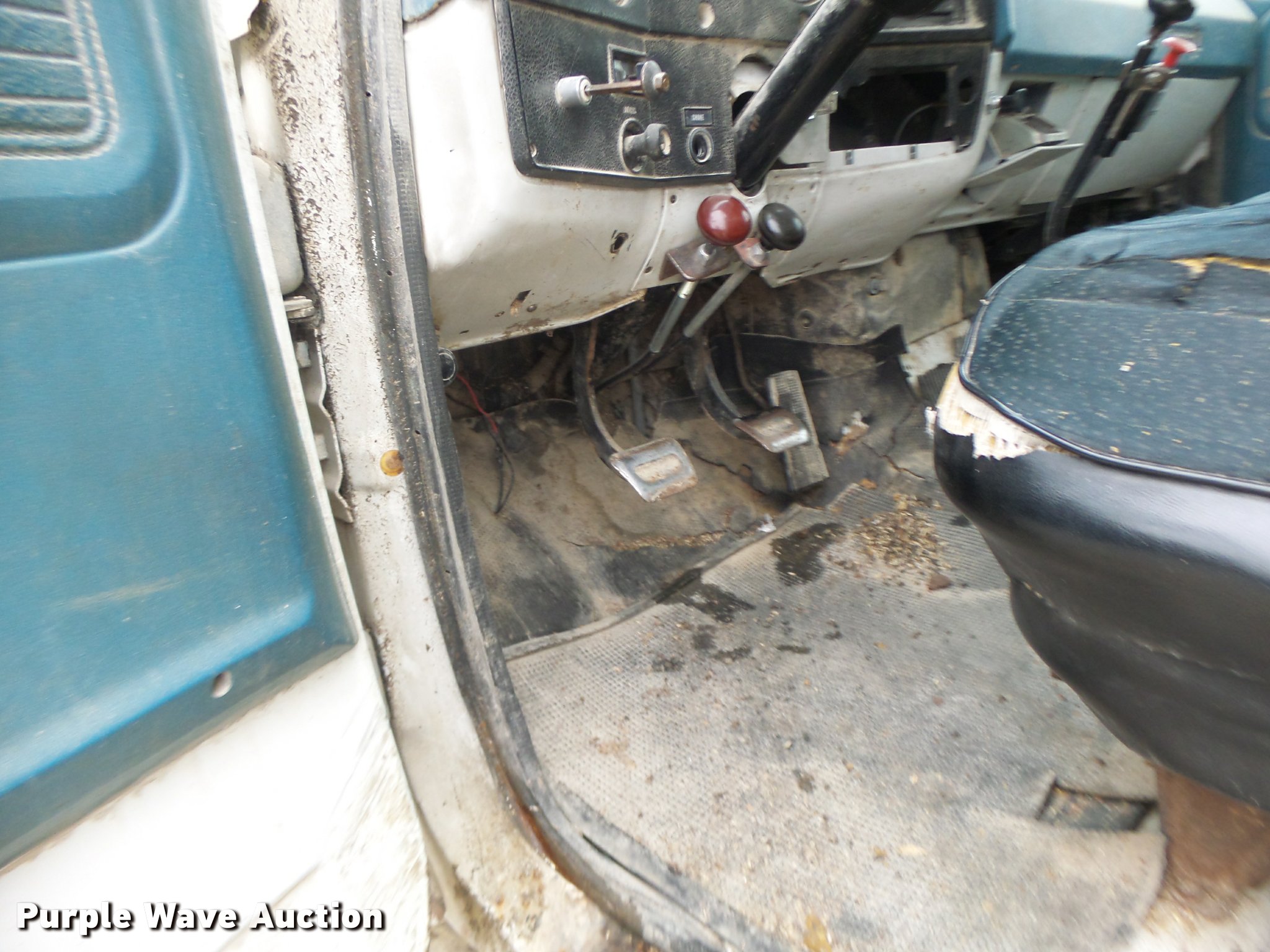 Purple Wave is selling a used Grain Truck in Missouri. This item is a 1979 Chevrolet C70 grain truck with the following: 19,595 miles on odometer, Eight cylinder gas engine, Five speed manual transmission, Single axle, Heat, Suspension seat, 15'L x 8'W grain bed, Single ram hoist, Single fuel tank, Spring suspension, Hydraulic brakes, 9.00-20 tires, Brakes inoperable
