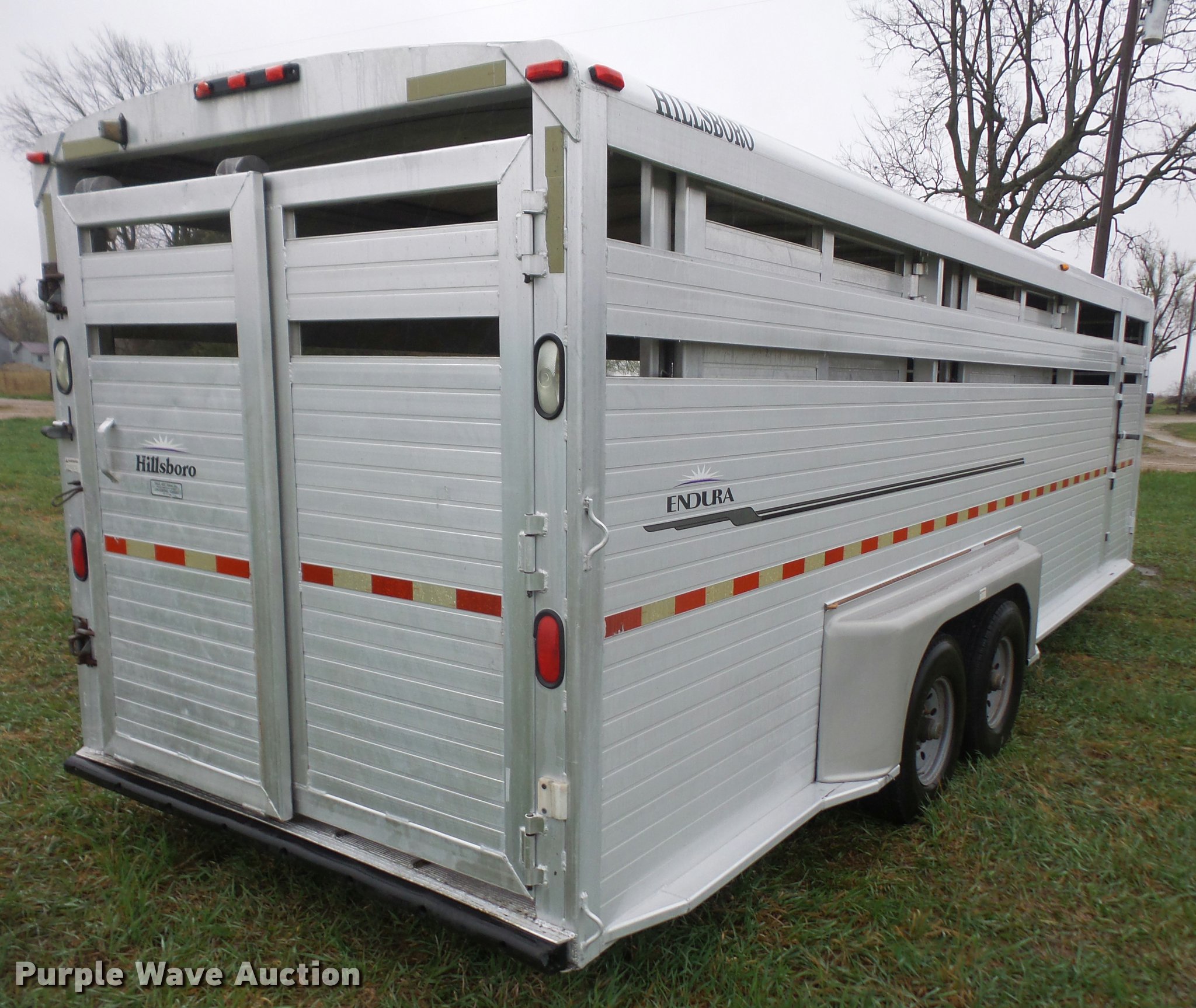 Purple Wave is selling a used Livestock Trailer in Kansas. This item is a 1999 Hillsboro Endura livestock trailer with the following: 24'L x 7'W, (2) gates, Side door, Full swing rear door with slider gate, Aluminum construction, Gooseneck hitch, Single leg landing gear, Spring suspension, Electric brakes, Tandem axle, 7.50R16 tires, GVWR 15,600 lbs, GAWR 6,084 lbs