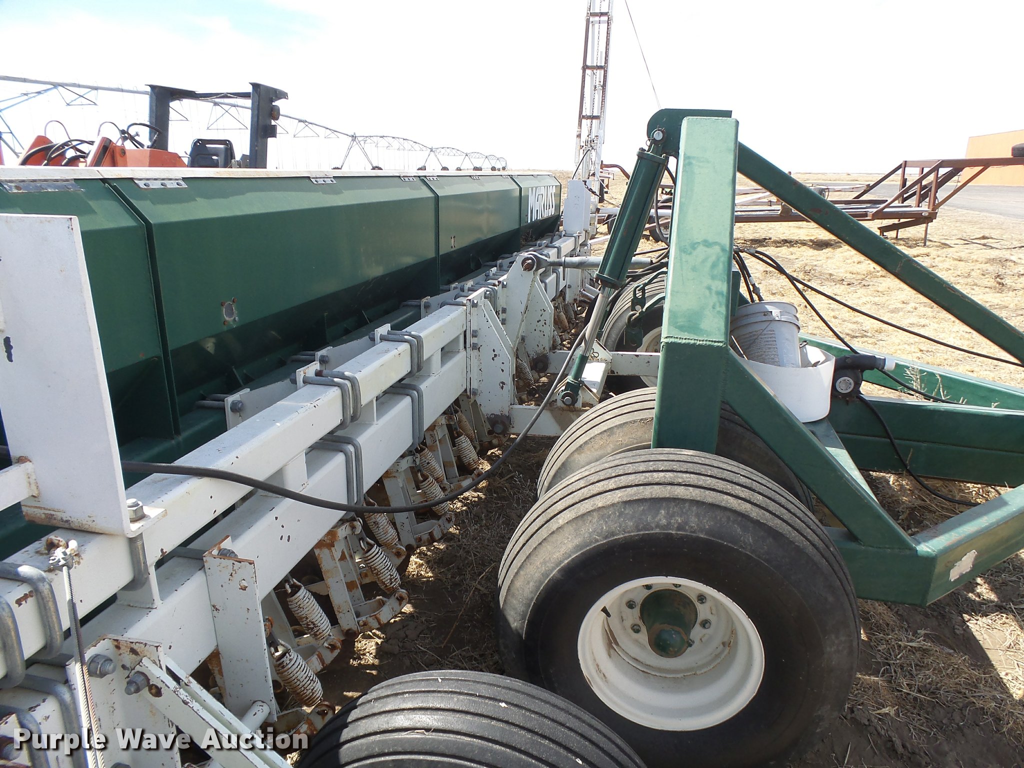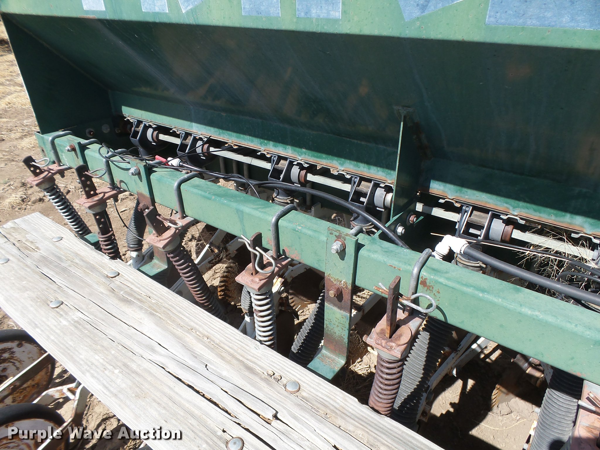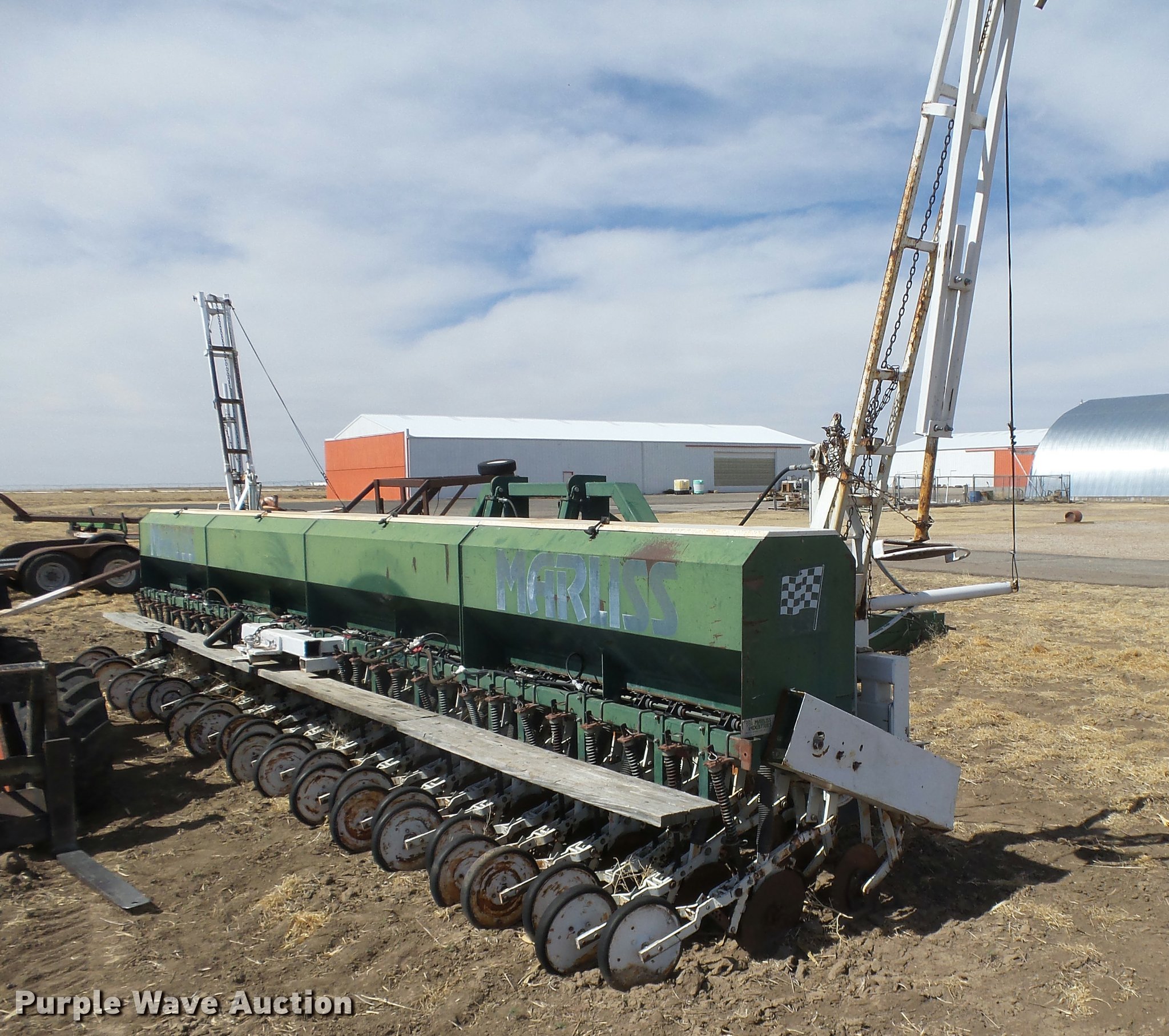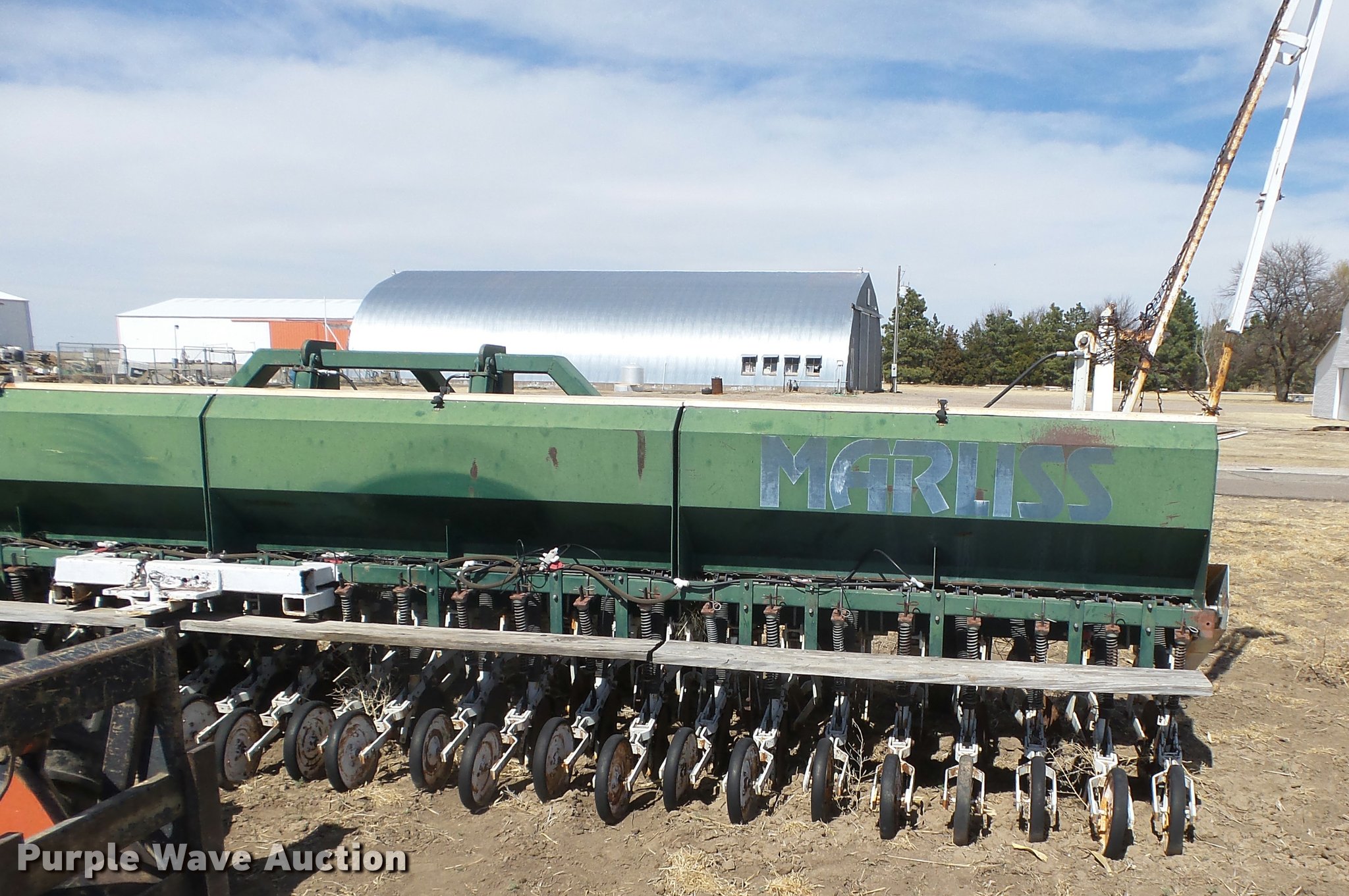 Purple Wave is selling a used Grain Drill or Seeder in Kansas. This item is a Marliss grain drill with the following: 26'W, 32 row units, 10" row spacing, Marker arms, Individual seed hoppers, HD spring down pressure, Double disk openers, Single rubber closing system, Hypro hydraulic driven pump, (4) 14L-16.1 transport tires, (4) 9.5L-15 drive/outside tires, Serial 3154