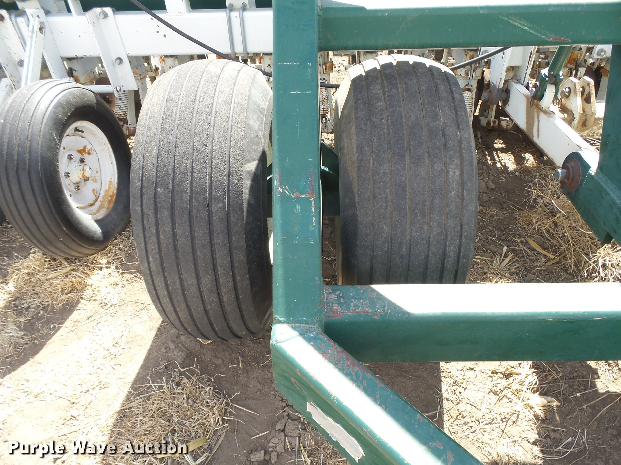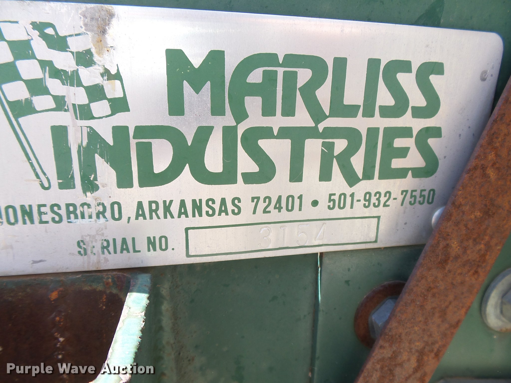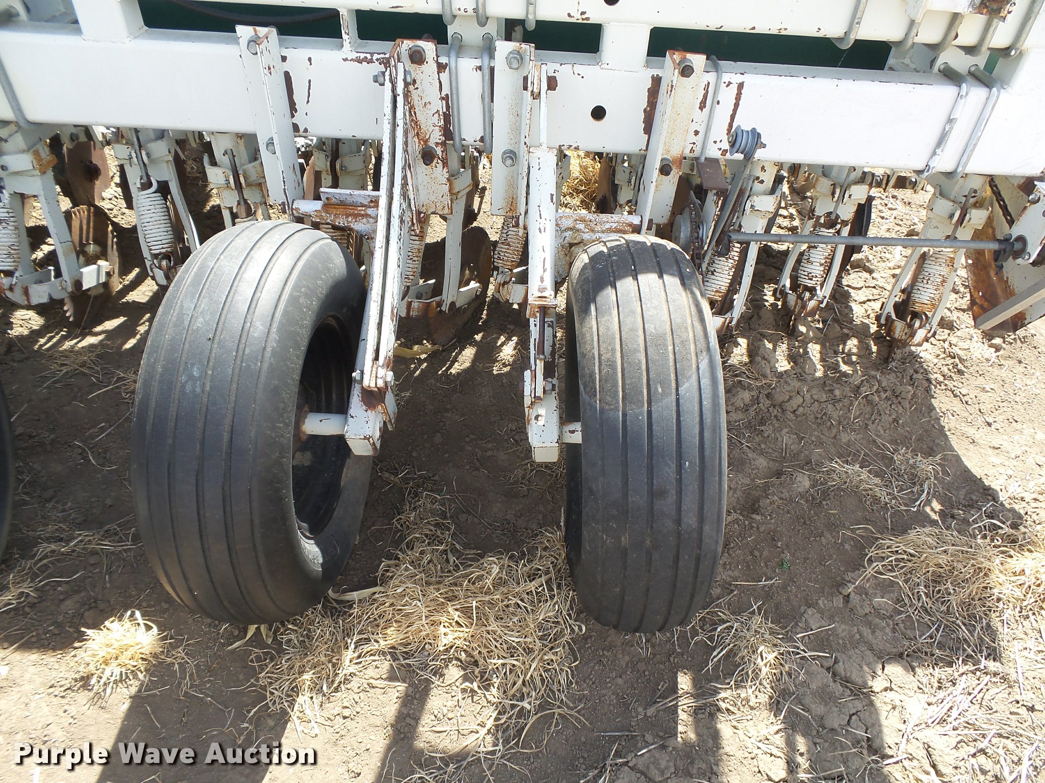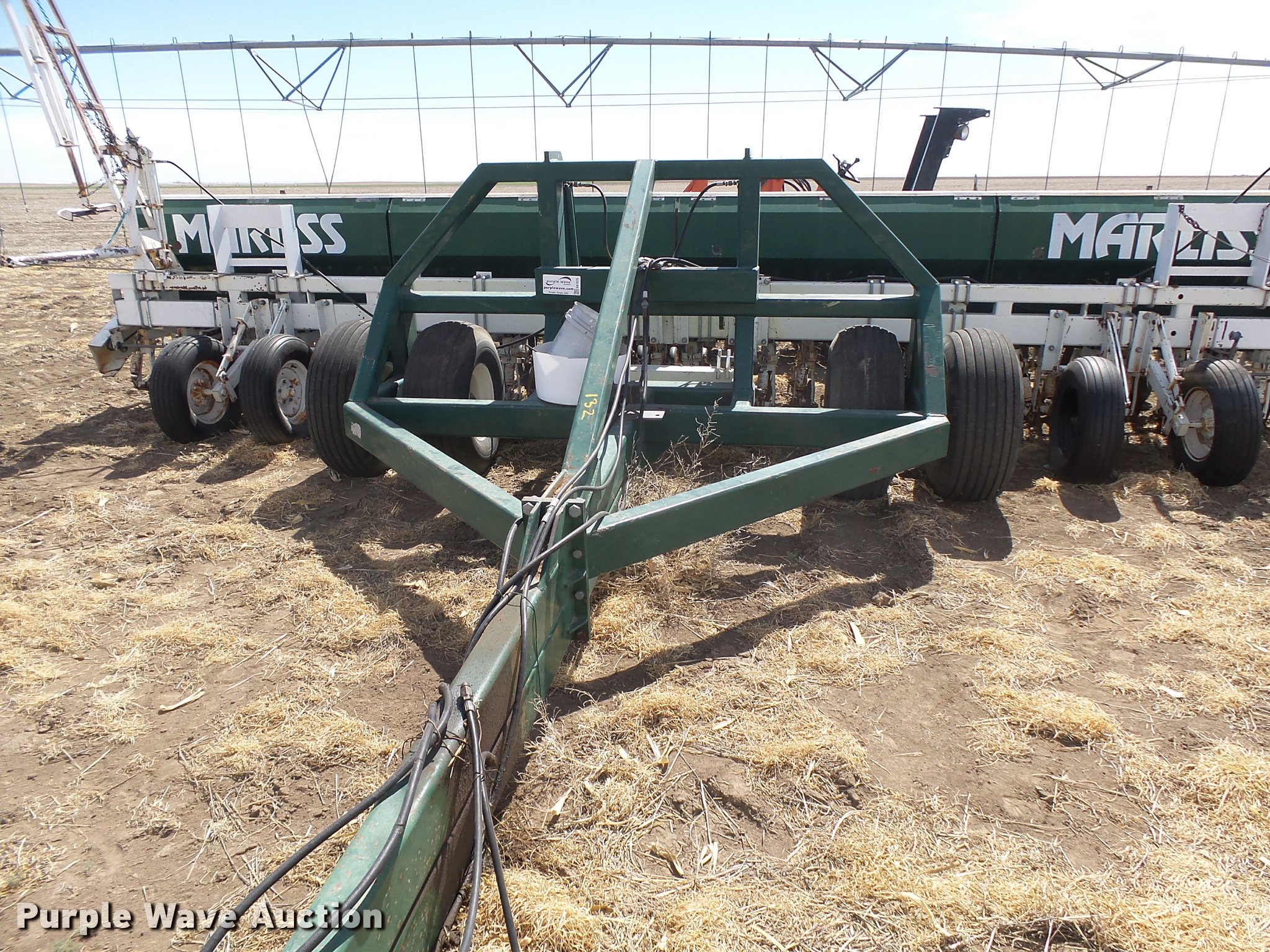 Purple Wave is selling a used Grain Drill or Seeder in Kansas. This item is a Marliss grain drill with the following: 26'W, 32 row units, 10" row spacing, Marker arms, Individual seed hoppers, HD spring down pressure, Double disk openers, Single rubber closing system, Hypro hydraulic driven pump, (4) 14L-16.1 transport tires, (4) 9.5L-15 drive/outside tires, Serial 3154