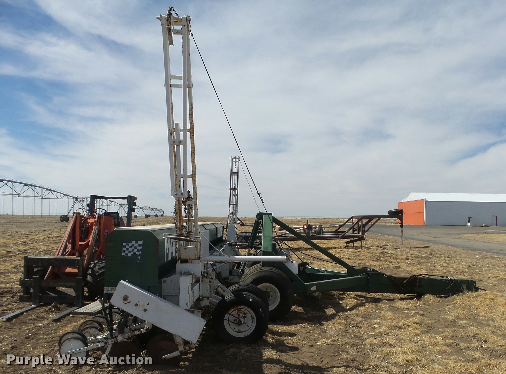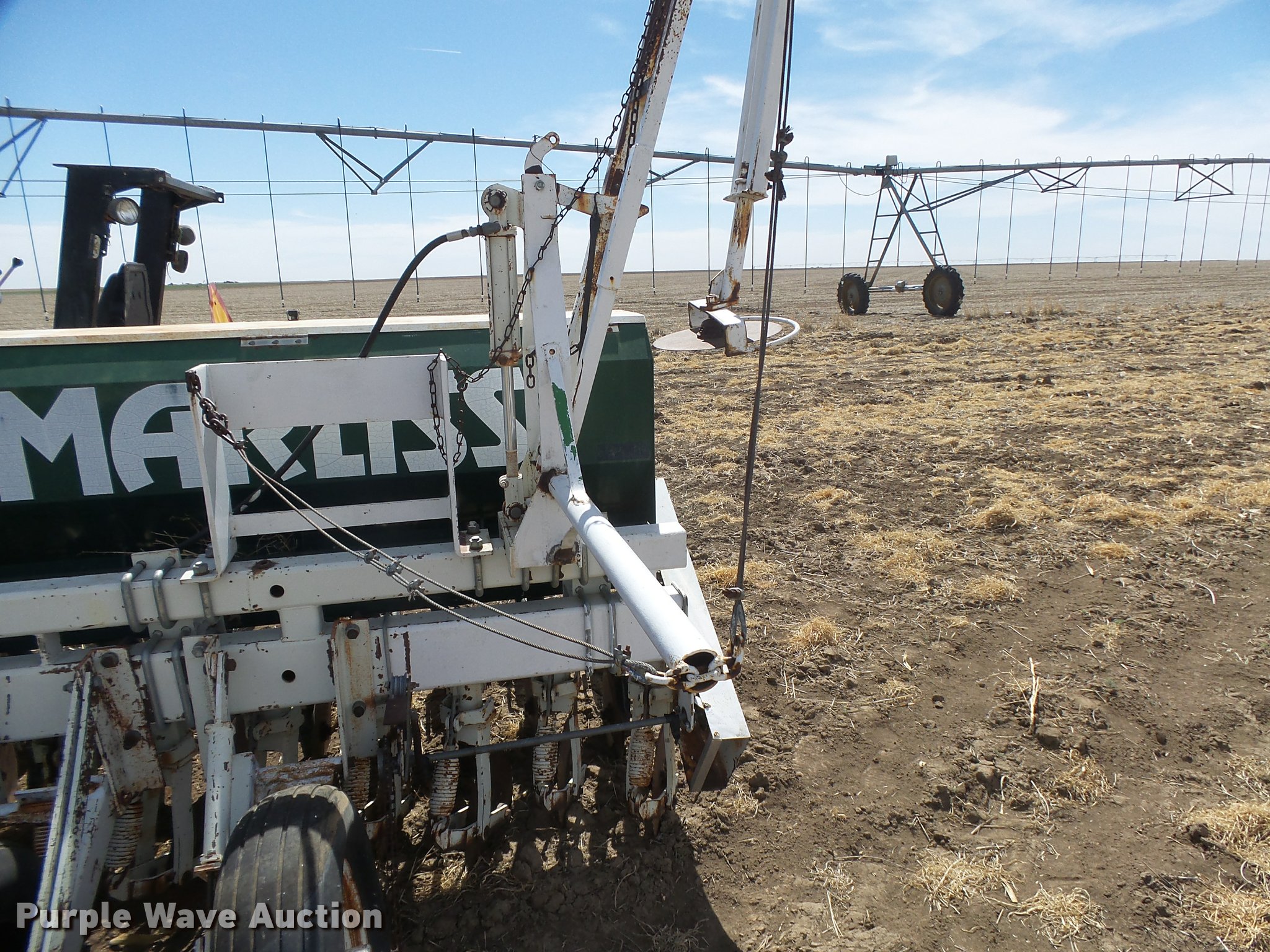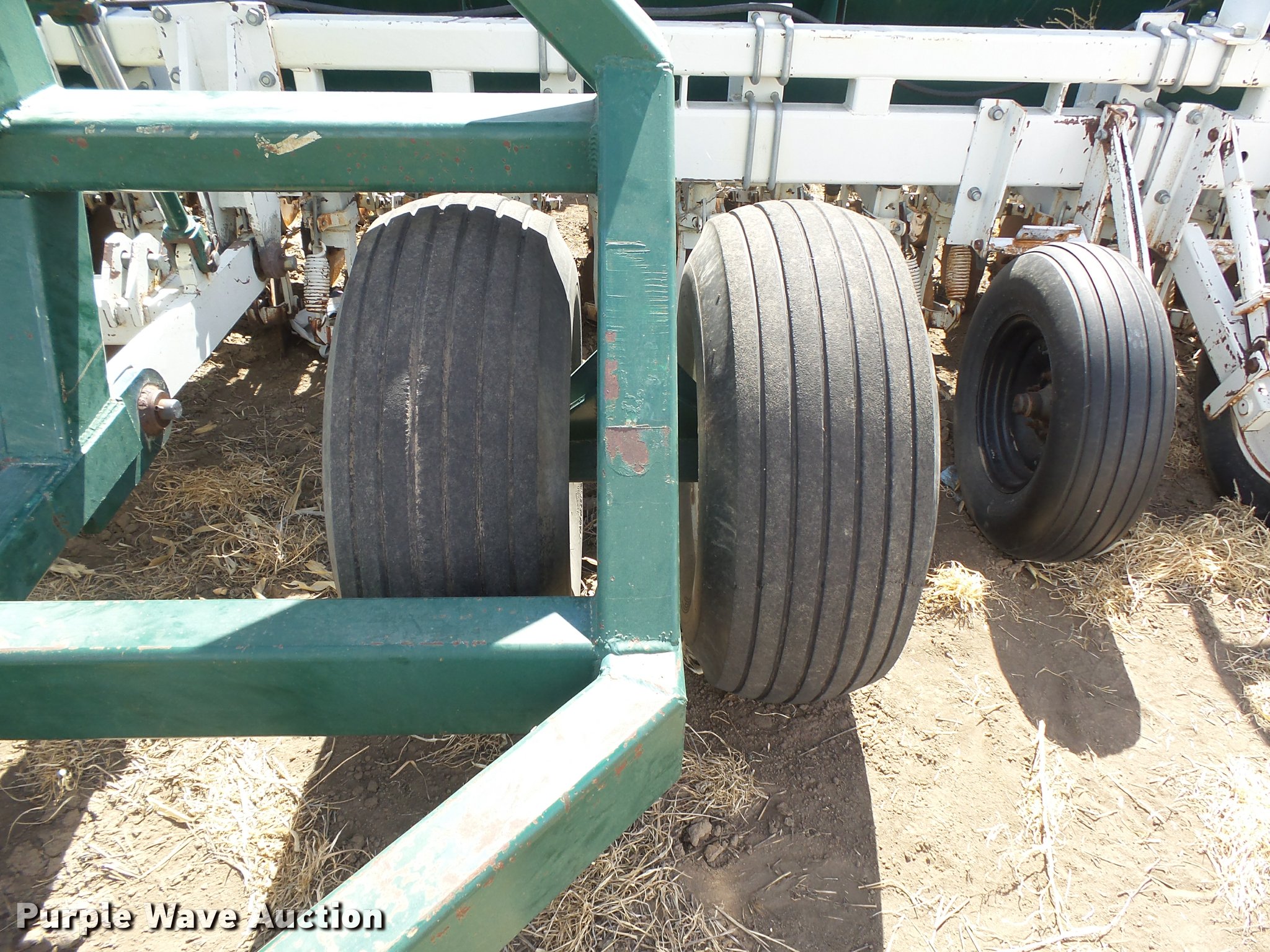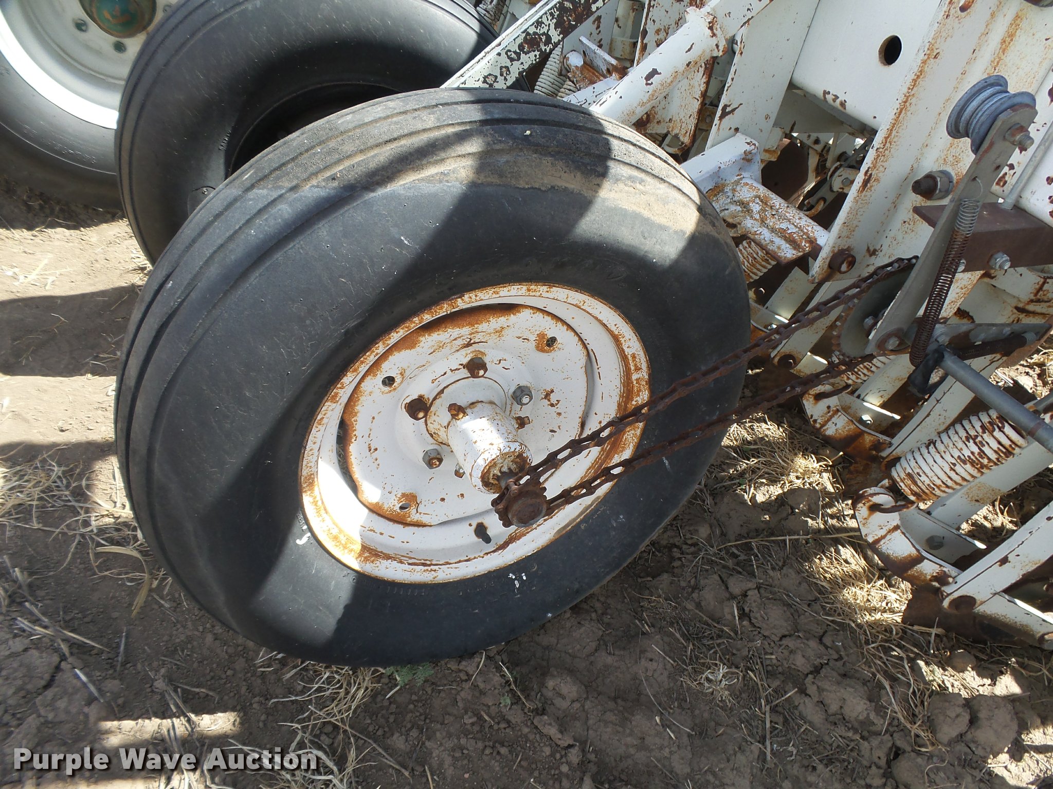 Purple Wave is selling a used Grain Drill or Seeder in Kansas. This item is a Marliss grain drill with the following: 26'W, 32 row units, 10" row spacing, Marker arms, Individual seed hoppers, HD spring down pressure, Double disk openers, Single rubber closing system, Hypro hydraulic driven pump, (4) 14L-16.1 transport tires, (4) 9.5L-15 drive/outside tires, Serial 3154