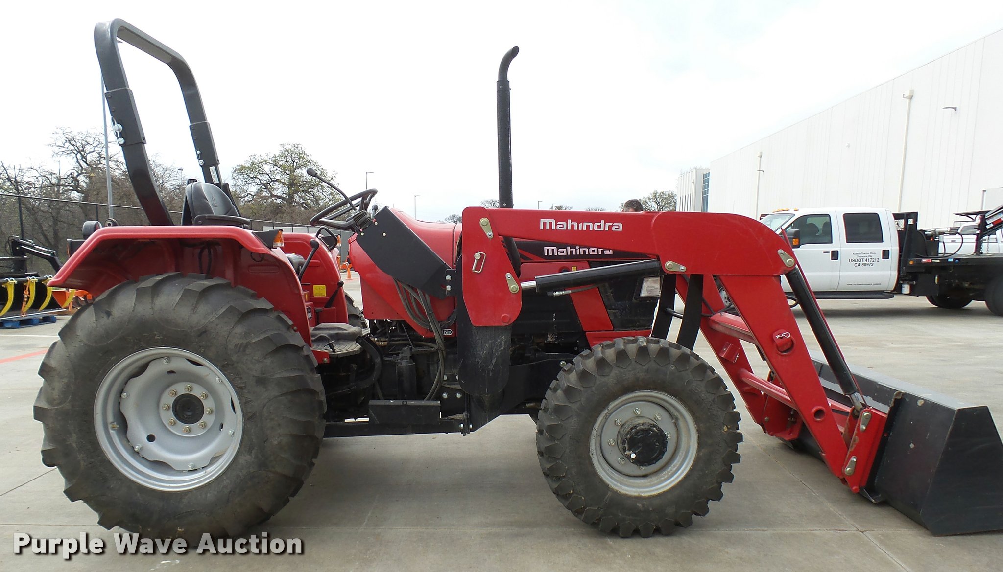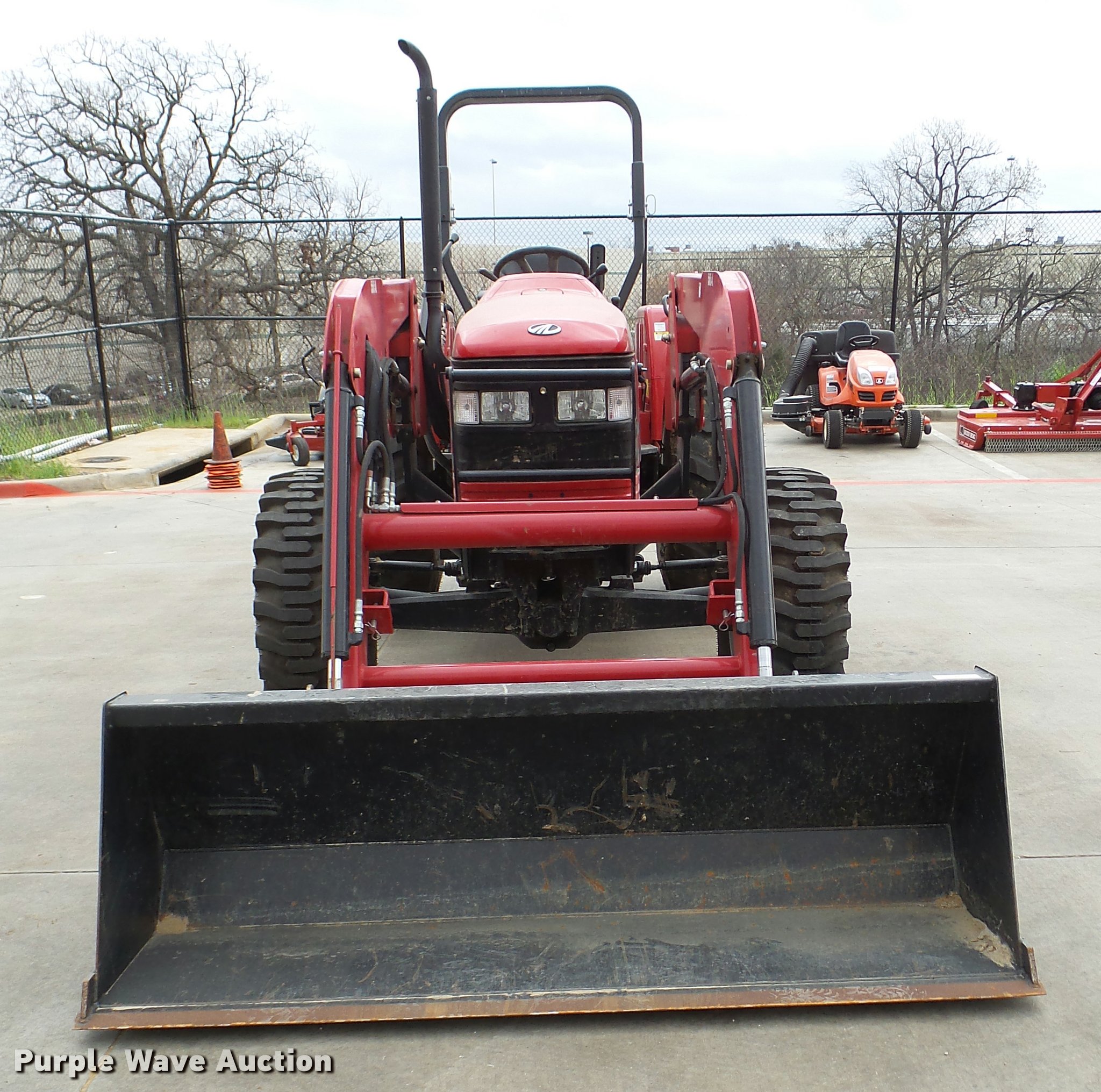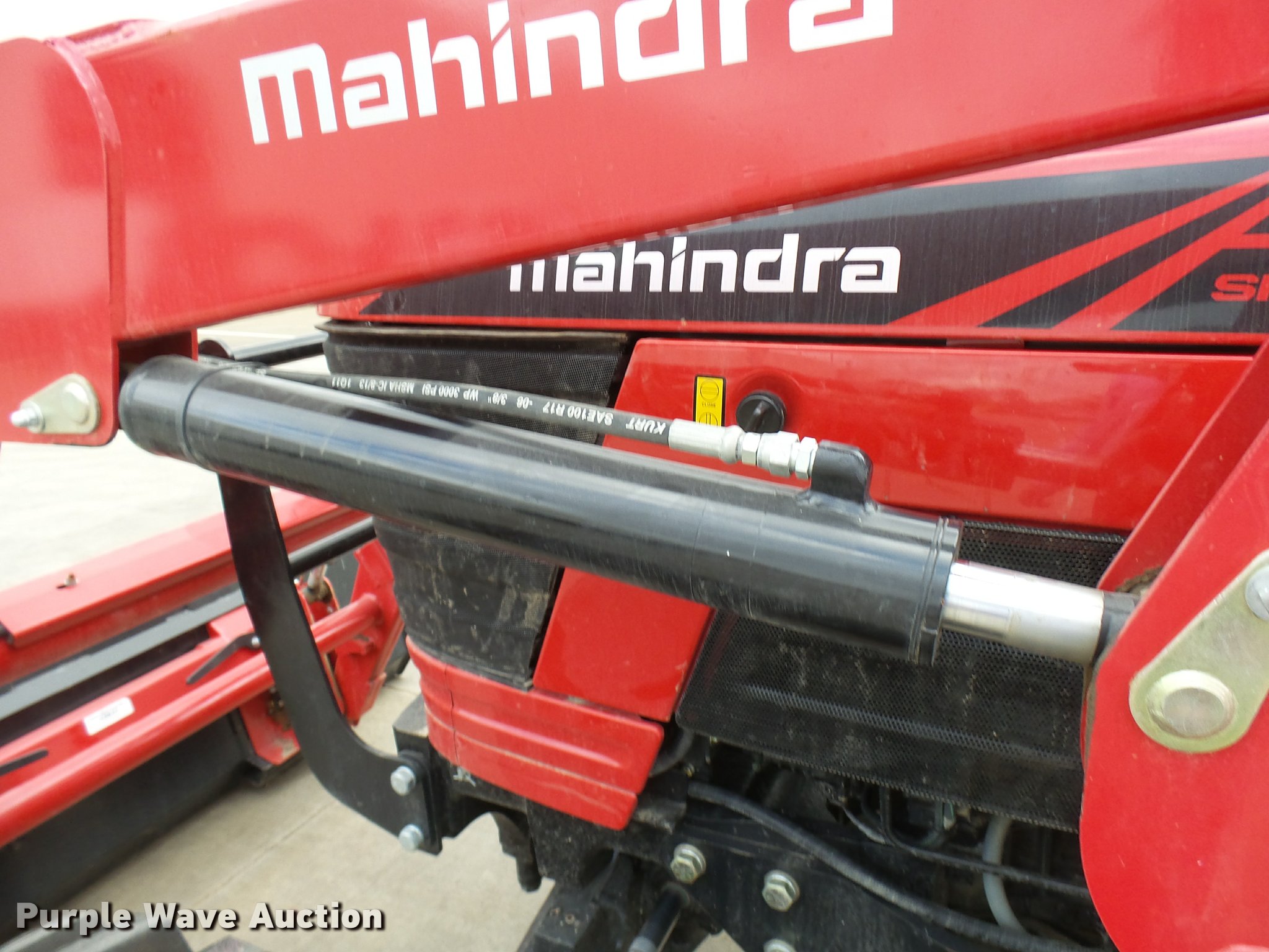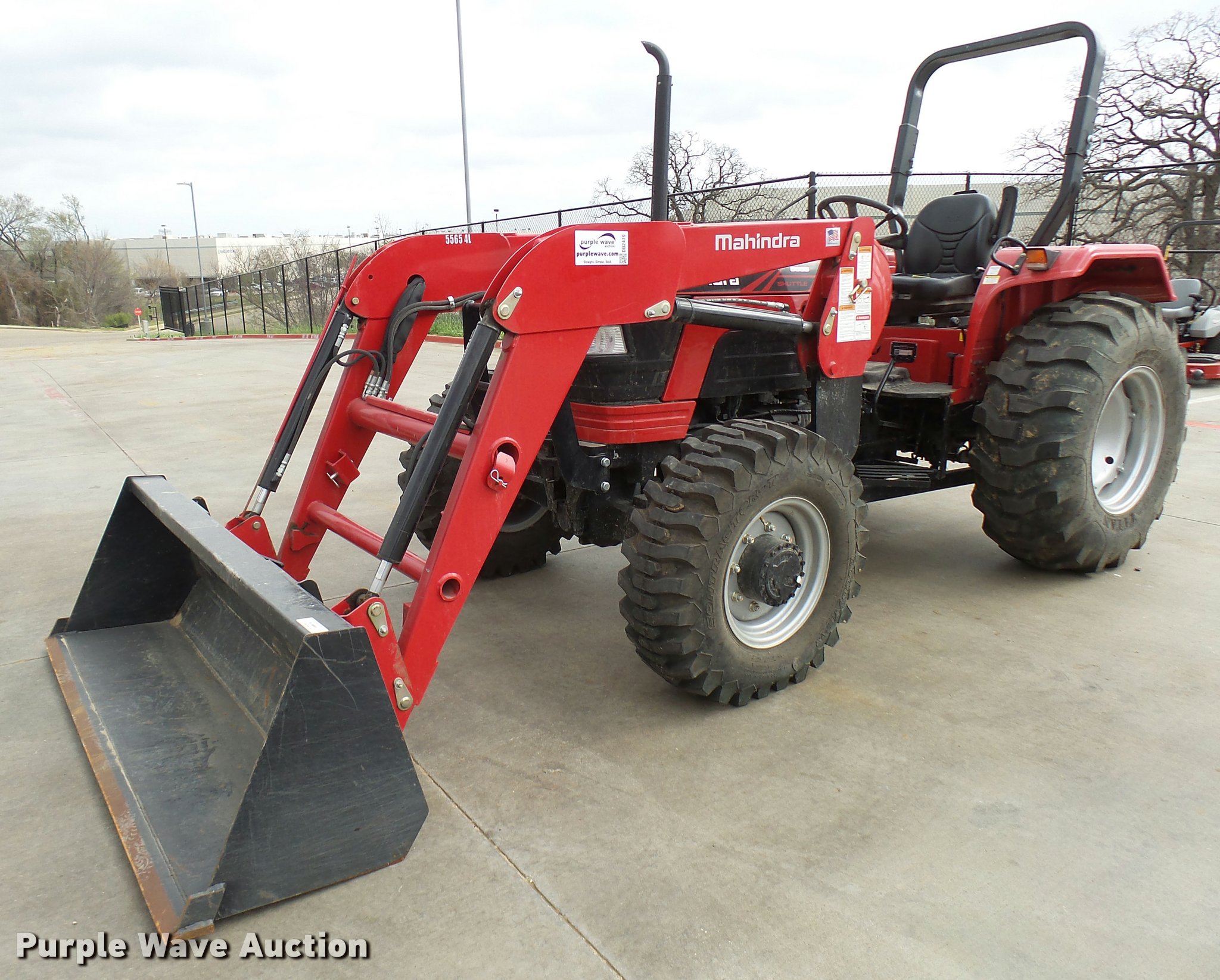 Purple Wave is selling a used Tractor in Texas. This item is a Mahindra 5555 MFWD tractor with the following: 81 hours on meter, 2.7L three cylinder turbo diesel engine, Synchro transmission, 8F-8R gears, Left-hand reverser, Four wheel drive, Suspension seat, Mahindra 5565-4L loader, 78"W bucket, Quick attach, Joystick controls, Serial 15248618, Three point, Top link, 540 PTO, Rear hydraulic remote, 12.5-80-18 front tires, 16.9-24 rear tires, Serial S30TY1613