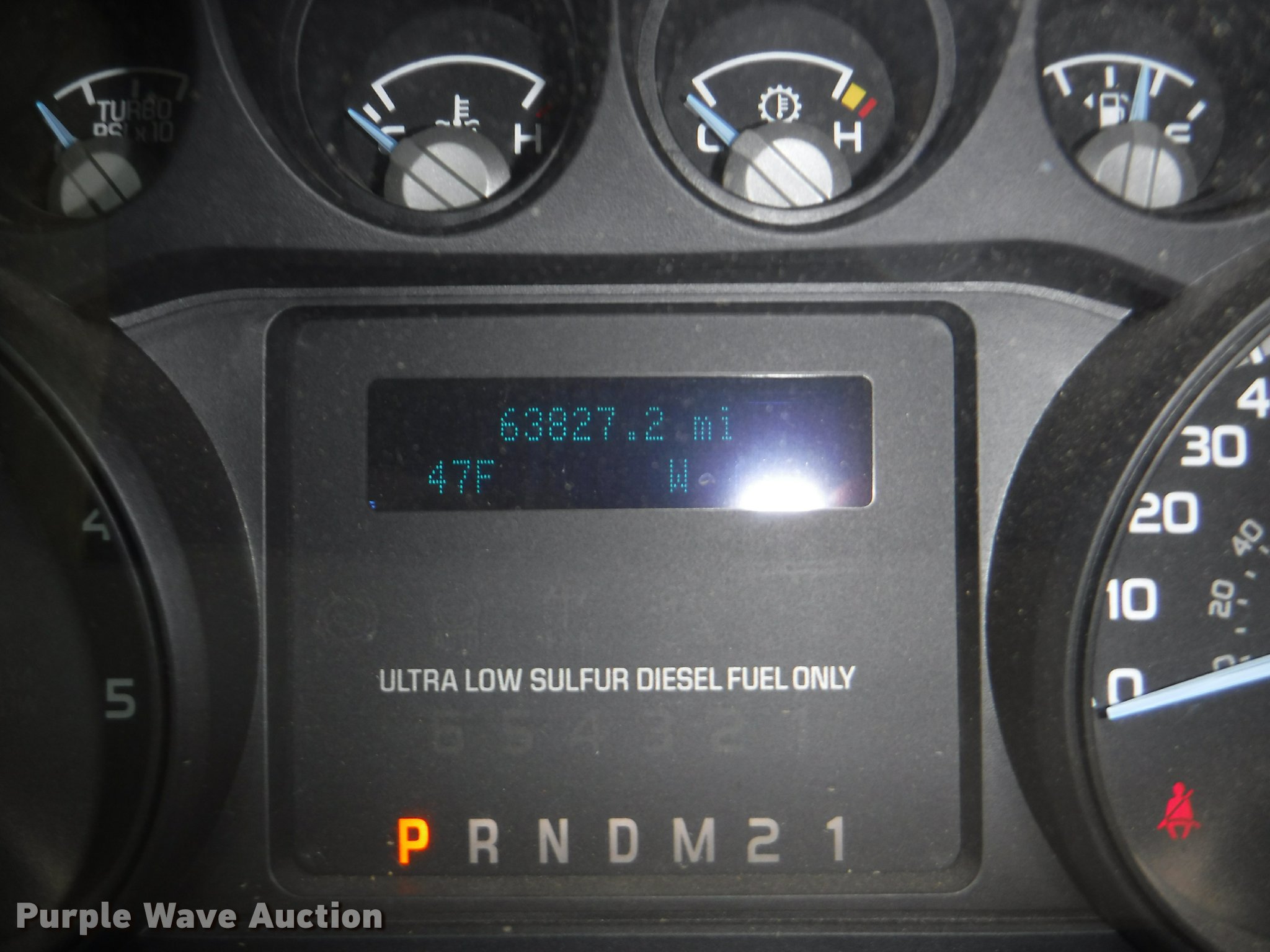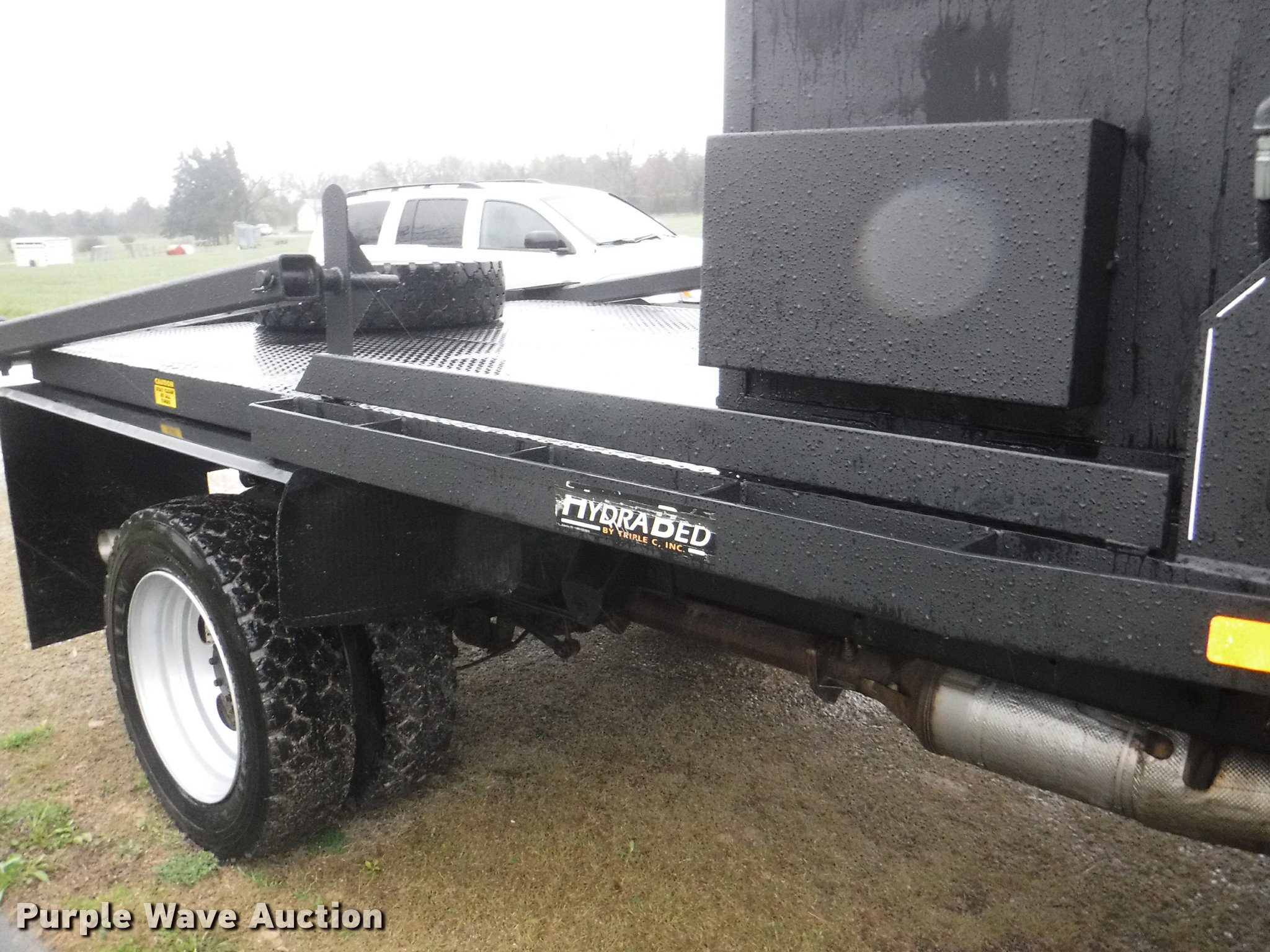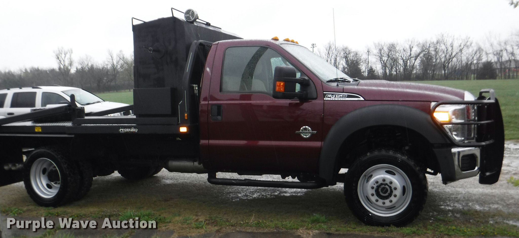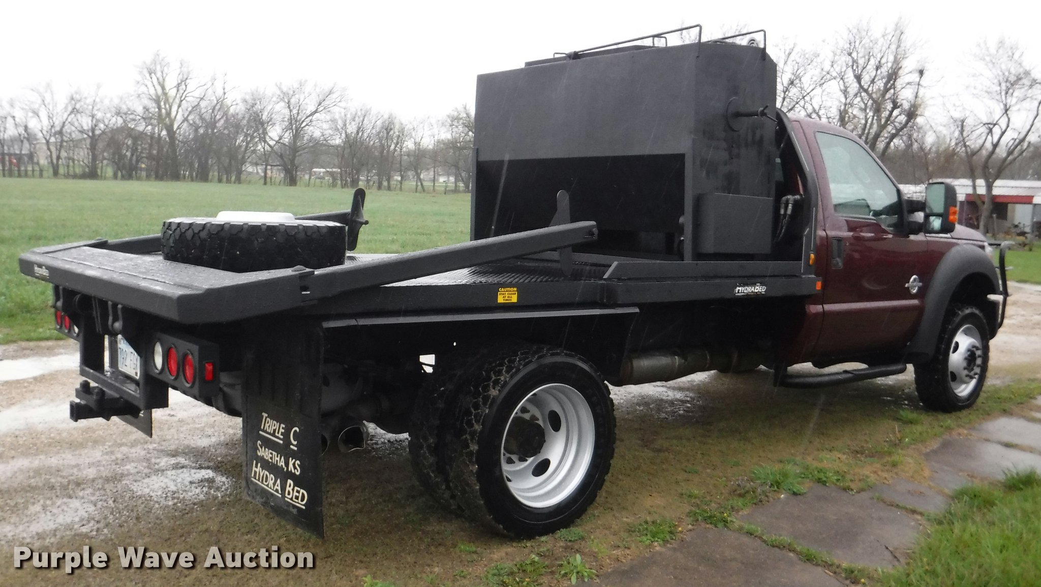 Purple Wave is selling a used Flat Bed Truck in Kansas. This item is a 2013 Ford F450 Super Duty XLT flatbed pickup truck with the following: 63,827 miles on odometer, 6.7L V8 OHV 16V turbo diesel engine, Automatic transmission, Four wheel drive, AC and heat, Tilt, Cruise, AM/FM/CD, Power windows, locks, and mirrors, Heated mirrors, Cloth interior, Block heater, Front tow hooks, Running boards, Grill guard, Auxiliary controls, Hydrabed flatbed, 130"L x 7'W, Cake feeder, Bale roller, Receiver hitch, Trailer wiring, 225/70R19.5 tires