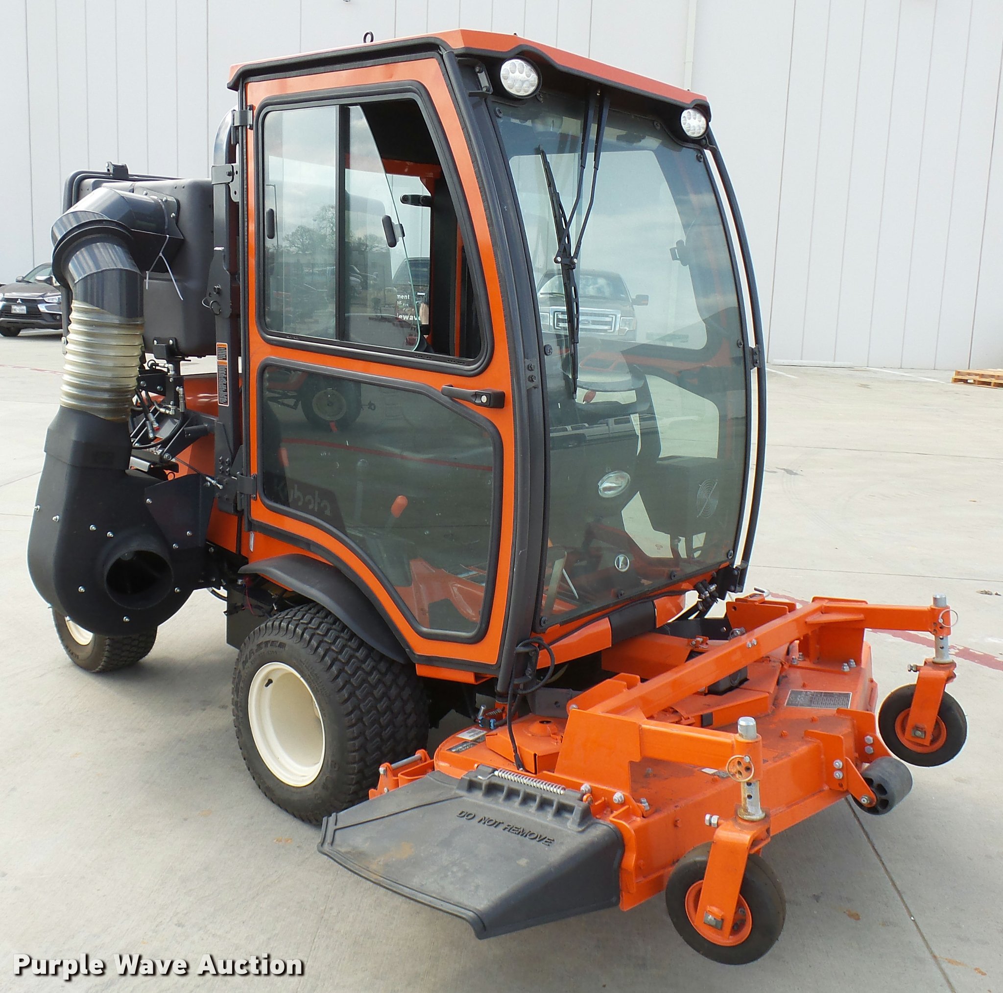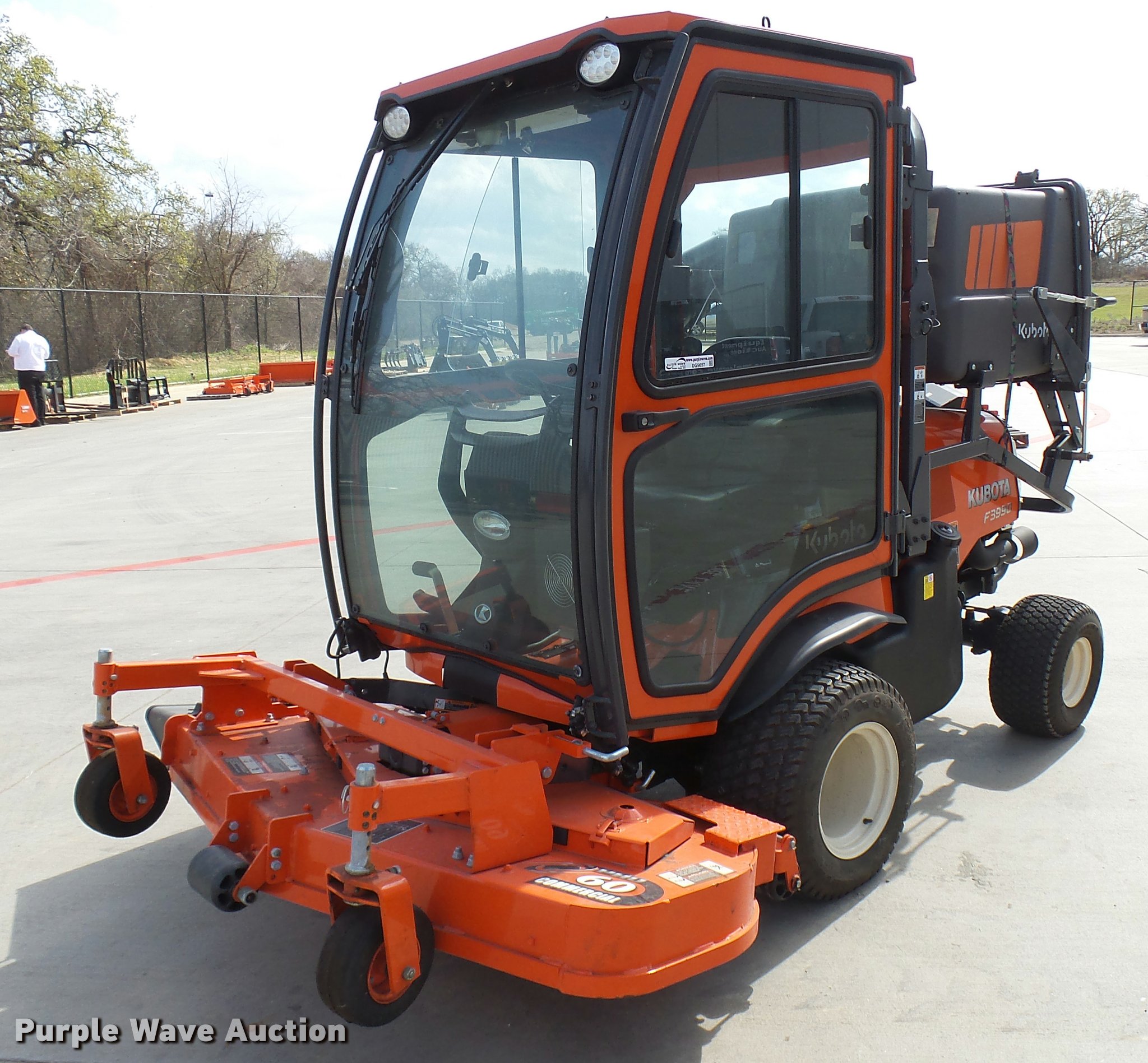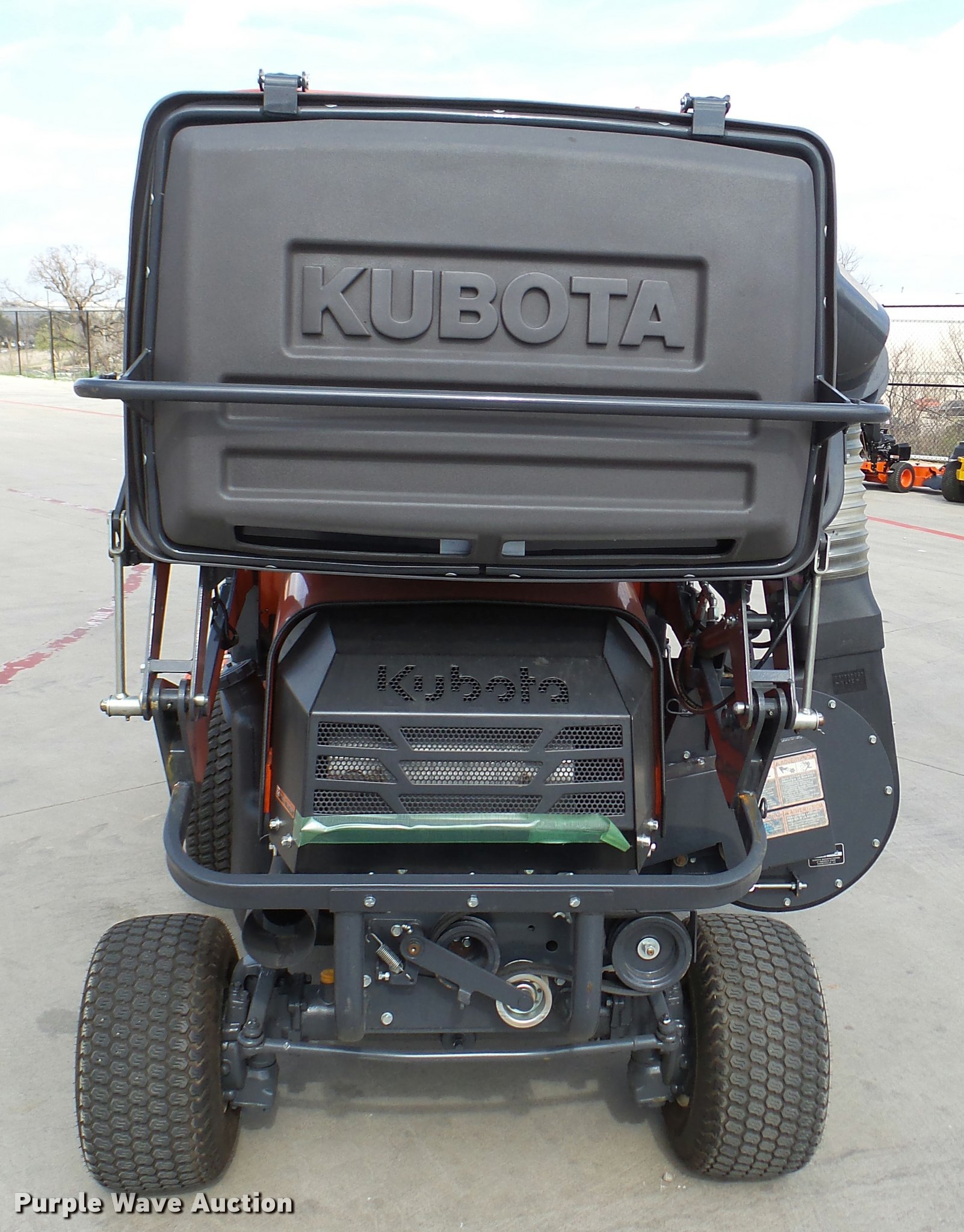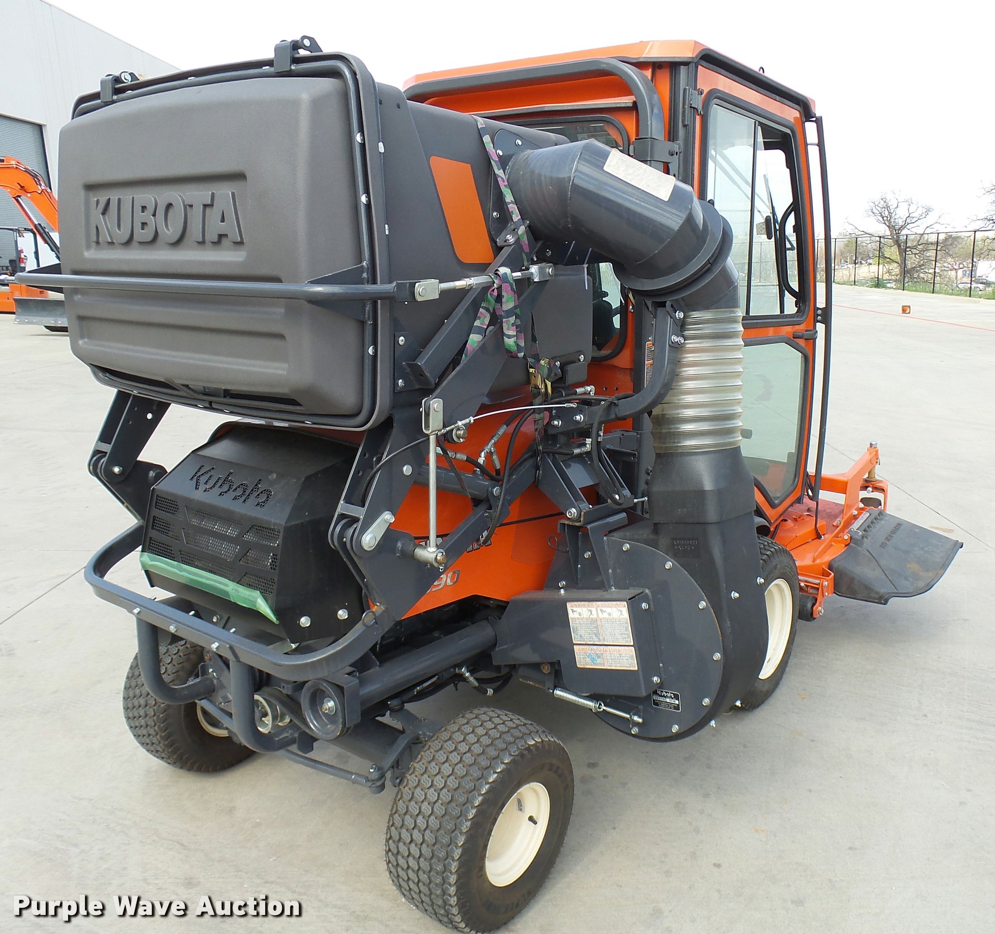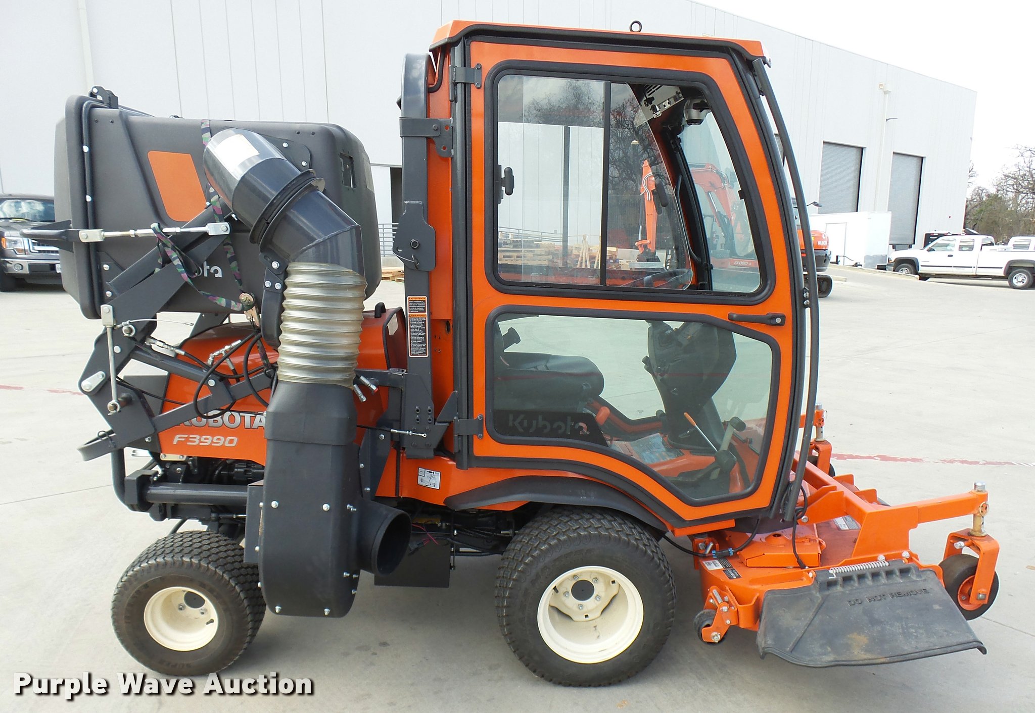 Purple Wave is selling a used Lawn Mower in Texas. This item is a Kubota F3990 lawn mower with the following: 4 hours on meter, 60" cut, Kubota four cylinder turbo diesel engine, Hydrostatic transmission, Four wheel drive, Tilt steering wheel, Wiper, Blower, Mower deck, Model RCK60P-F39, Serial 10769, Vacuum grass catcher, missing parts, 24-12.00-12 front tires, 18x9.50-8 rear tires, Serial 20377