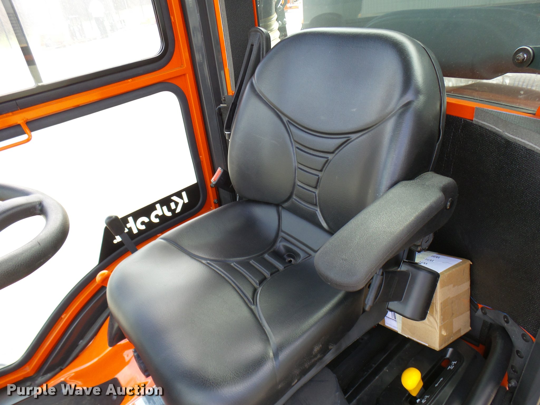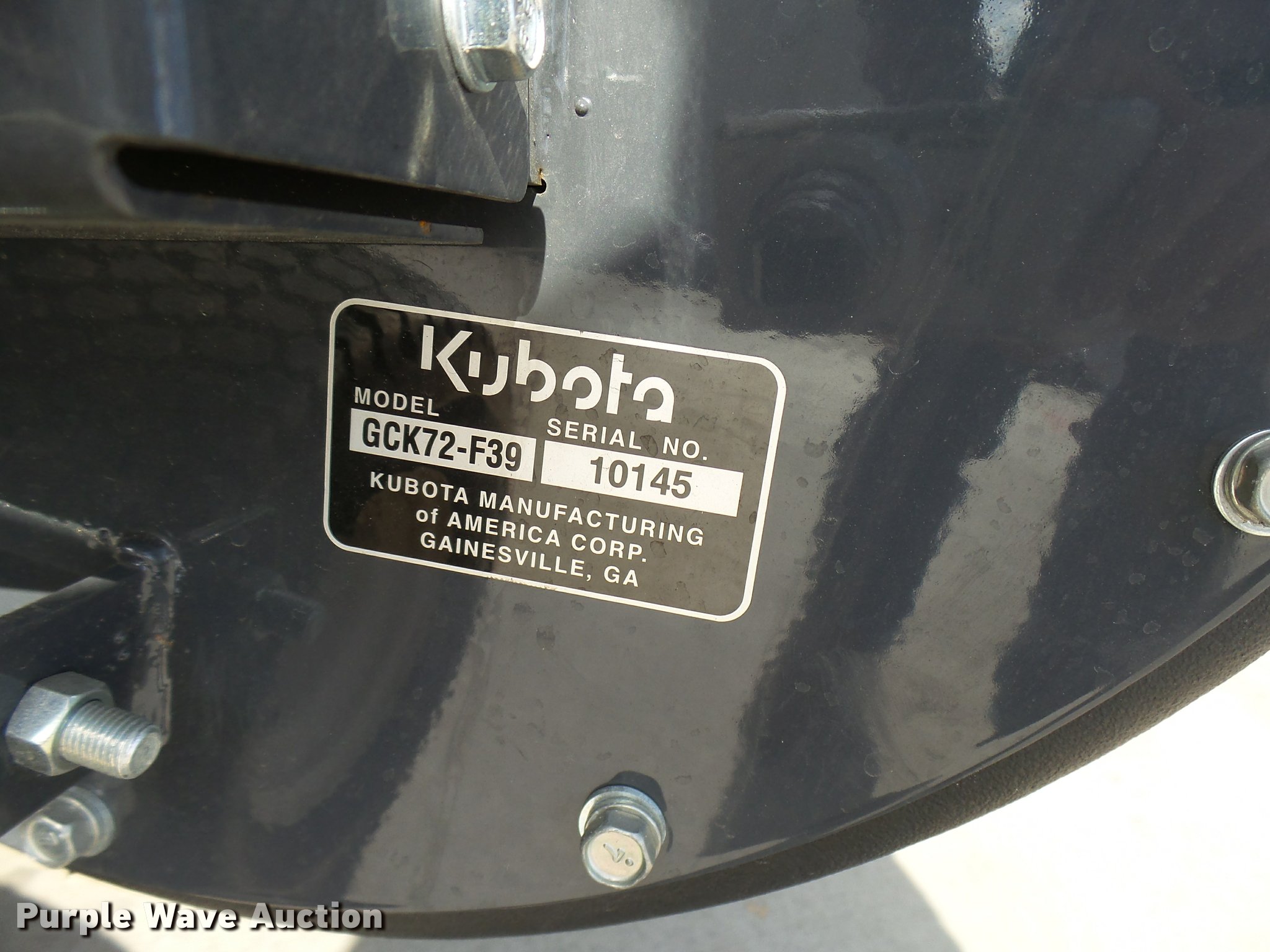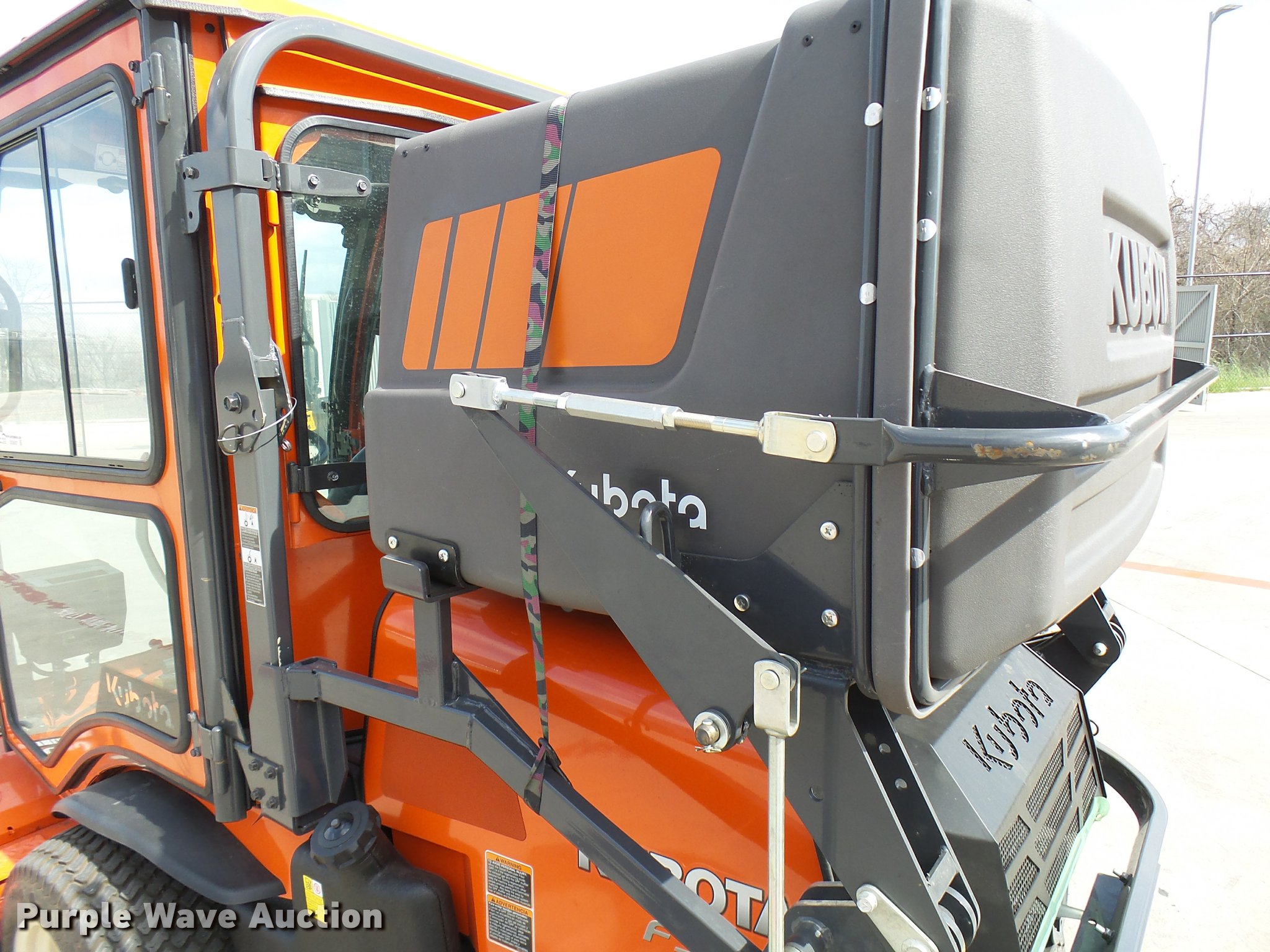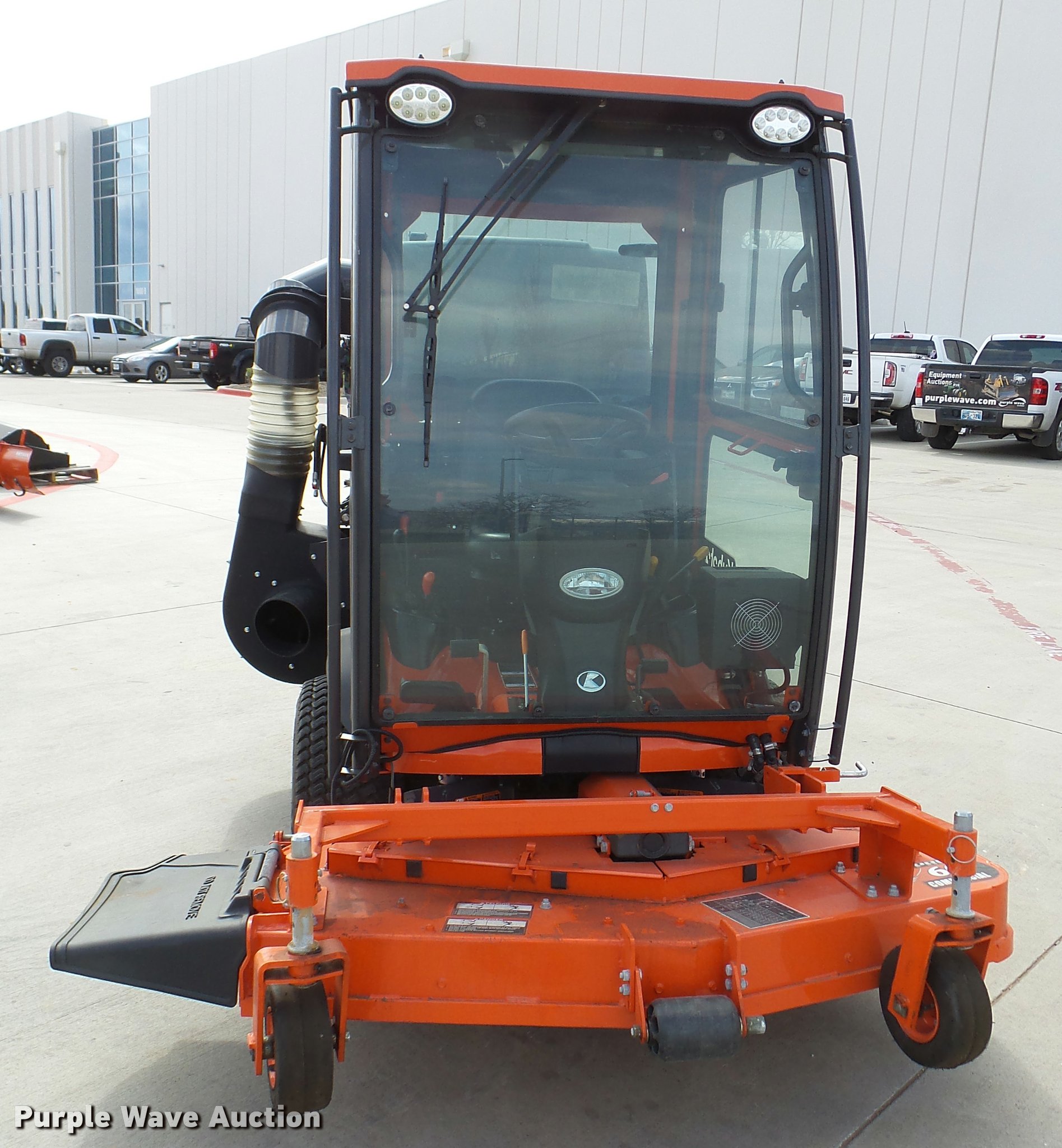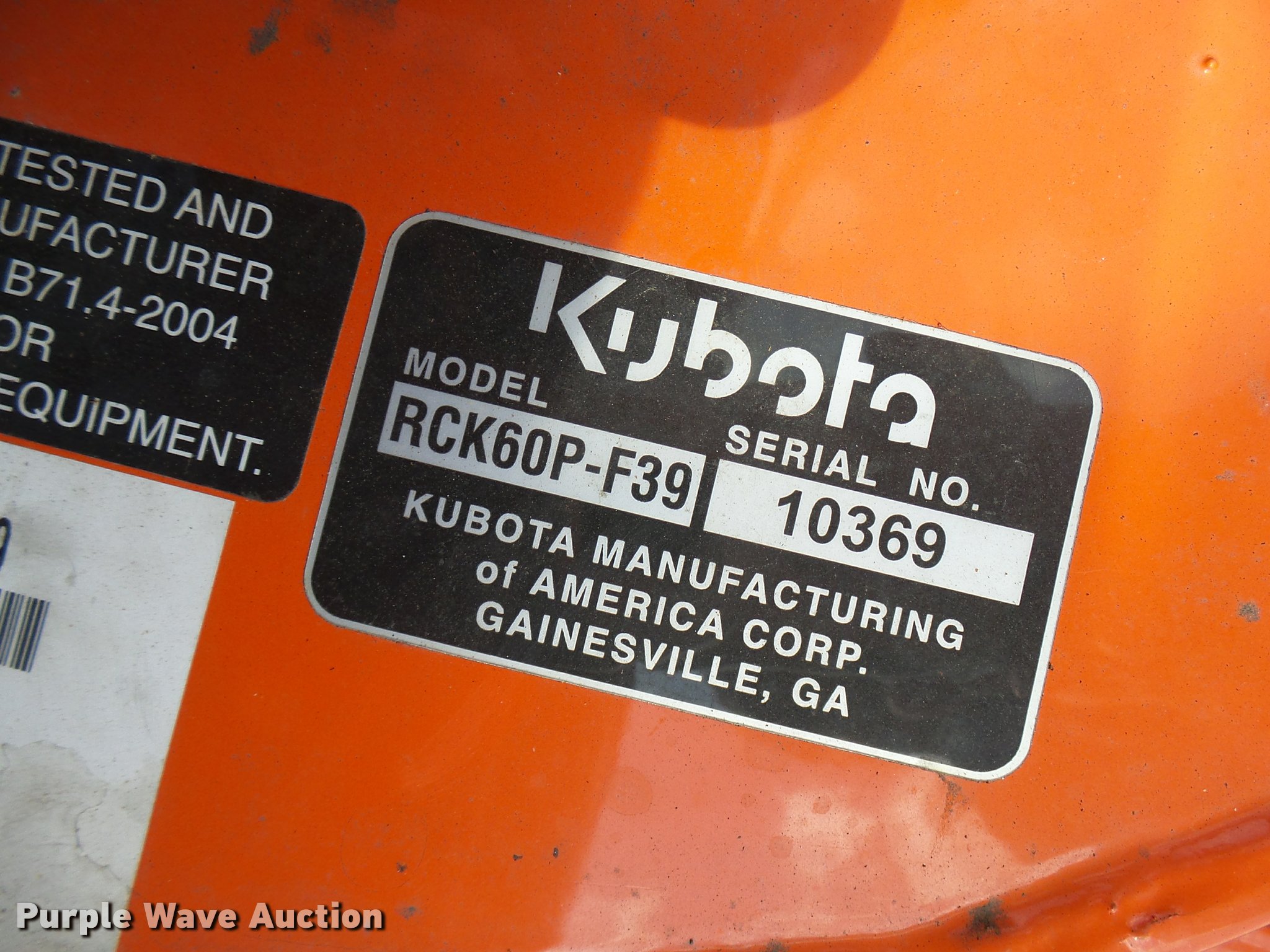 Purple Wave is selling a used Lawn Mower in Texas. This item is a Kubota F3990 lawn mower with the following: 4 hours on meter, 60" cut, Kubota four cylinder turbo diesel engine, Hydrostatic transmission, Four wheel drive, Tilt steering wheel, Wiper, Blower, Mower deck, Model RCK60P-F39, Serial 10769, Vacuum grass catcher, missing parts, 24-12.00-12 front tires, 18x9.50-8 rear tires, Serial 20377