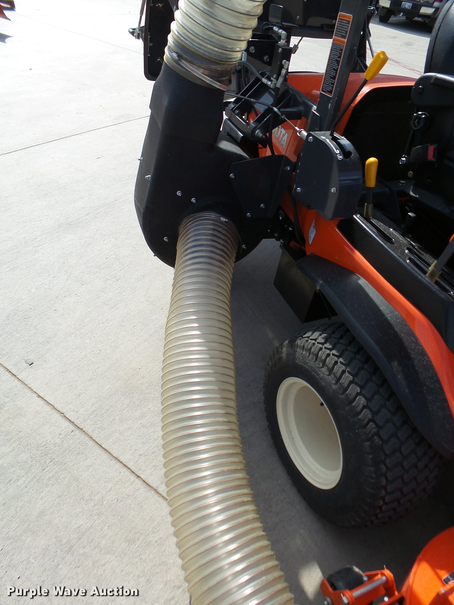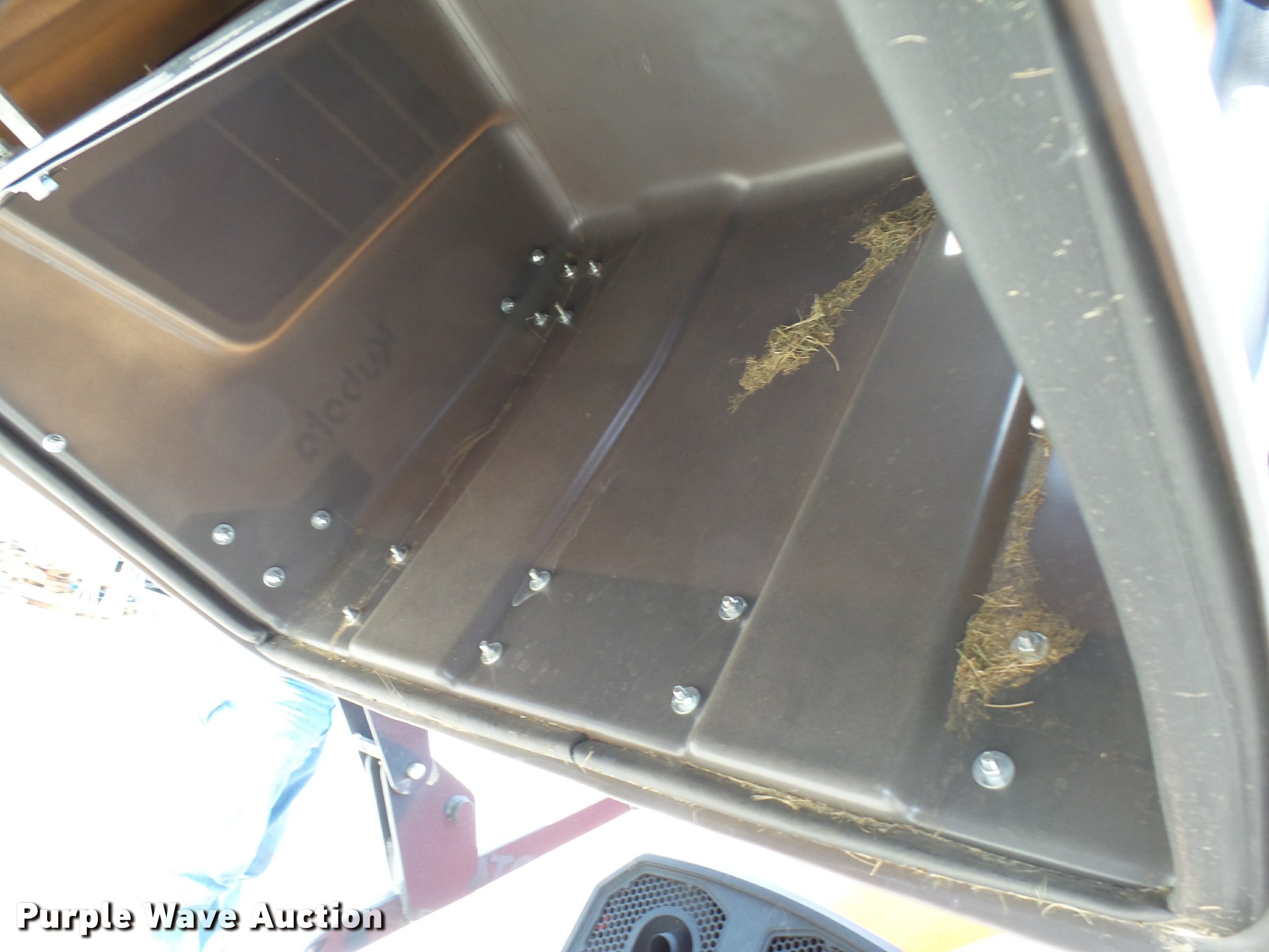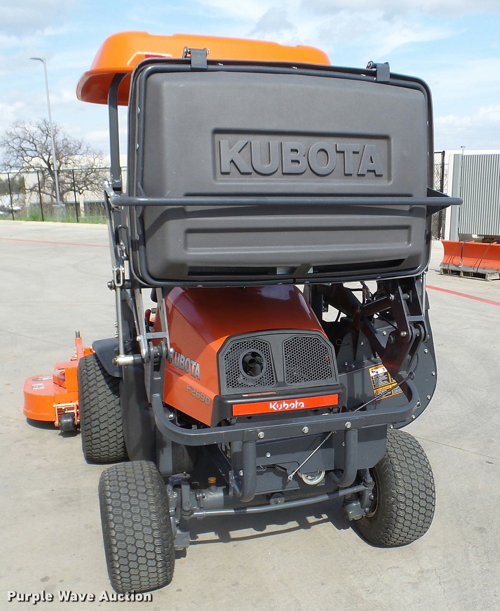 Purple Wave is selling a used Lawn Mower in Texas. This item is a Kubota F2690 lawn mower with the following: 68 hours on meter, 72" cut, Kubota three cylinder diesel engine, Hydrostatic transmission, All wheel drive, Grass catcher-vacuum powered, Mower deck, Model RCK72P-F39, Serial 11409, 24x12.00-12NHS front tires, 18x9.50-8 rear tires, Serial 10814