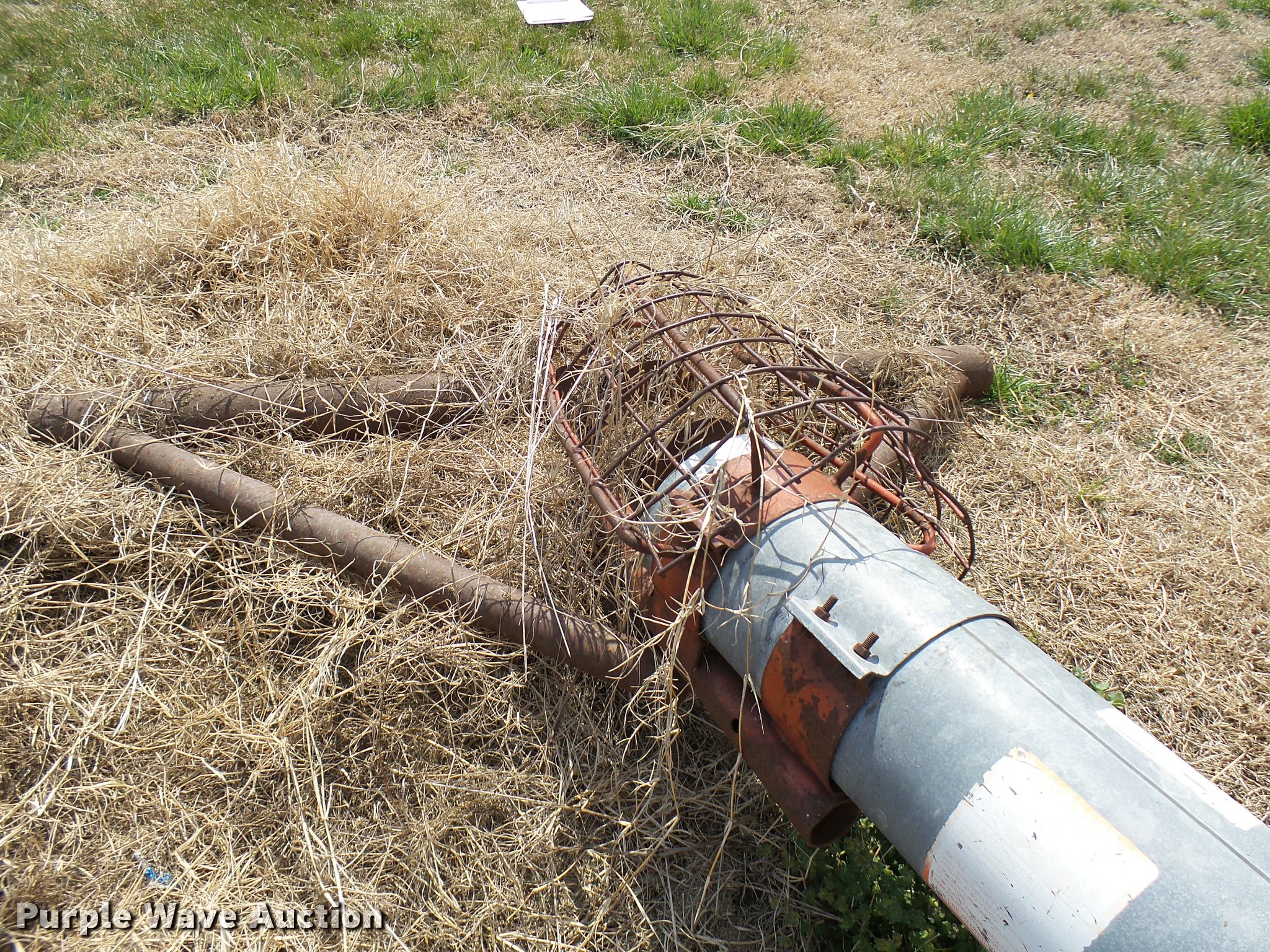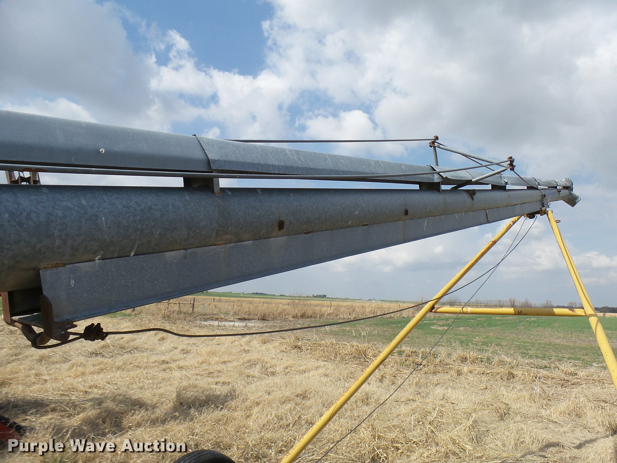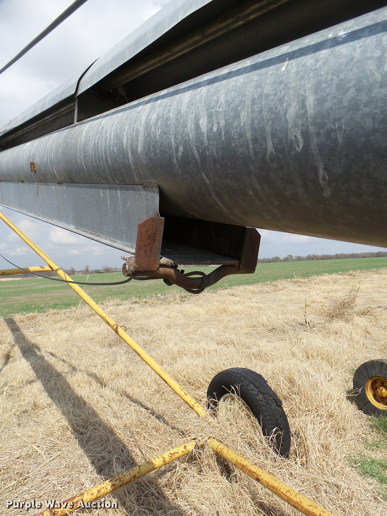 Purple Wave is selling a used Auger or Conveyor in Oklahoma. This item is a Hutchinson Century auger with the following: 50'L x 8" diameter, Manual winch adjust, Winch disconnected, 540 PTO, Auger basket, Pipe base, 235/75R15 tires, Tires need to be replaced, Serial 205895