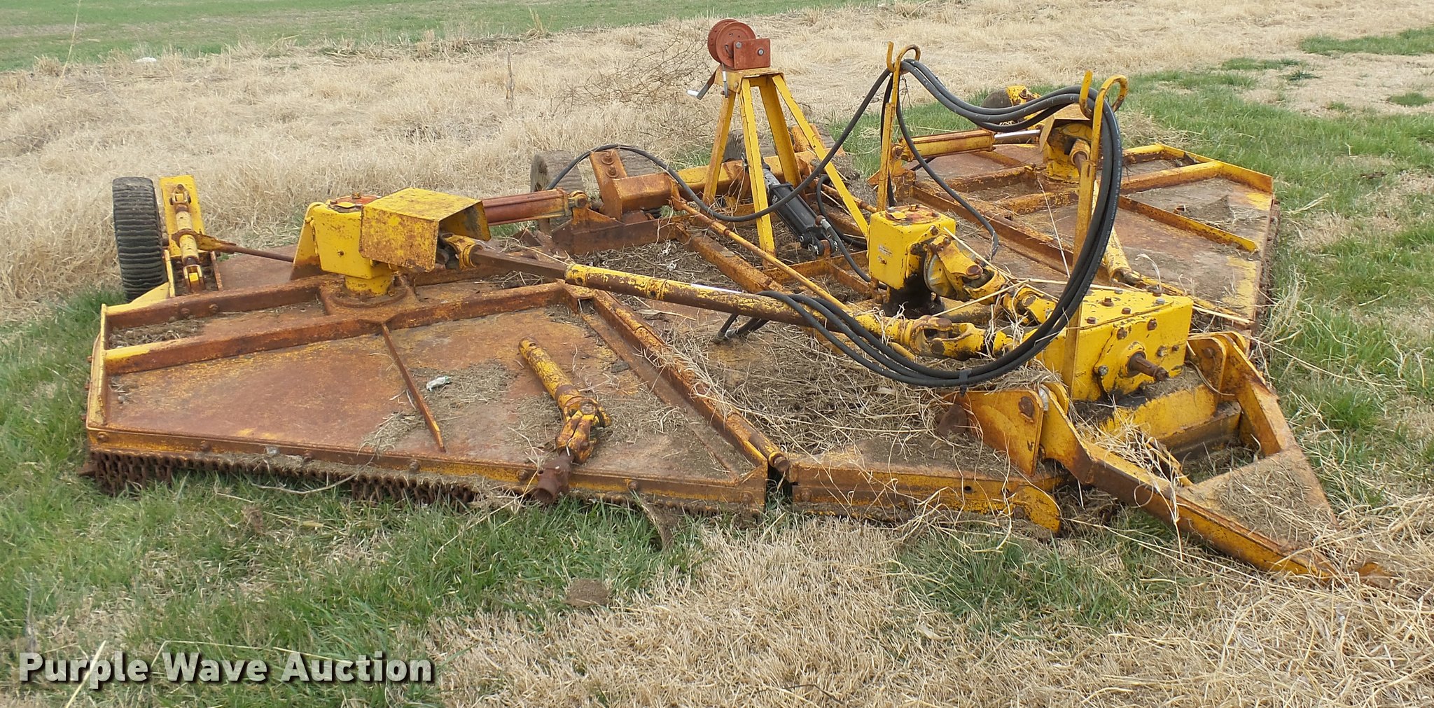 Purple Wave is selling a used Mower, Cutter, Shredder in Oklahoma. This item is a Servis Flex XV batwing rotary mower with the following: 15'W, Hydraulic lift and fold, 1000 PTO, Pin hitch, Solid rubber wheels, PTO shaft cracked