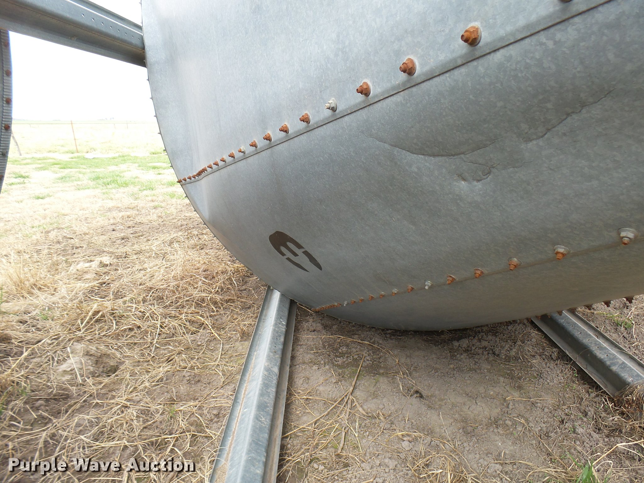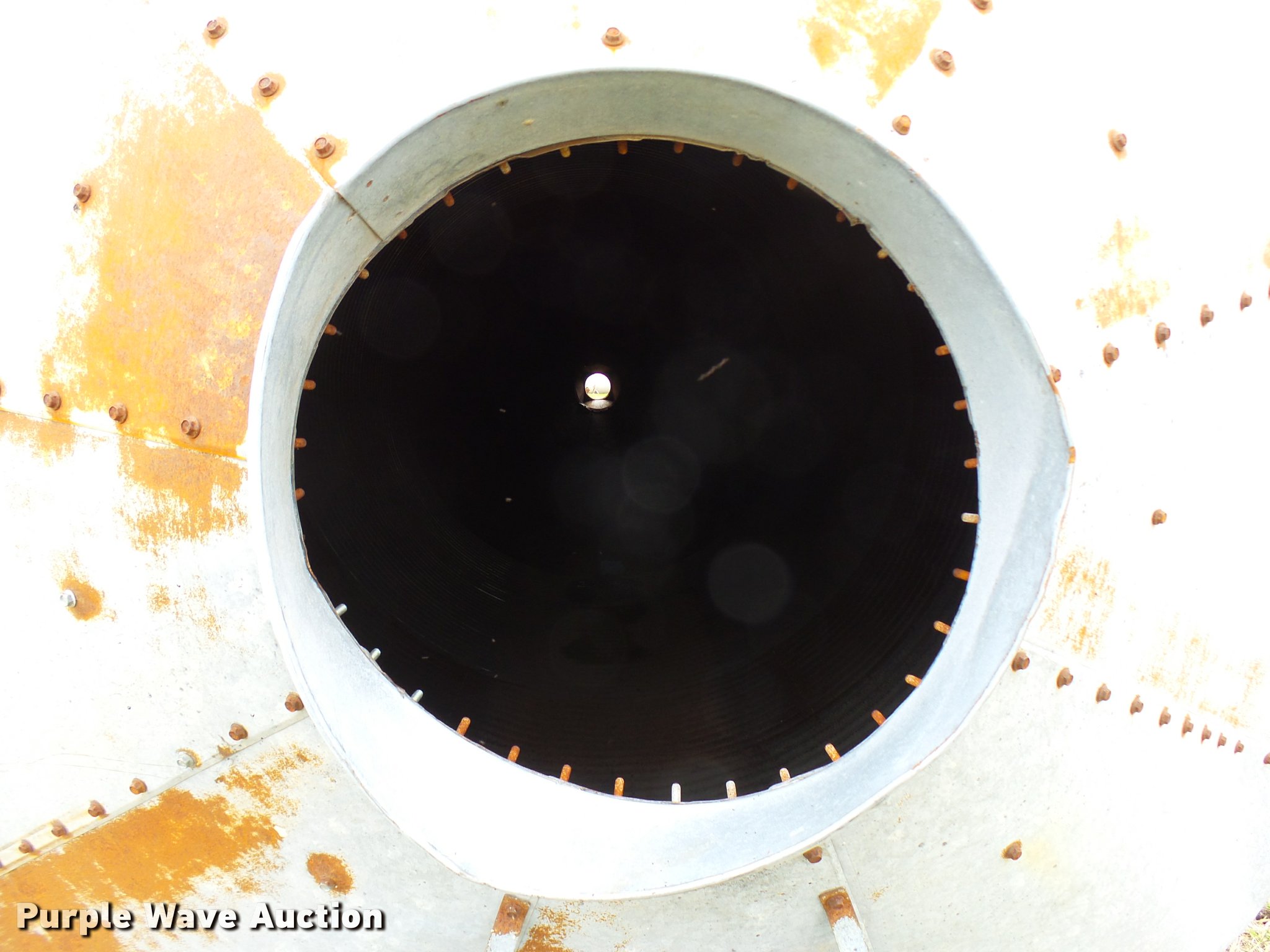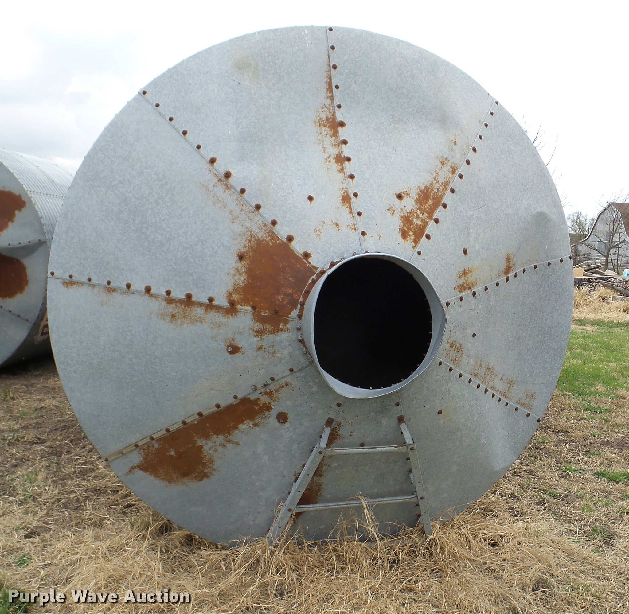 Purple Wave is selling a used Other Grain or Fertilizer Handling in Oklahoma. This item is a Grain bin with the following: 33'H, 10" diameter cone, 80" from cone to base, (6) galvanized base posts, 53" spacing, Base damage, Unit# 3