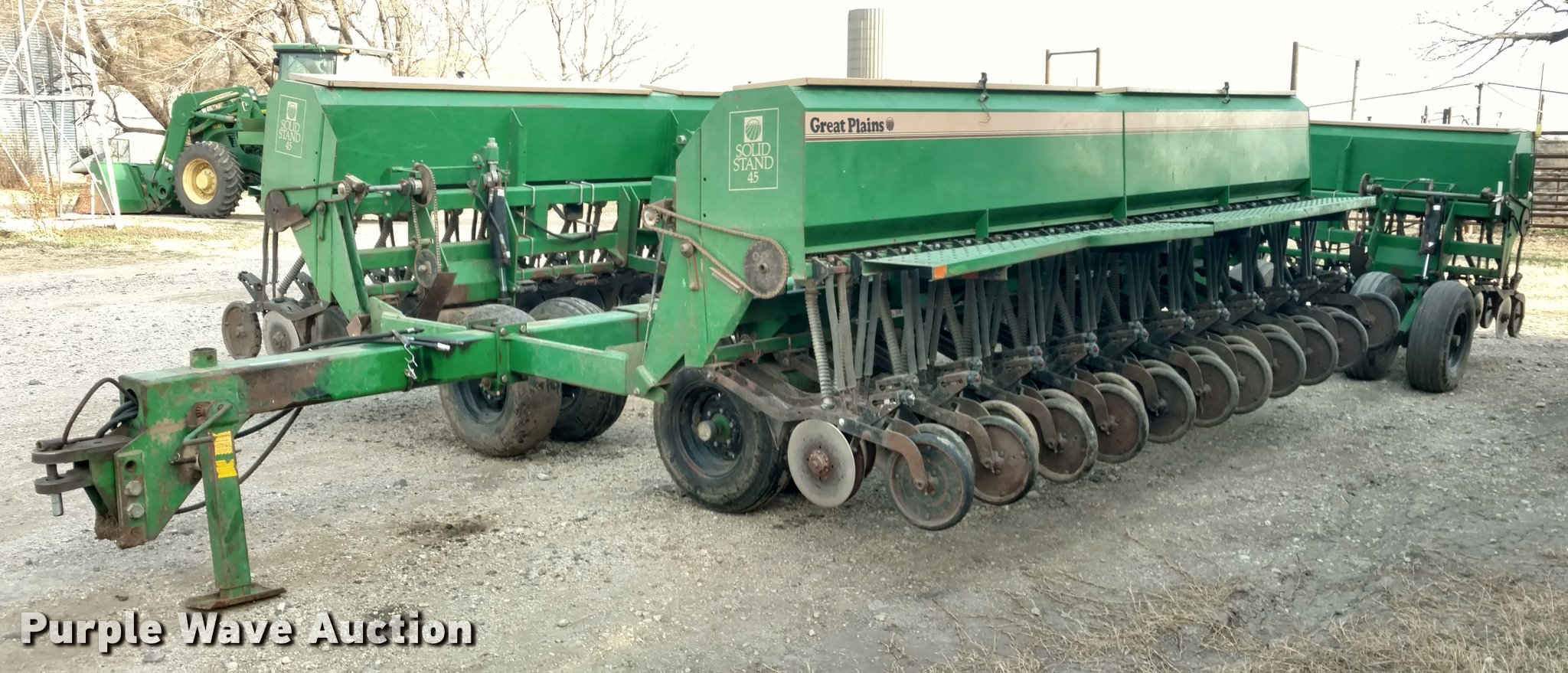 Purple Wave is selling a used Grain Drill or Seeder in Kansas. This item is a 1991 Great Plains Solid Stand 45 grain drill with the following: Model 3ST456608900131, 26,015 acres on meter, 45'W, 8" spacing, Hydraulic lift and fold, 9.5-15 wing tires, 12.5-15 transport tires, Serial GP1141J