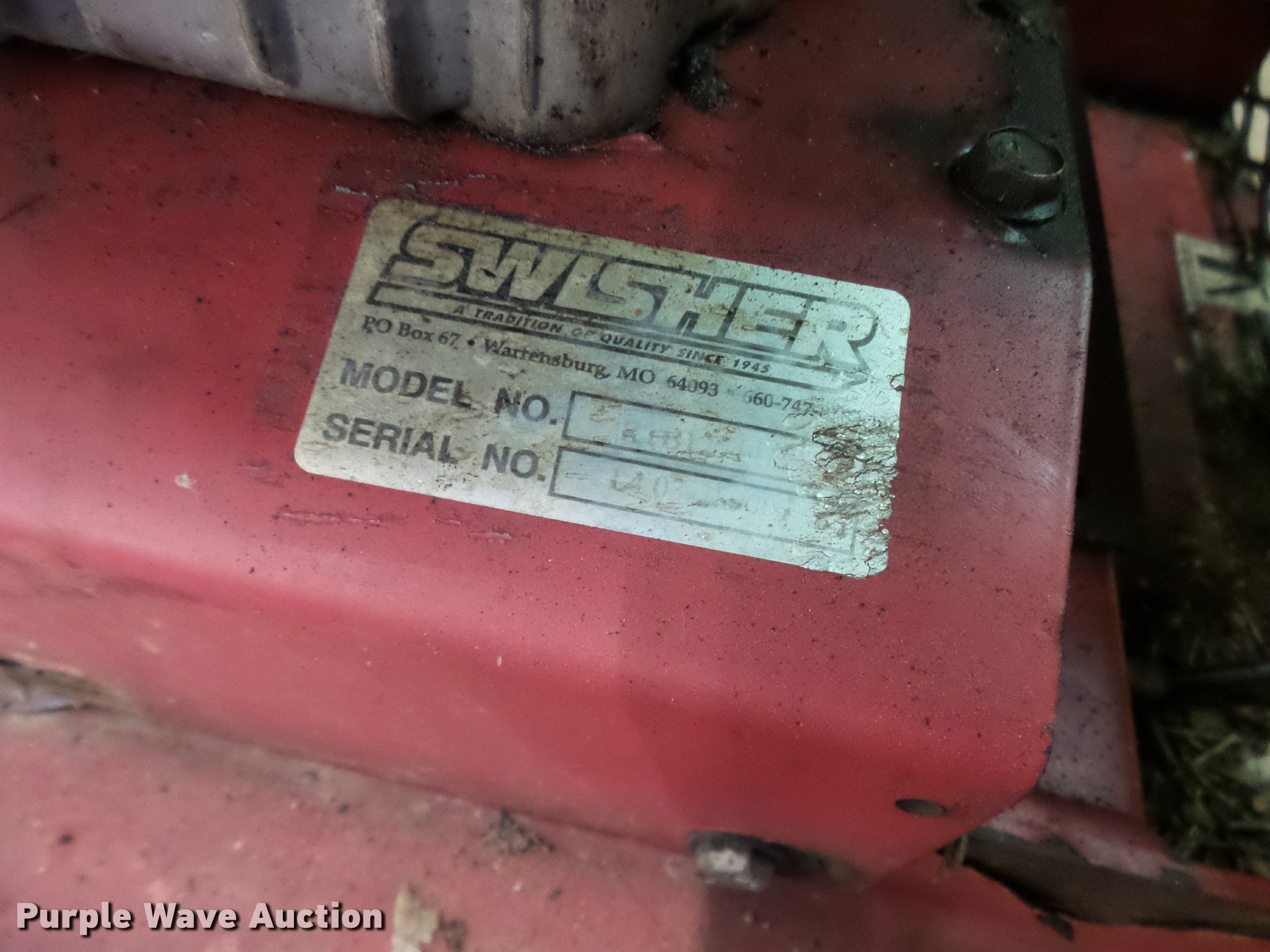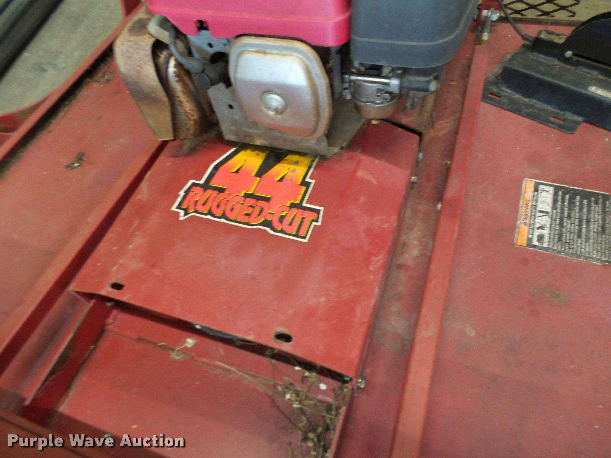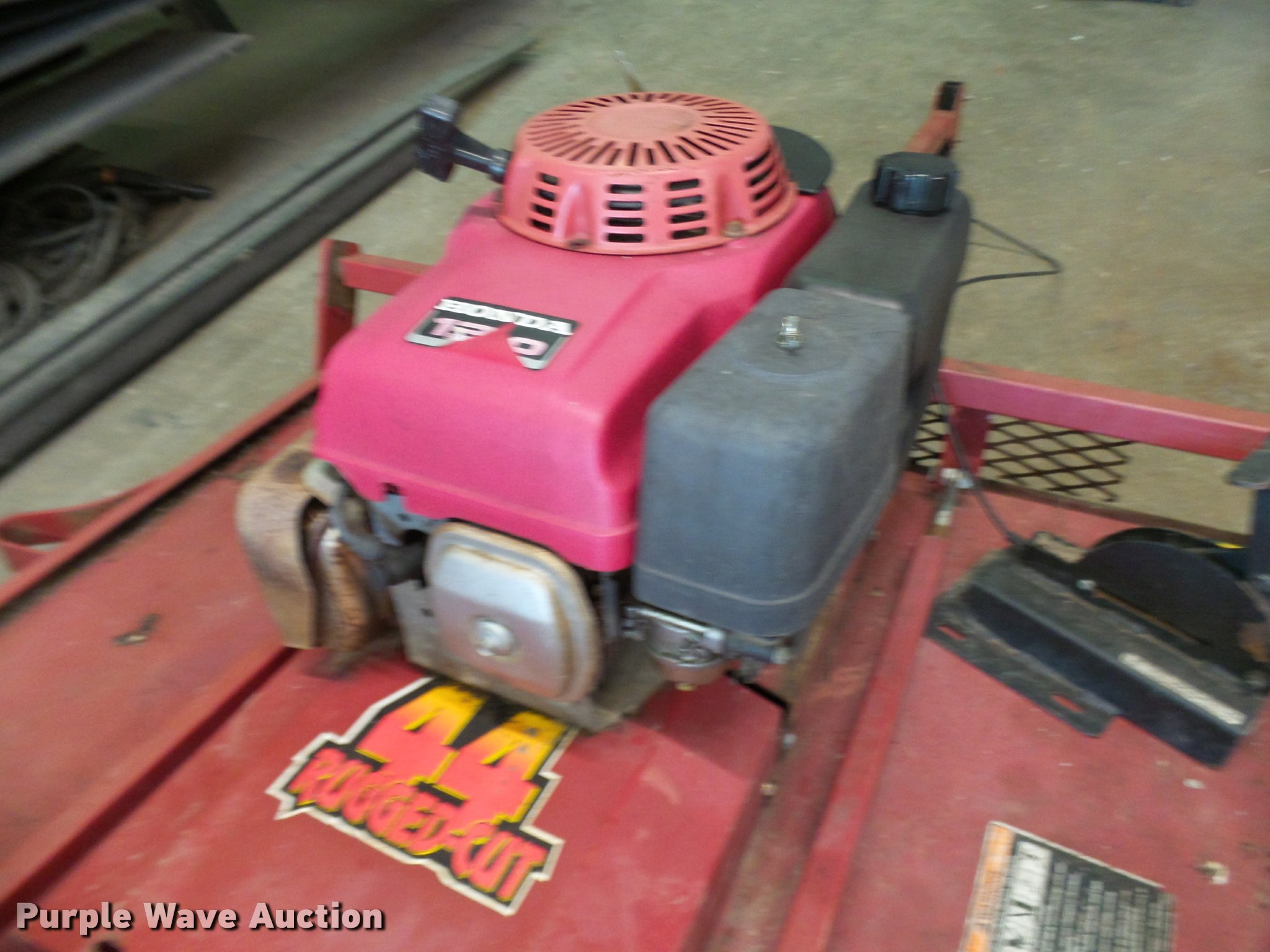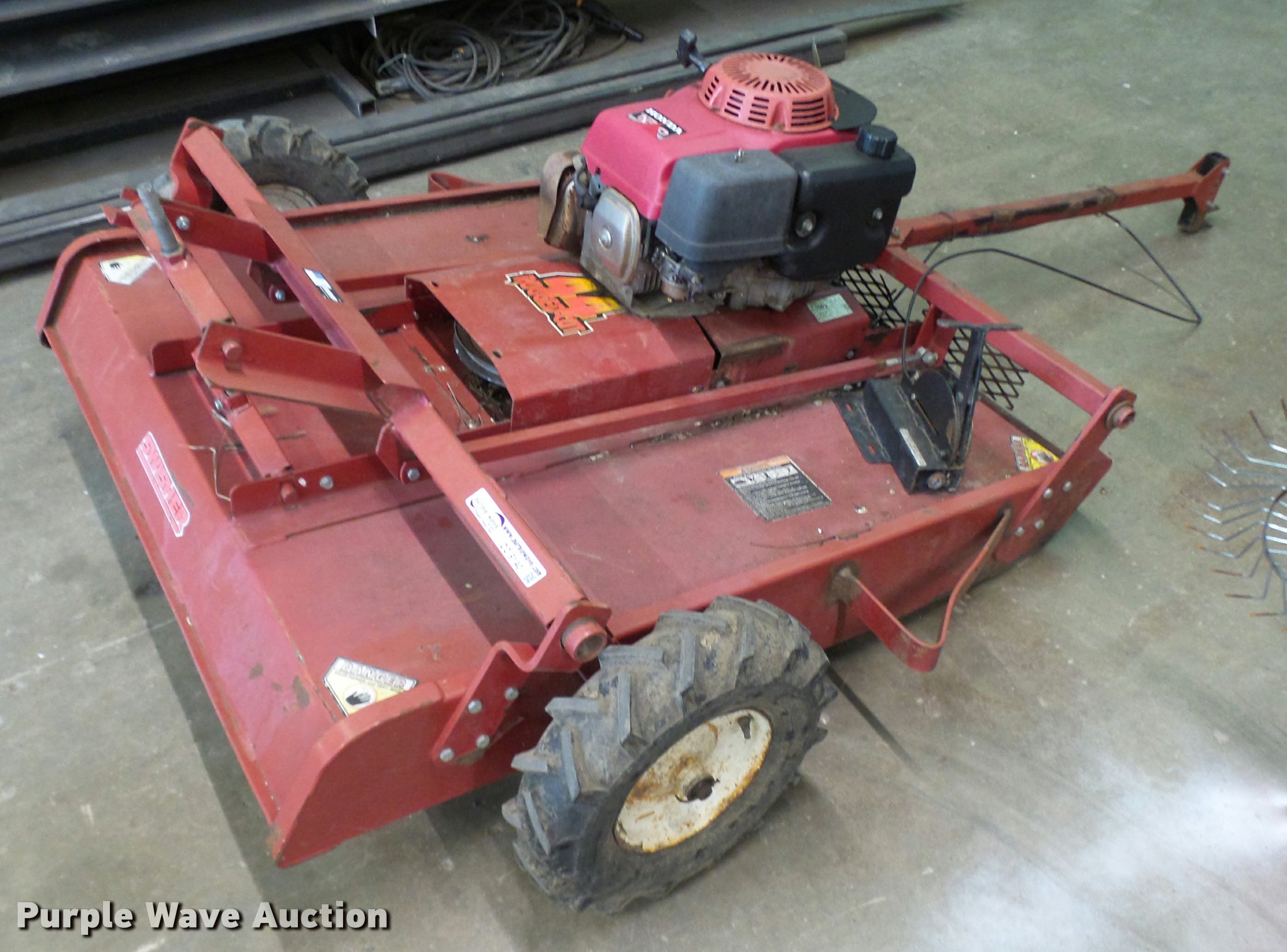 Purple Wave is selling a used Lawn Mower in Missouri. This item is a Swisher Rough Cut finish mower with the following: 44" cut, Honda 13 HP gas engine, Rear discharge, Adjustable deck height, Stump jumper, 3" diameter tree cutting capacity, Pin hitch, 4.00x8 tires