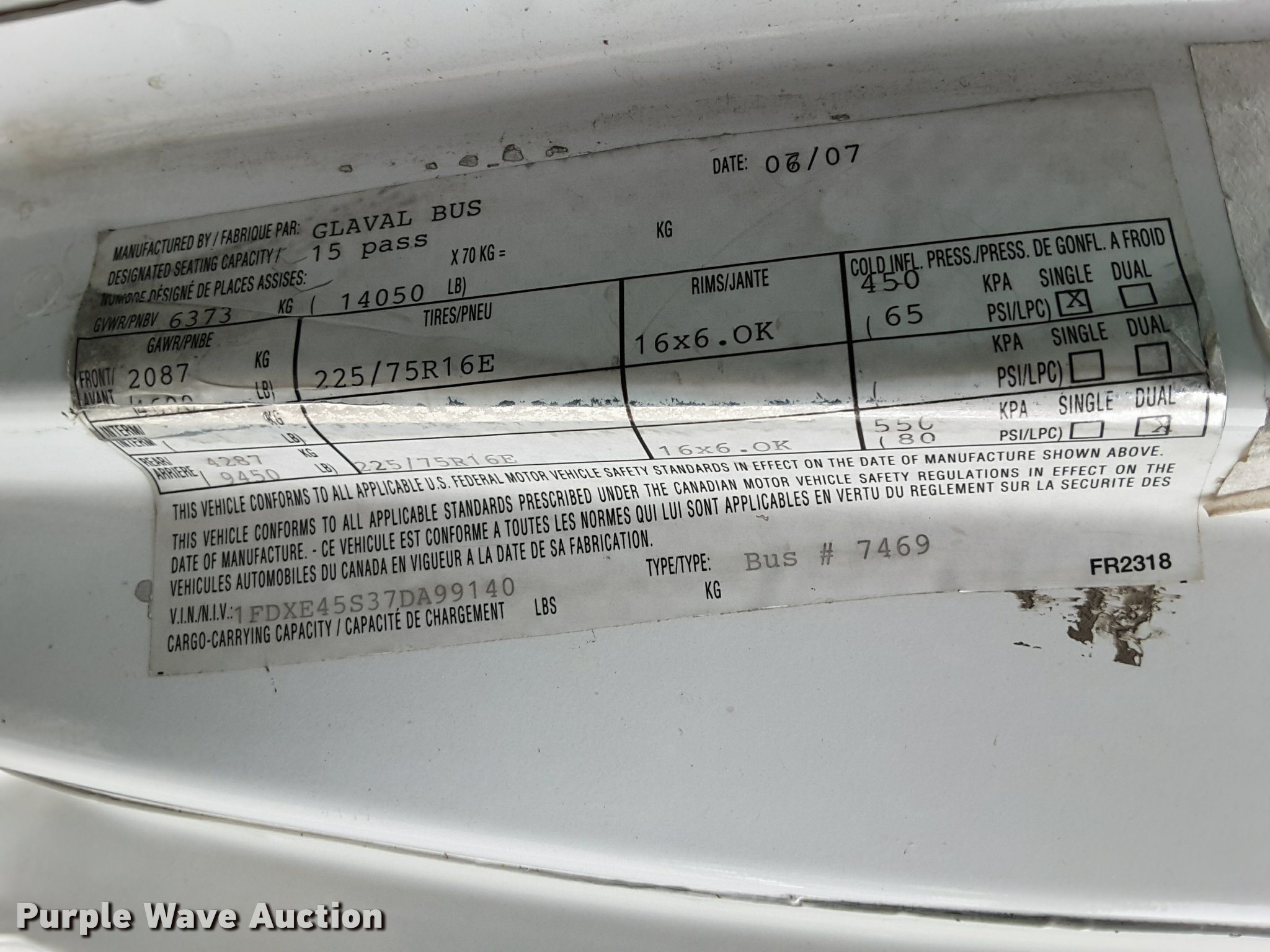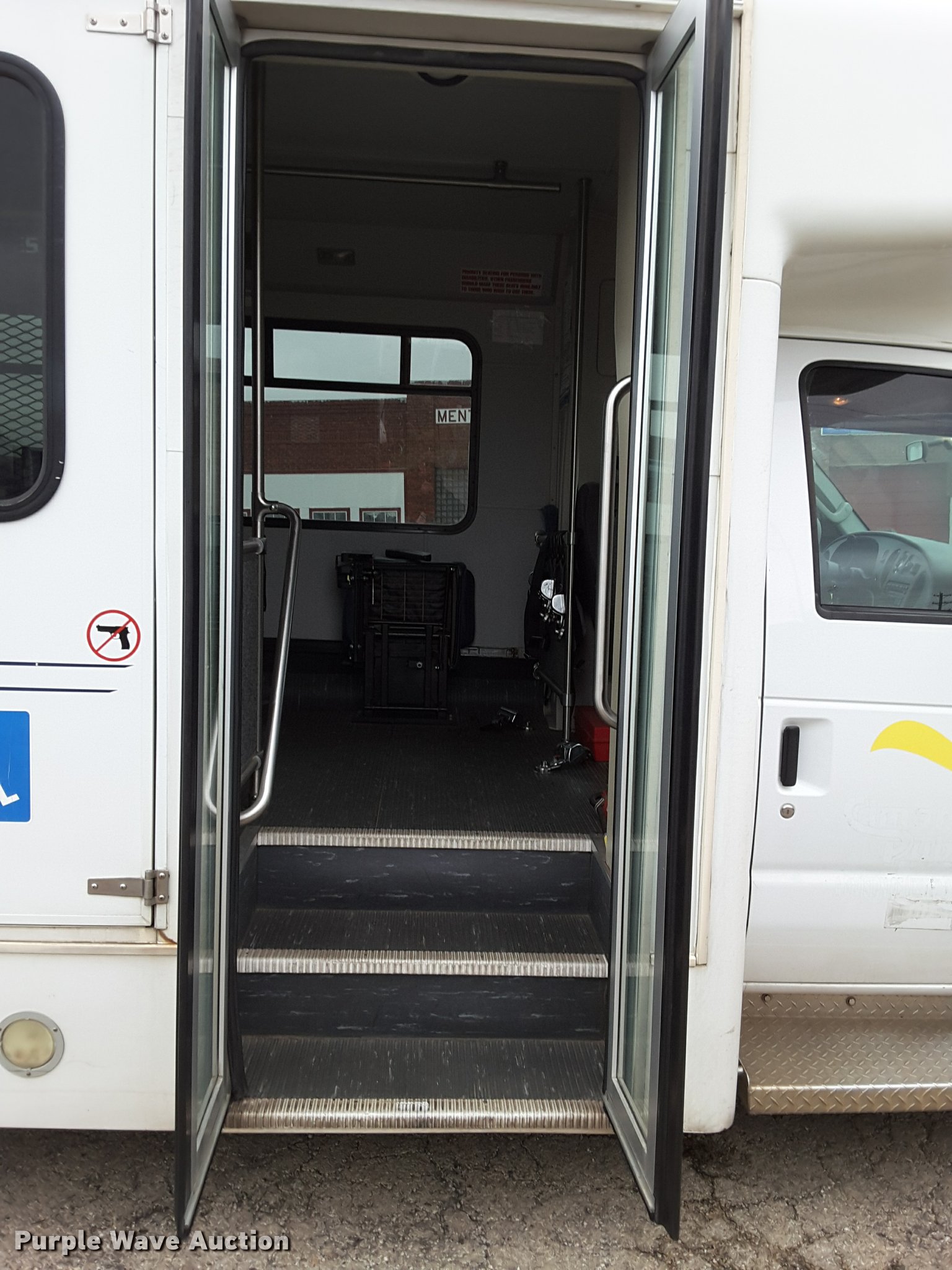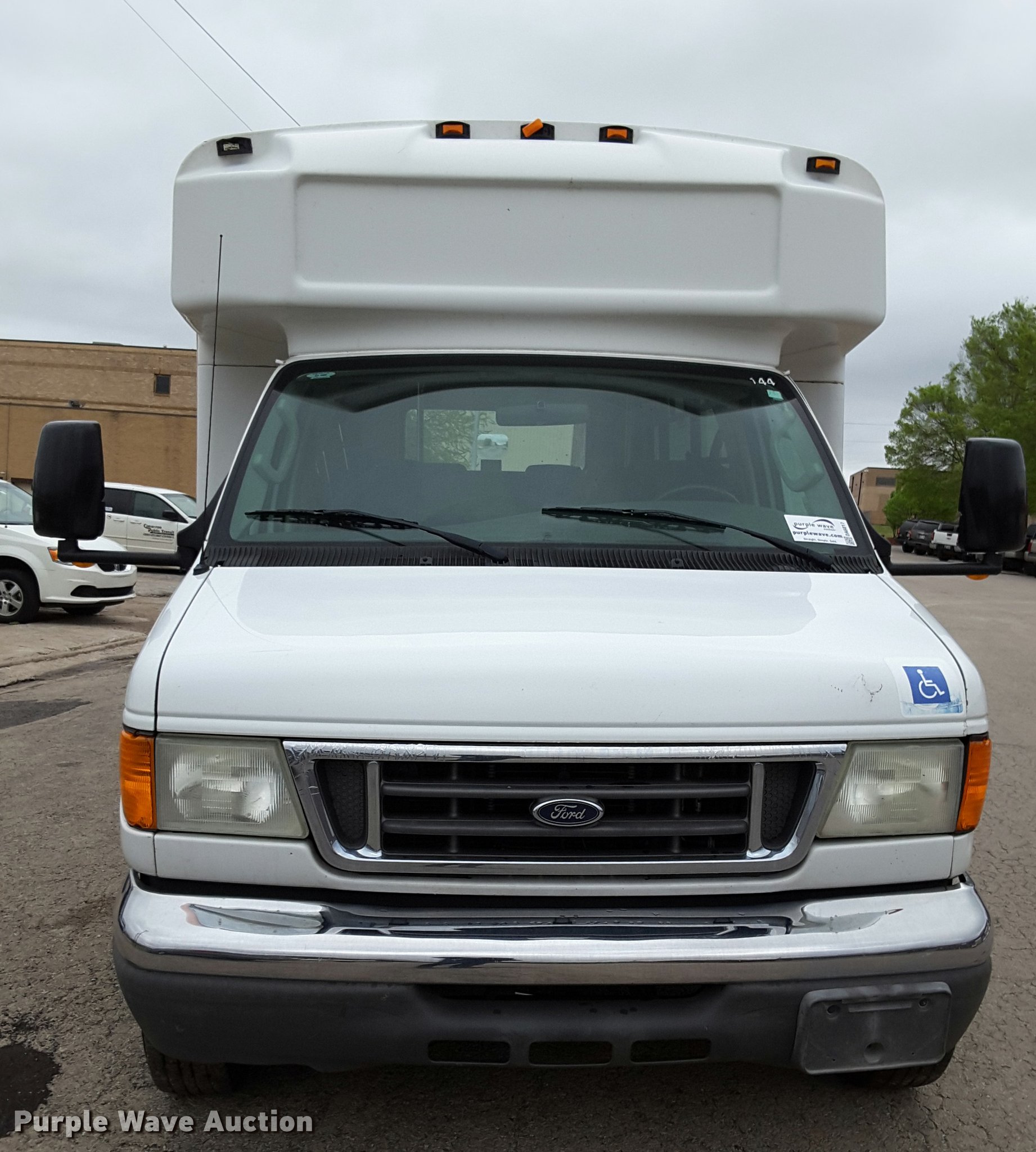 Purple Wave is selling a used Bus in Oklahoma. This item is a 2007 Ford Econoline E450 shuttle bus with the following: 210,846 miles on odometer, 6.8L V10 SOHC 20V gas engine, Automatic transmission, Single axle, AC and heat, AM/FM/CD, Power mirrors, Suspension seat, Auxiliary controls, Electric passenger sliding door, Ceiling handrail, 16 passenger capacity, (14) adult seats, Seat belts, Braun NC9191B wheelchair lift, Serial C5-02386, (2) wheelchair tie down areas, Side emergency exits, Lights, Carrier roof AC unit, Spring suspension, Hydraulic brakes, 192" wheelbase, 225/75R16 tires, GVWR 14,050 lbs