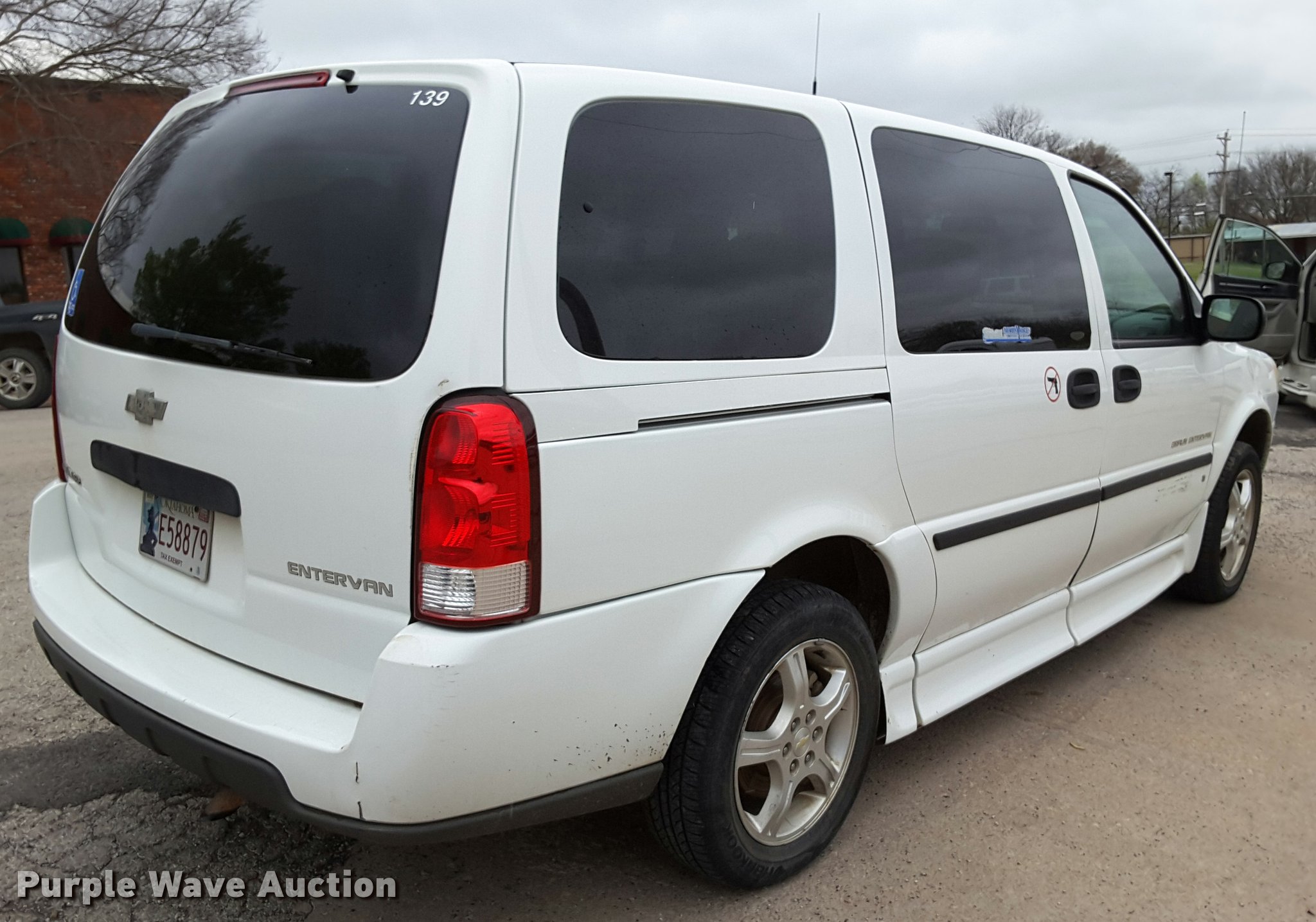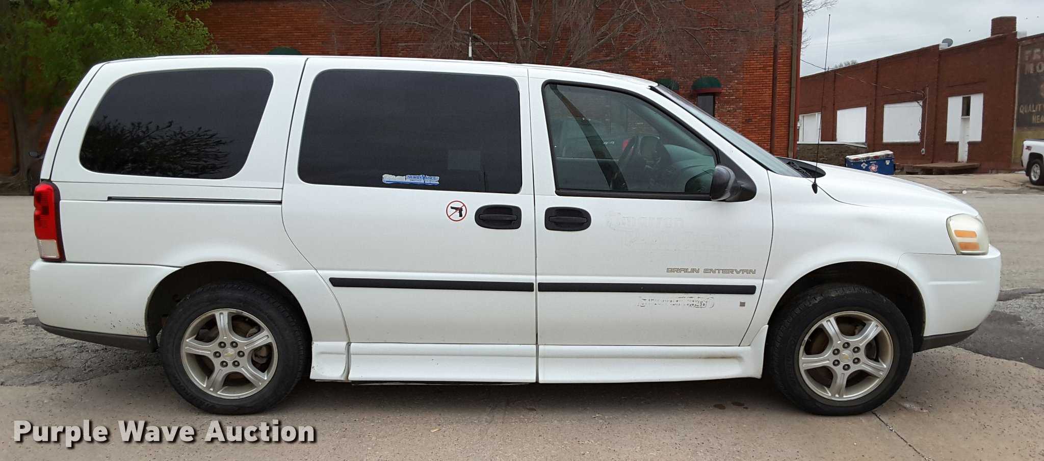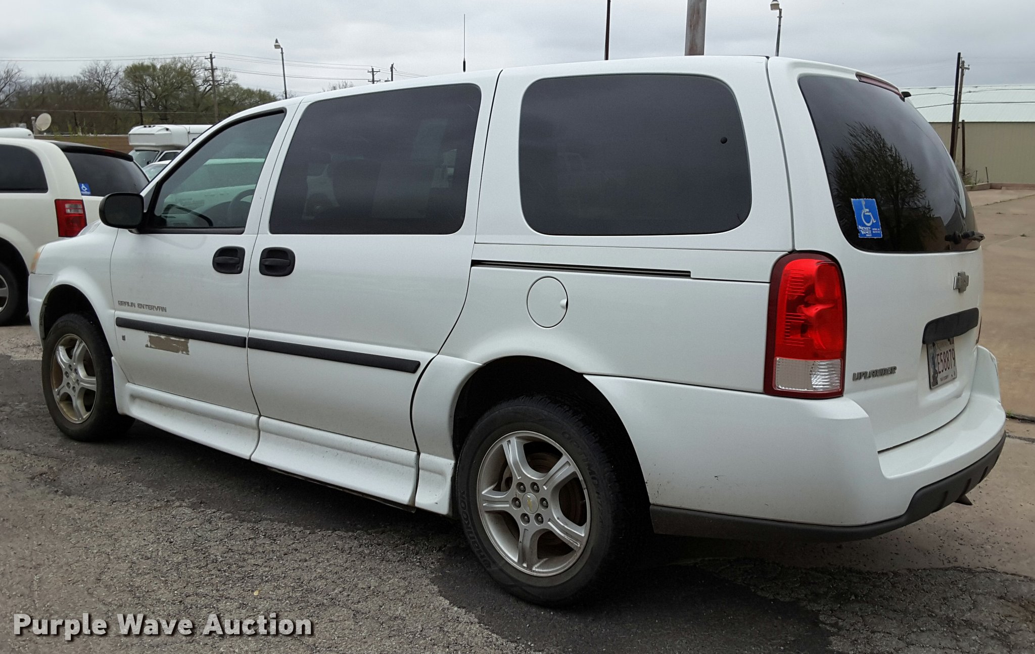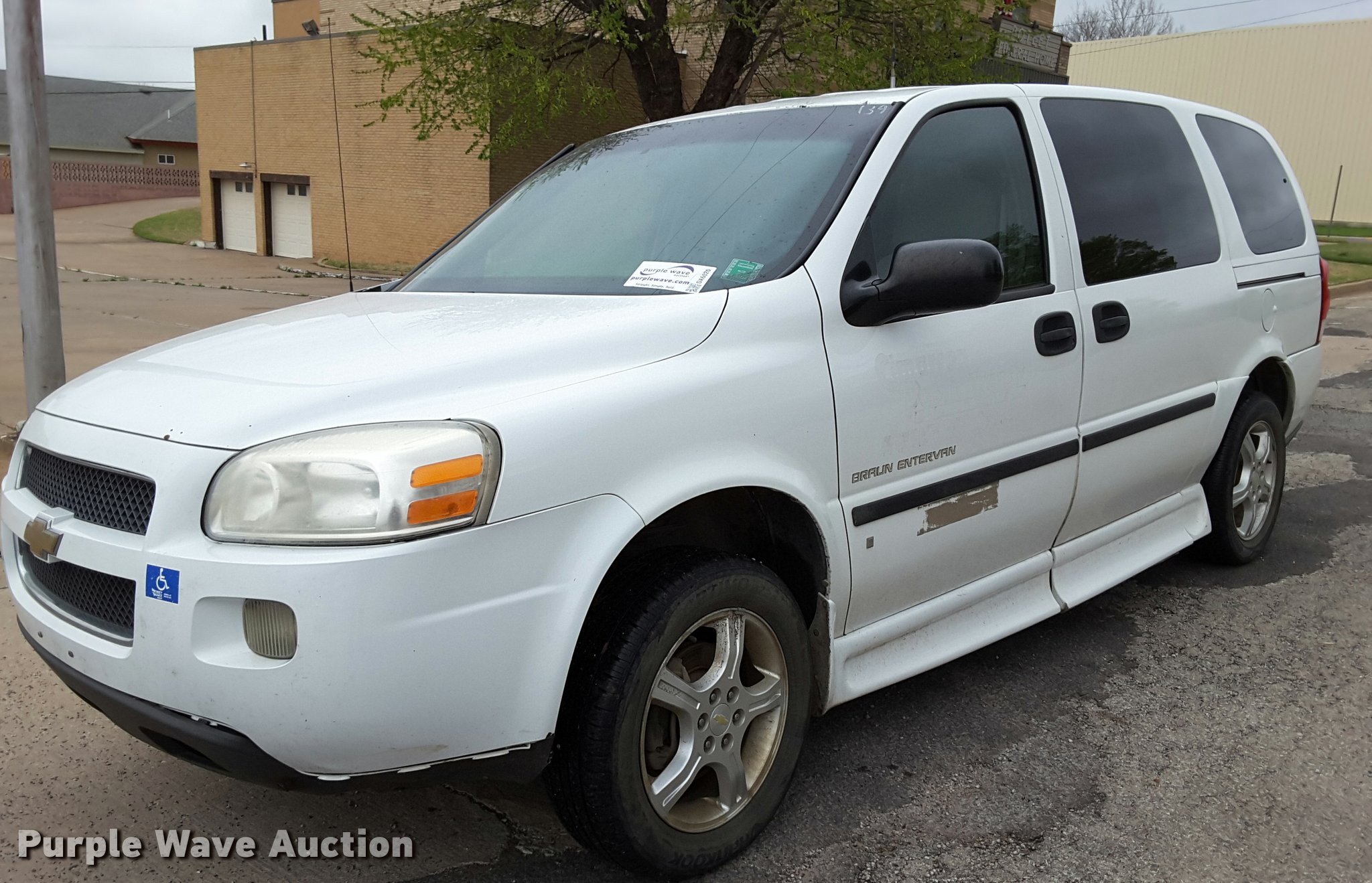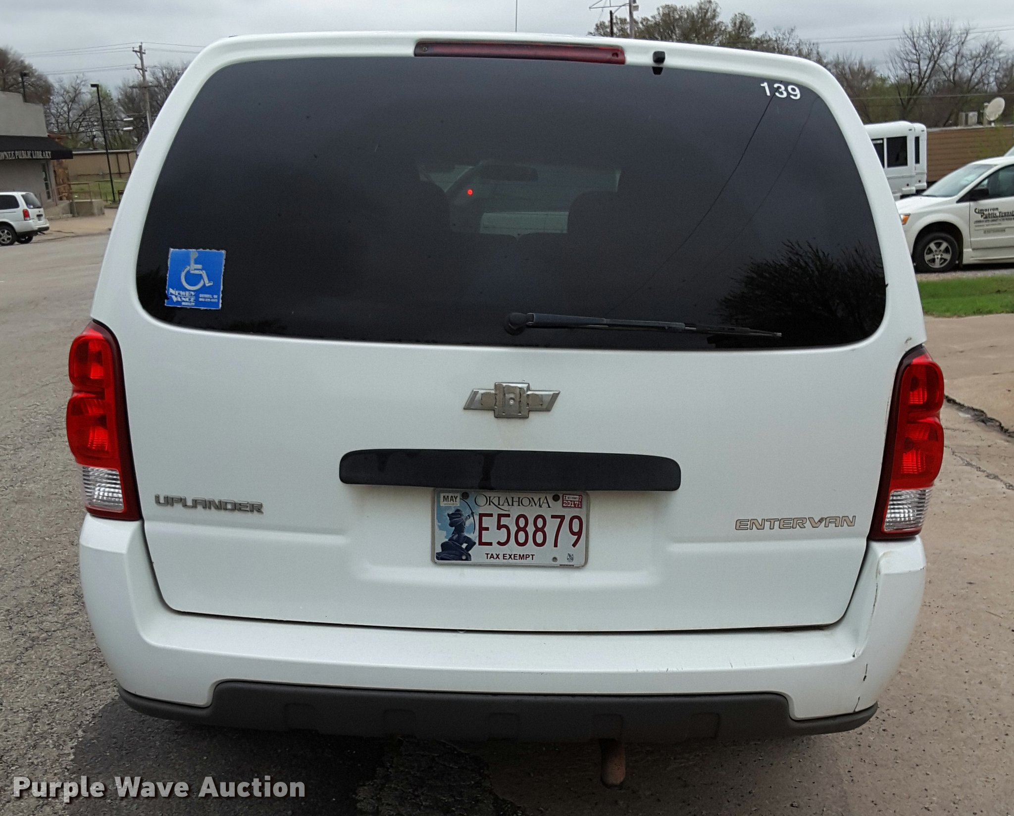 Purple Wave is selling a used Passenger Vehicle in Oklahoma. This item is a 2007 Chevrolet Uplander Cargo van with the following: 257,017 miles on odometer, 3.9L V6 DOHC 24V gas engine, Automatic transmission, AC and heat, Tilt, Cruise, AM/FM/CD, Power windows, locks, and mirrors, Cloth interior, Braun Enter Van conversion, Manual wheelchair ramp, Wheelchair tie downs, 225/60R17 tires