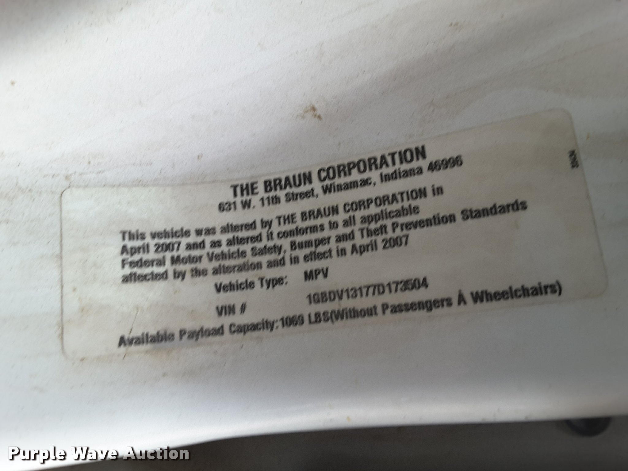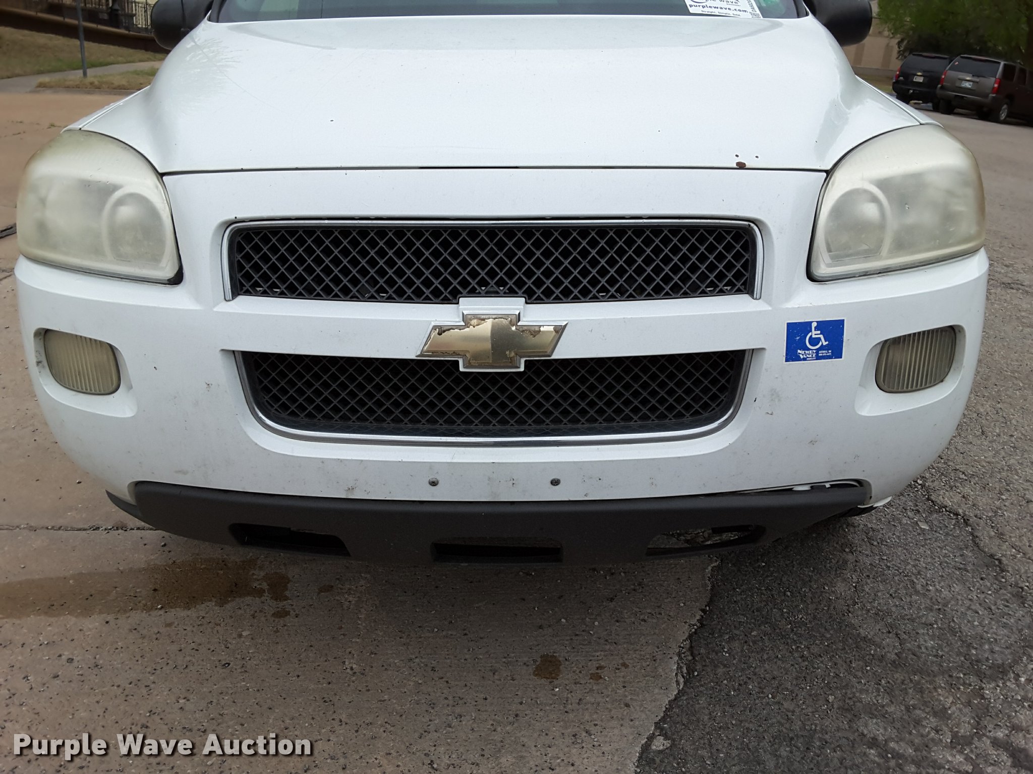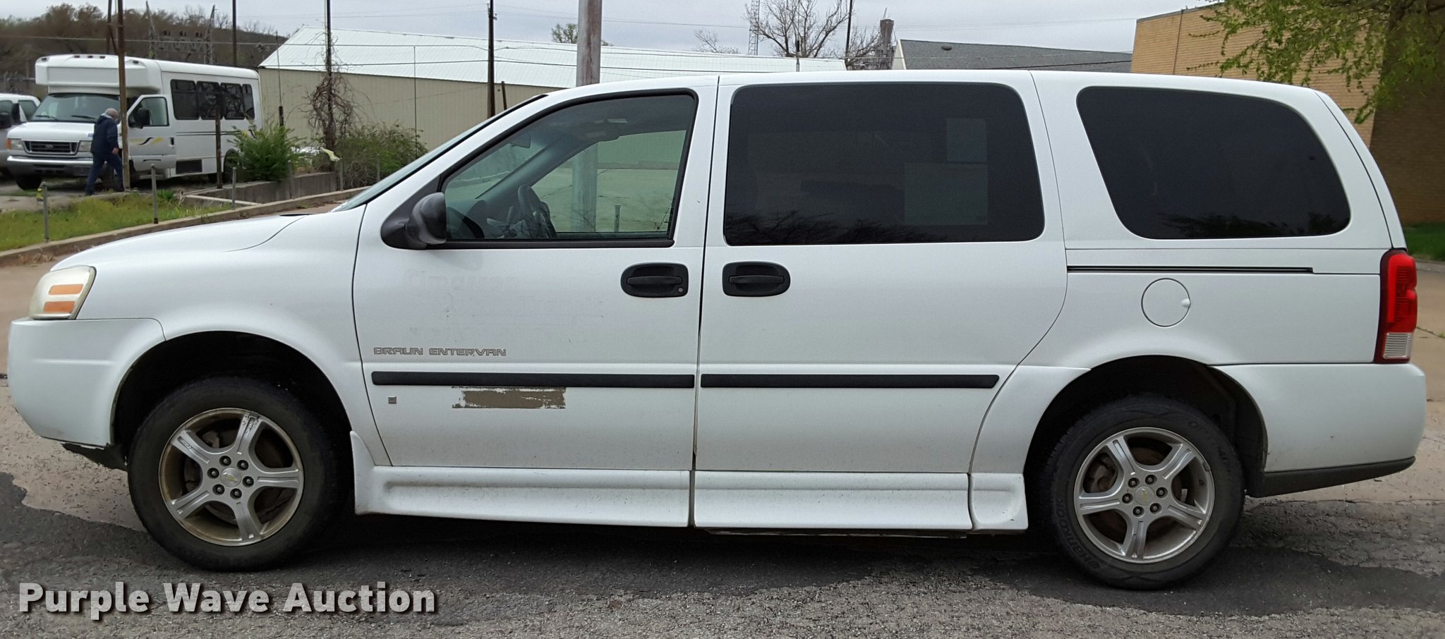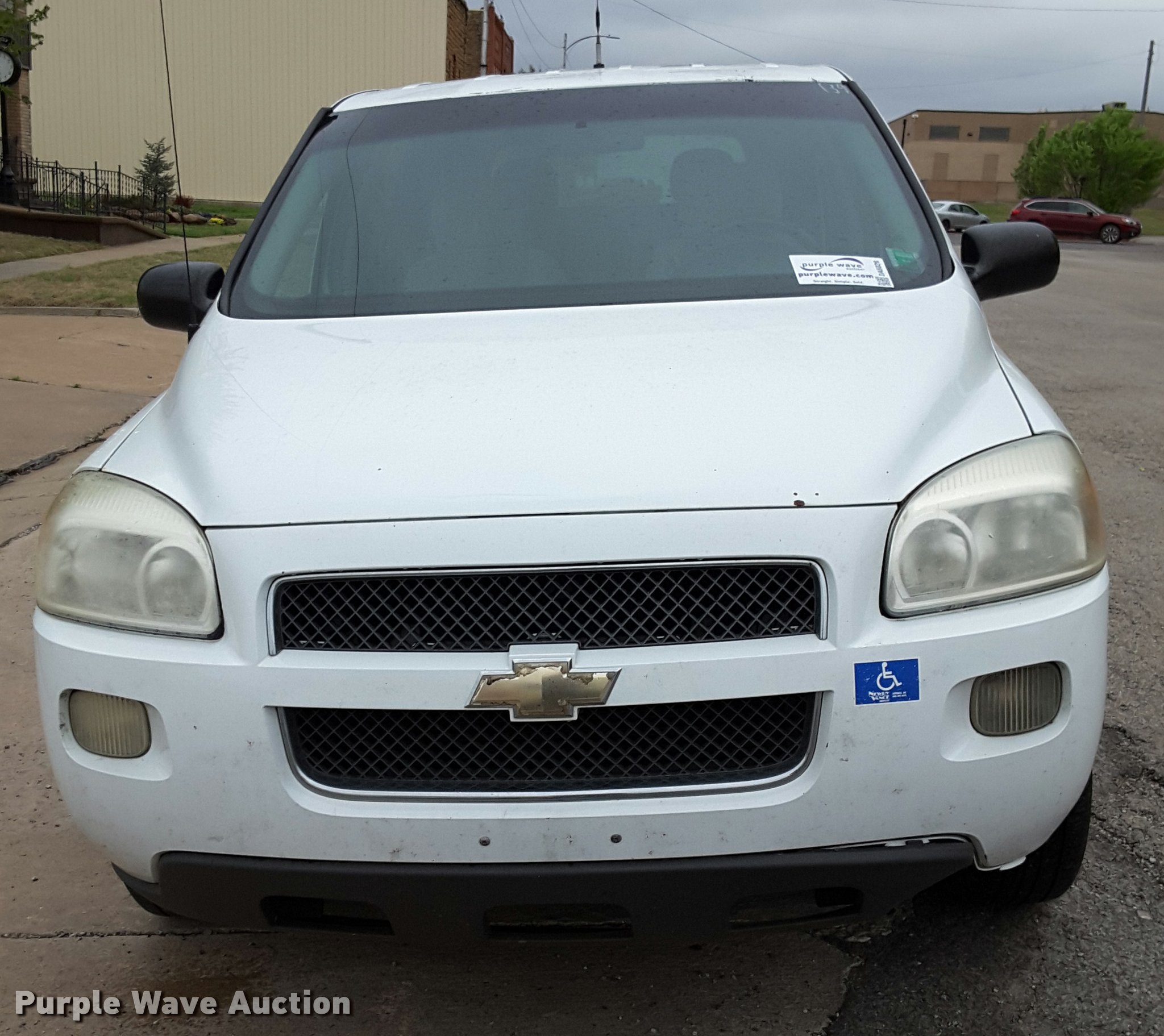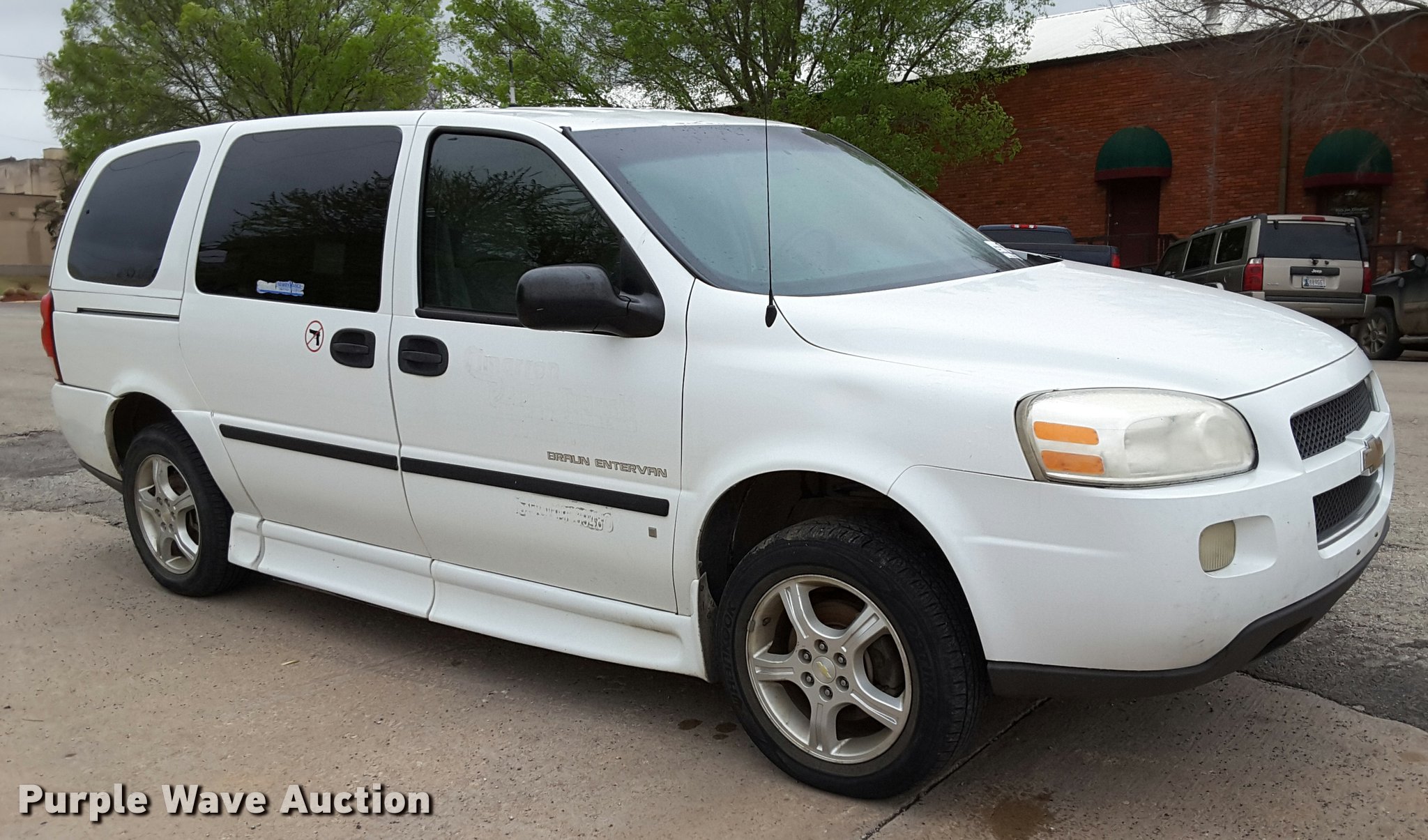 Purple Wave is selling a used Passenger Vehicle in Oklahoma. This item is a 2007 Chevrolet Uplander Cargo van with the following: 257,017 miles on odometer, 3.9L V6 DOHC 24V gas engine, Automatic transmission, AC and heat, Tilt, Cruise, AM/FM/CD, Power windows, locks, and mirrors, Cloth interior, Braun Enter Van conversion, Manual wheelchair ramp, Wheelchair tie downs, 225/60R17 tires