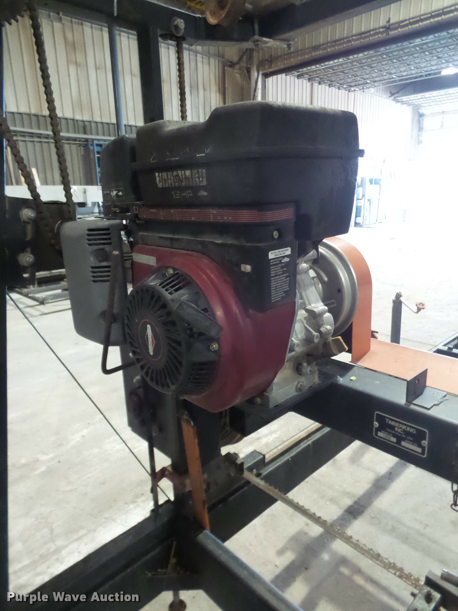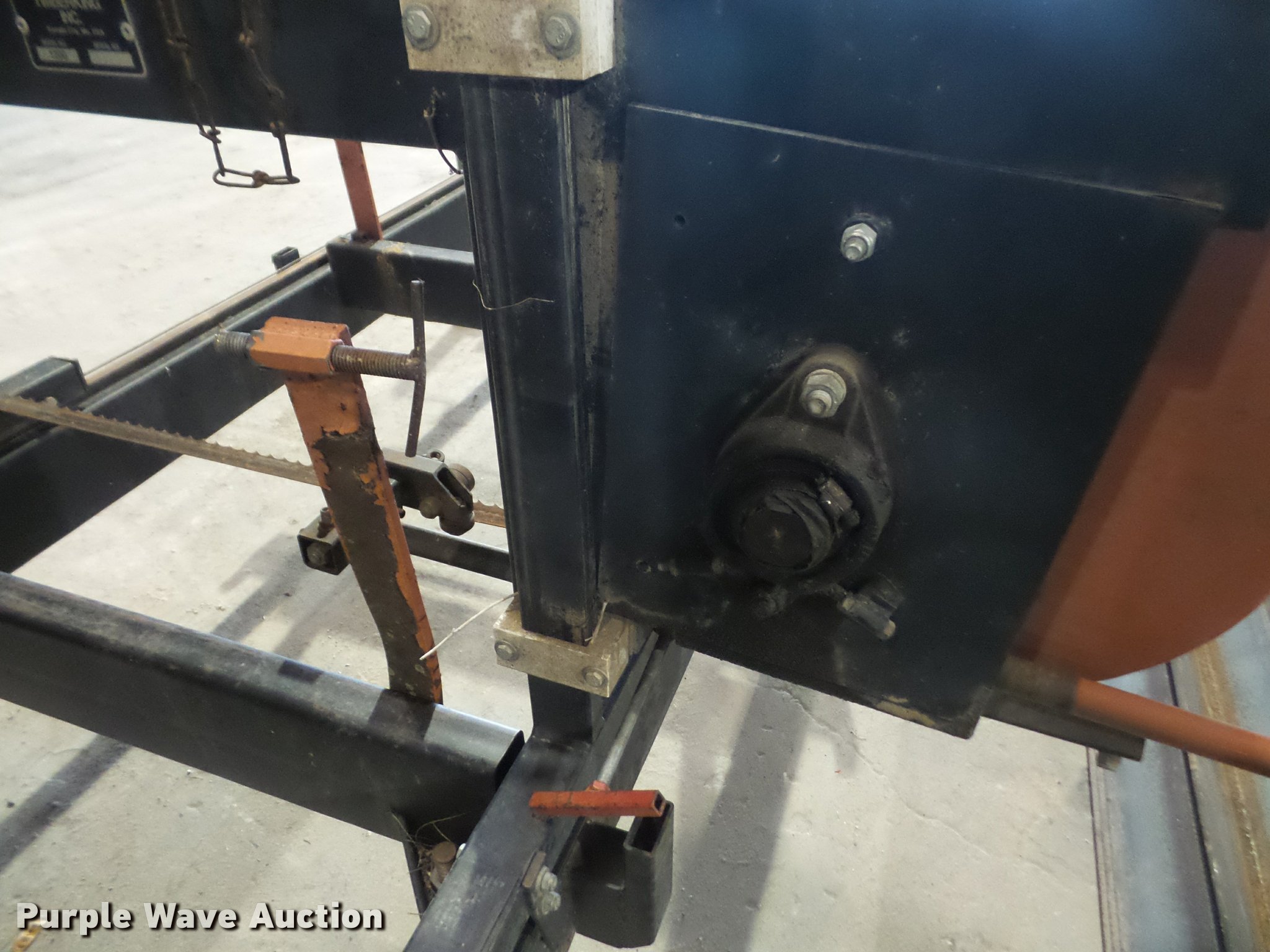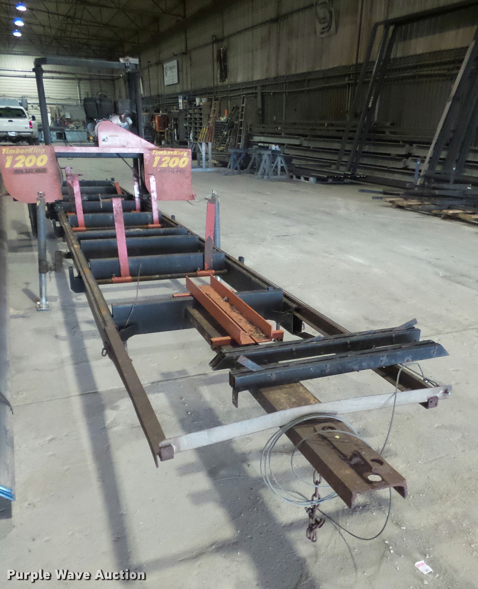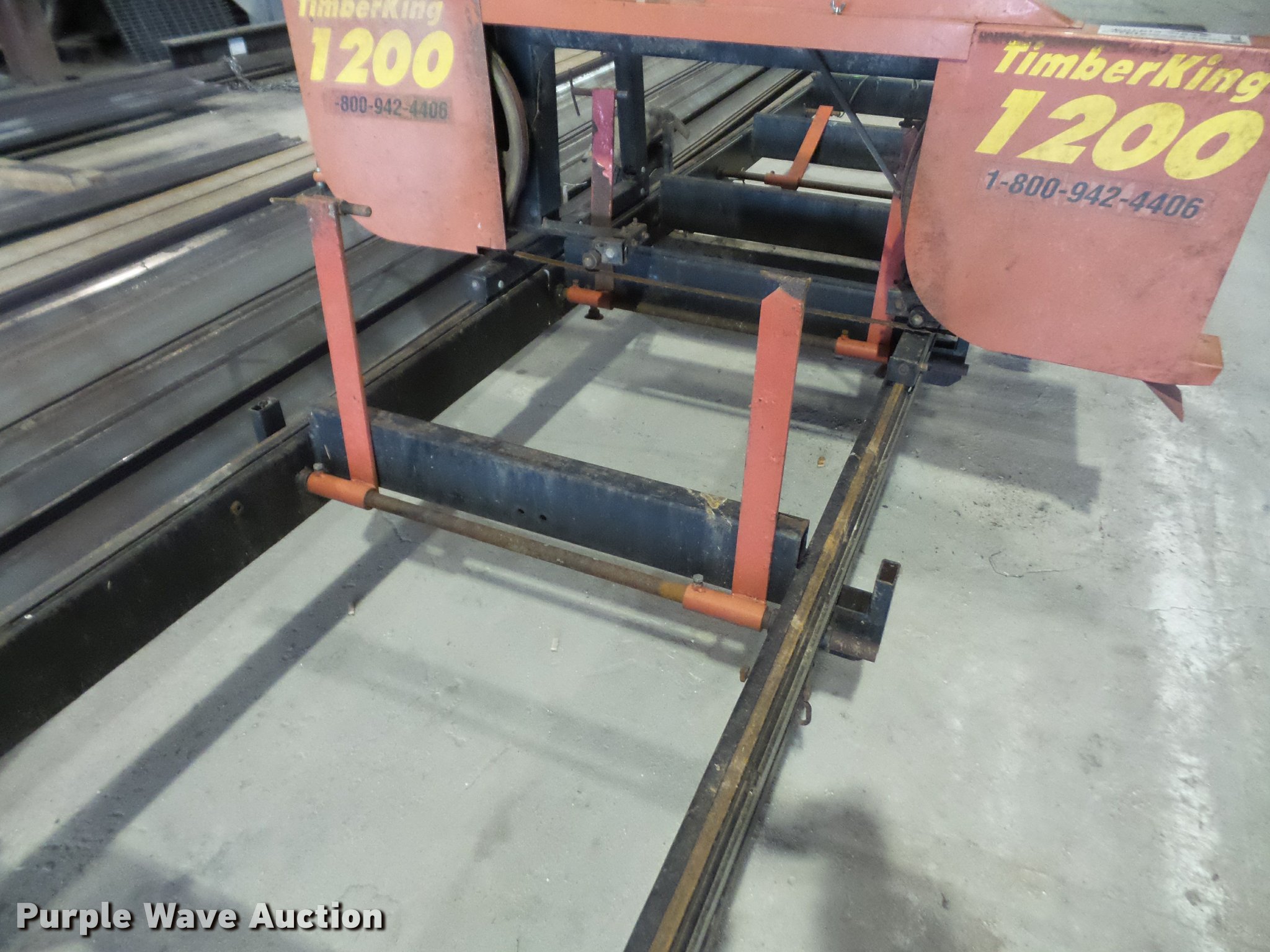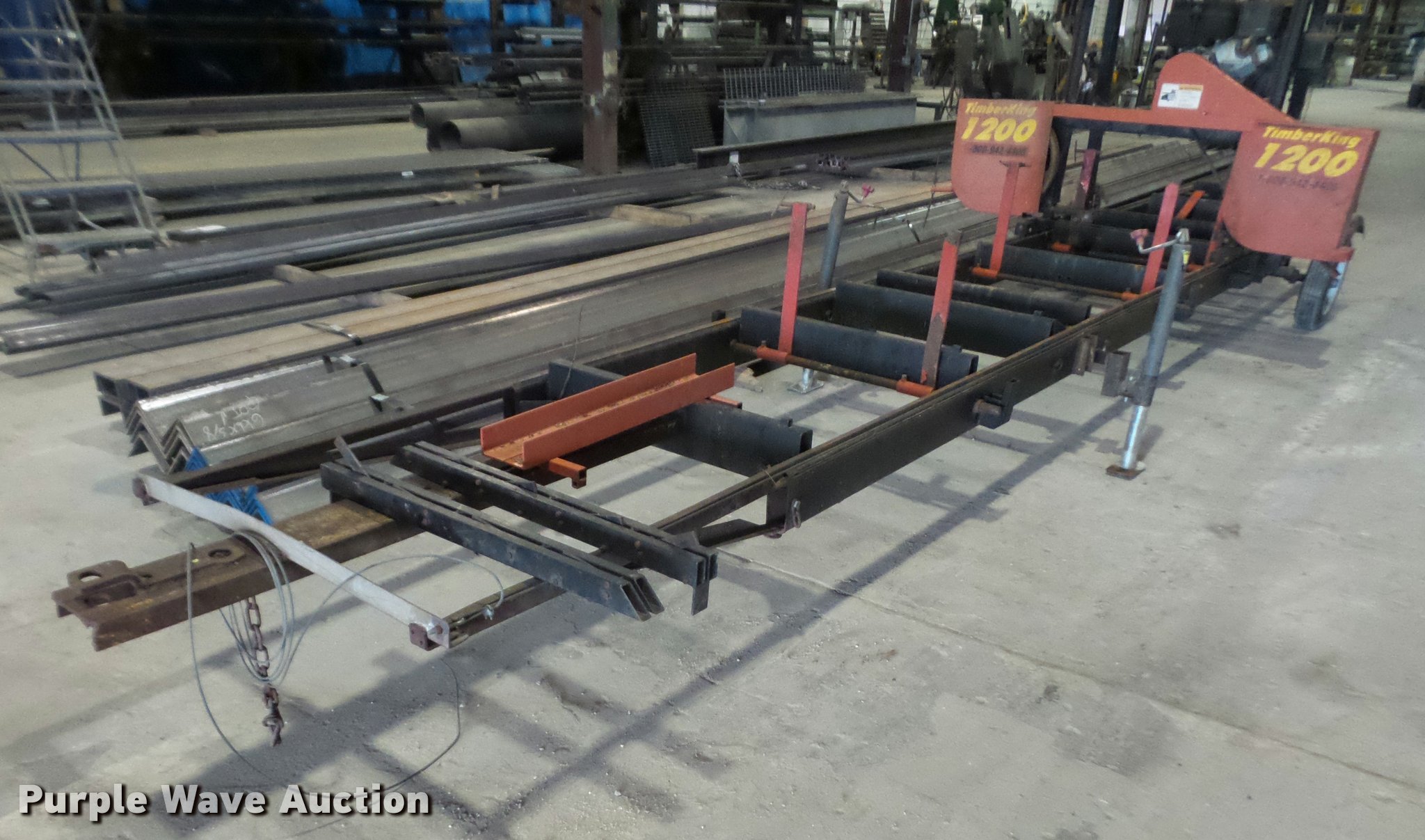 Purple Wave is selling a used Sawmill in Kansas. This item is a Timberking 1200 saw mill with the following: Vanguard 13 HP gas engine, 24'L, Manual operation, Pin hitch, 4.00-12 tires, Serial 1162
