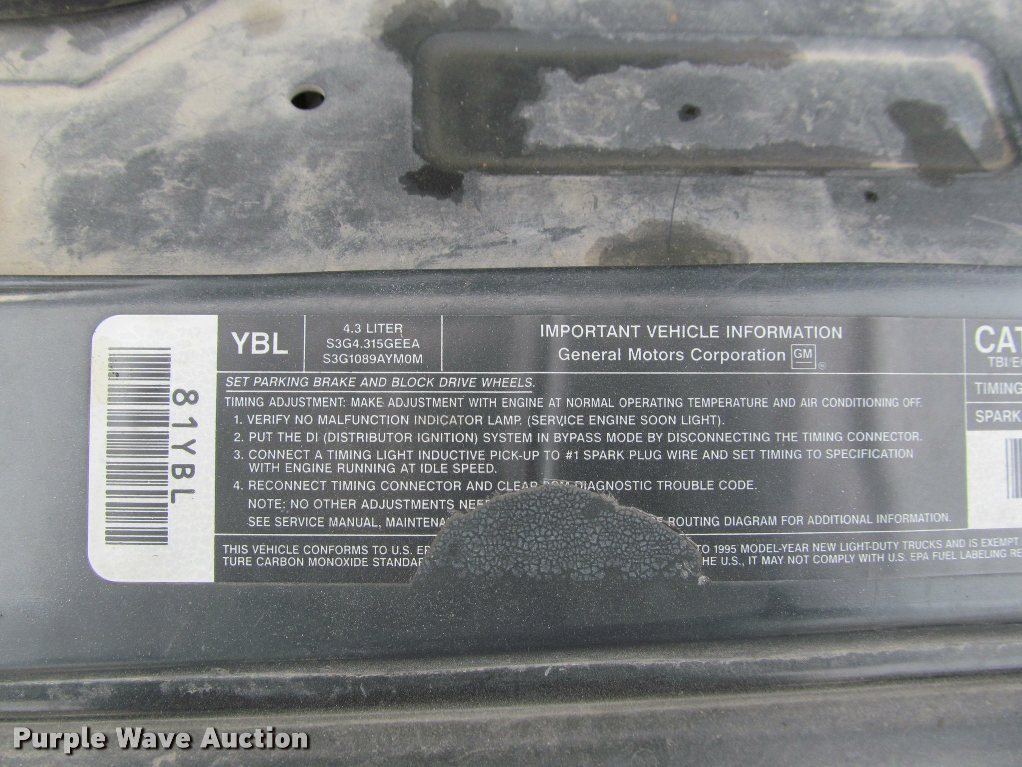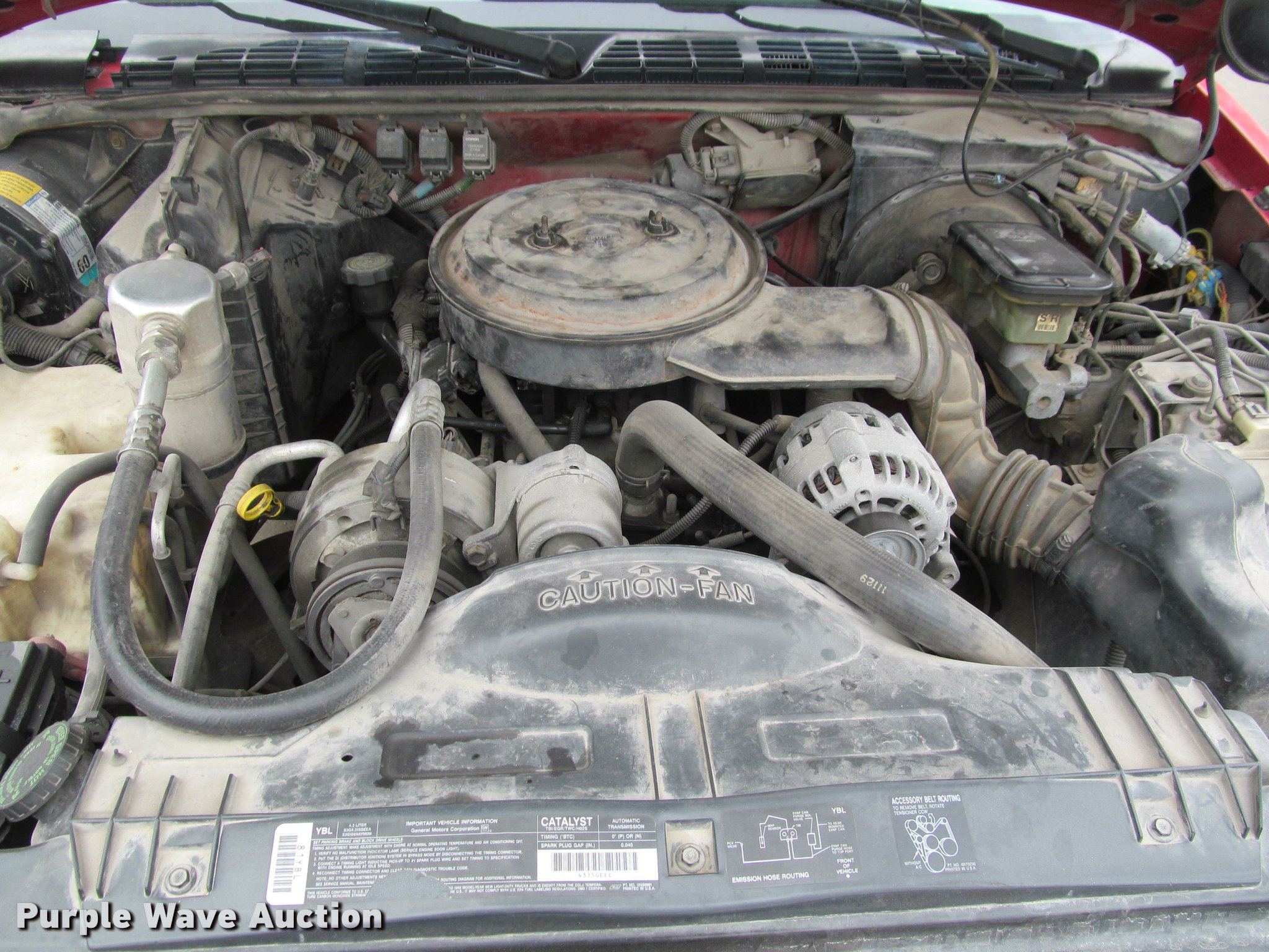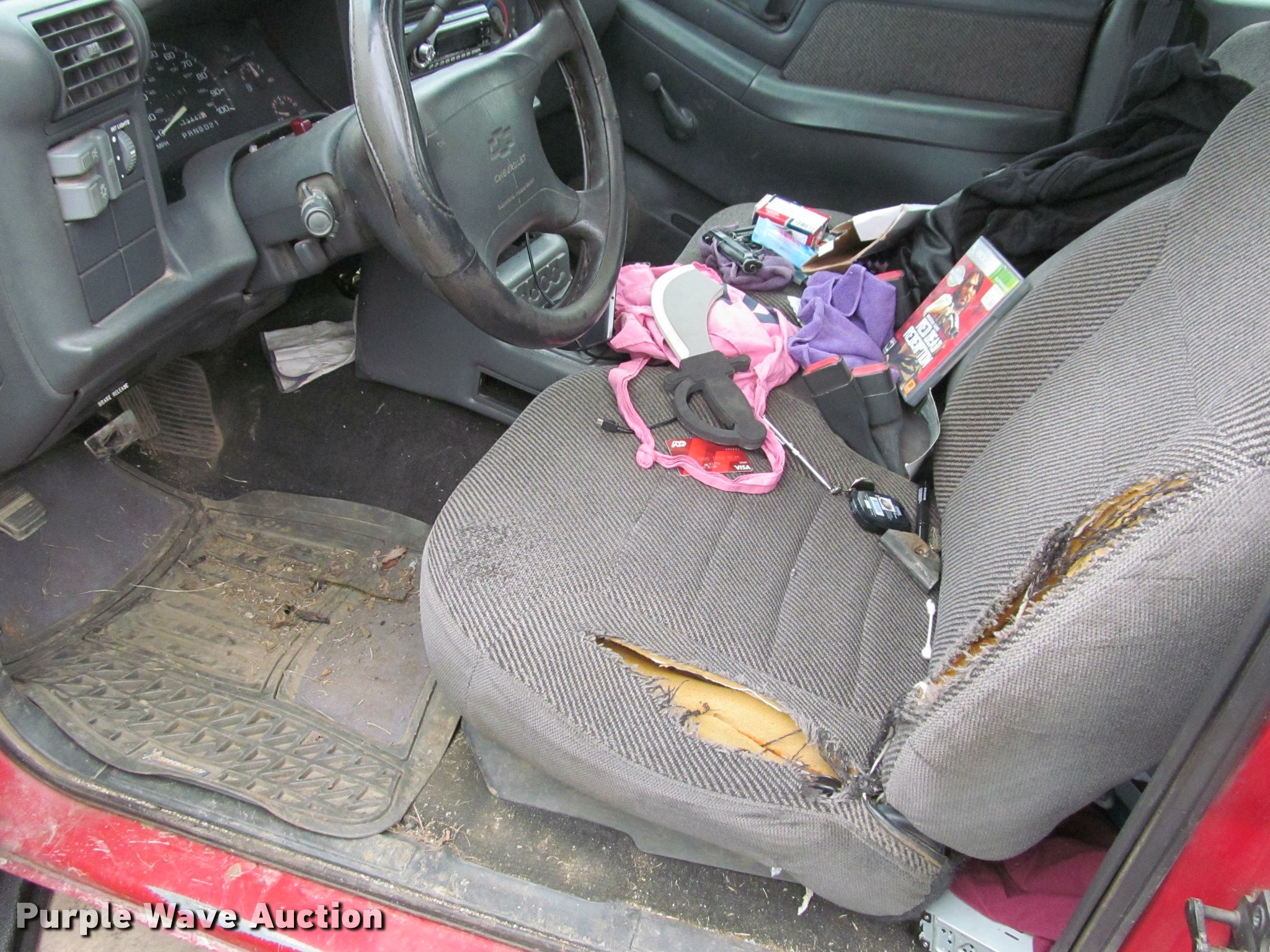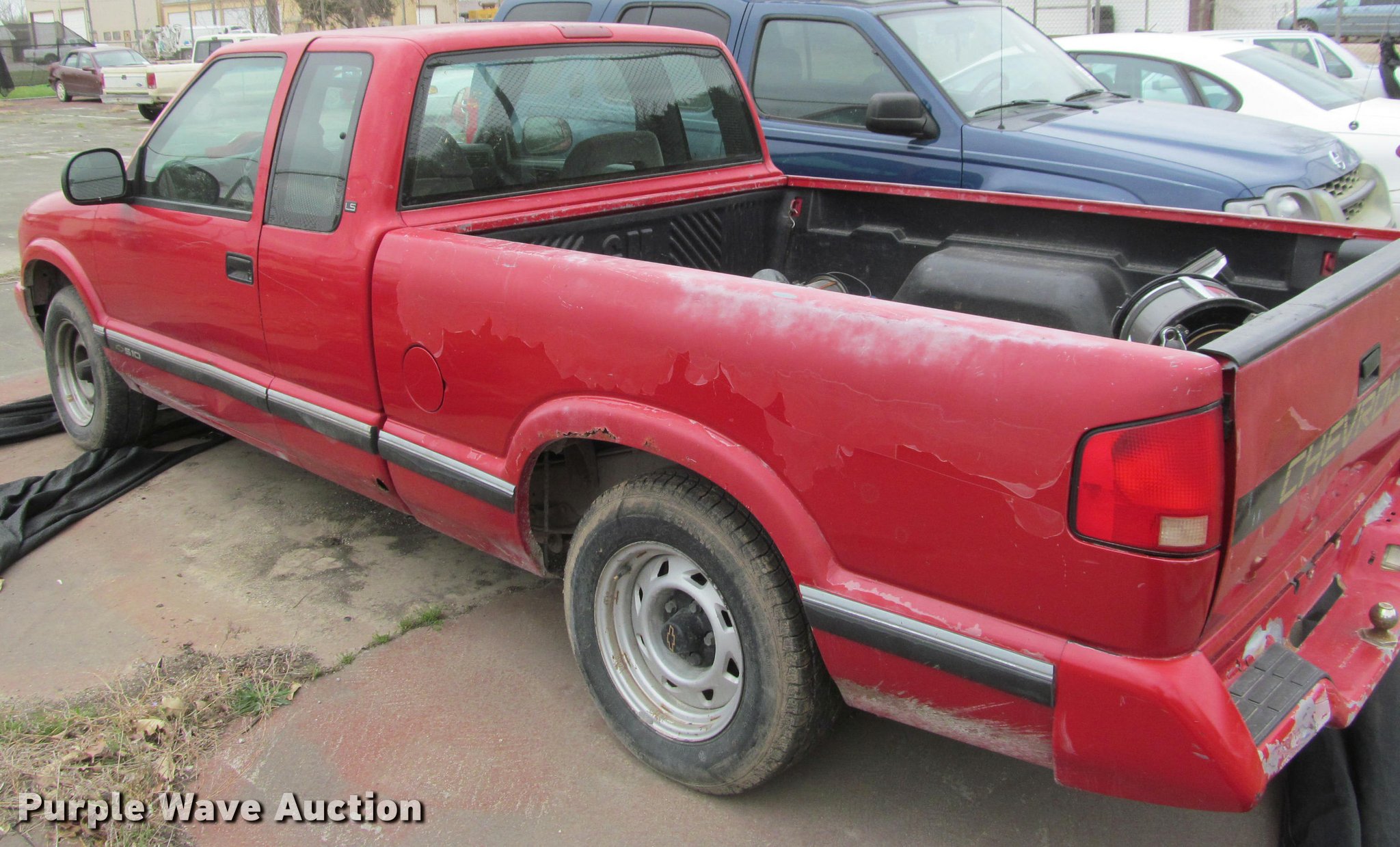 Purple Wave is selling a used Compact Pickup or Van in Kansas. This item is a 1995 Chevrolet S10 pickup truck with the following: 173,442 miles on odometer, 4.3L V6 OHV 12V gas engine, Automatic transmission, AC and heat, Tilt, Cruise, Manual windows and locks, Cloth interior, 205/70R15 tires, Tires flat, Rust, Paint peeling, Dead battery, Unknown operating condition