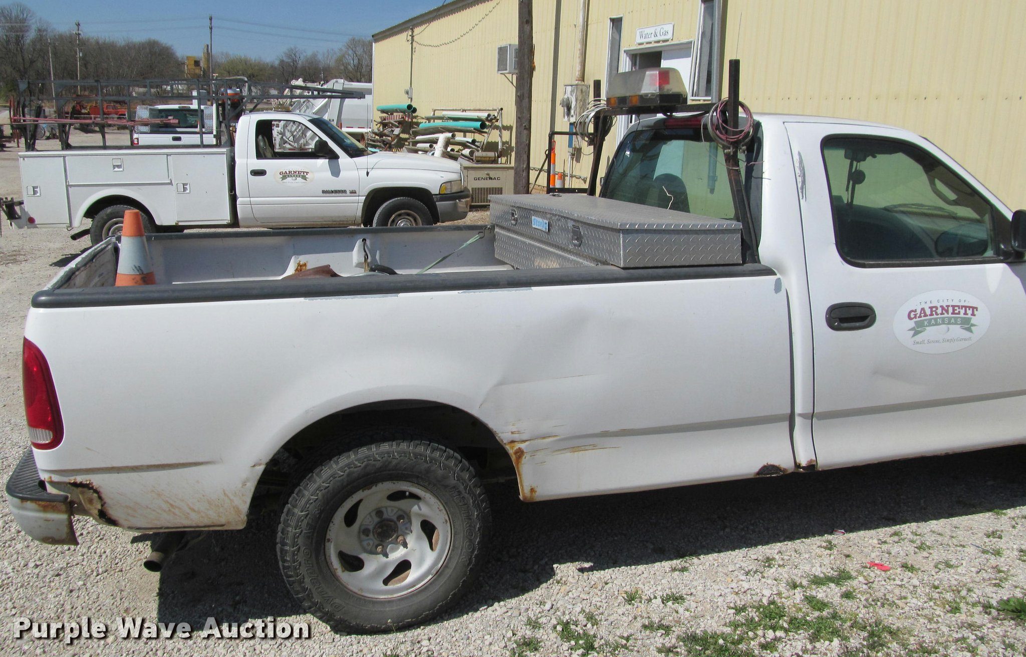 1999 Ford F150 pickup truck. Unknown miles on odometer, 4.2L V6 OHV 12V gas engine, Automatic transmission, AC and heat, AM/FM, Manual windows and locks, Vinyl interior, Long bed , Toolbox, Headache rack, Receiver hitch, Trailer wiring, 245/75R16 front tires, 255/70R16 rear tires, Non-operational engine, Seat damaged, Rust, Battery dead. Kansas title. 1FTZF1722XKC04803. City of Garnett. 831 S Oak St. Garnett, KS 66032